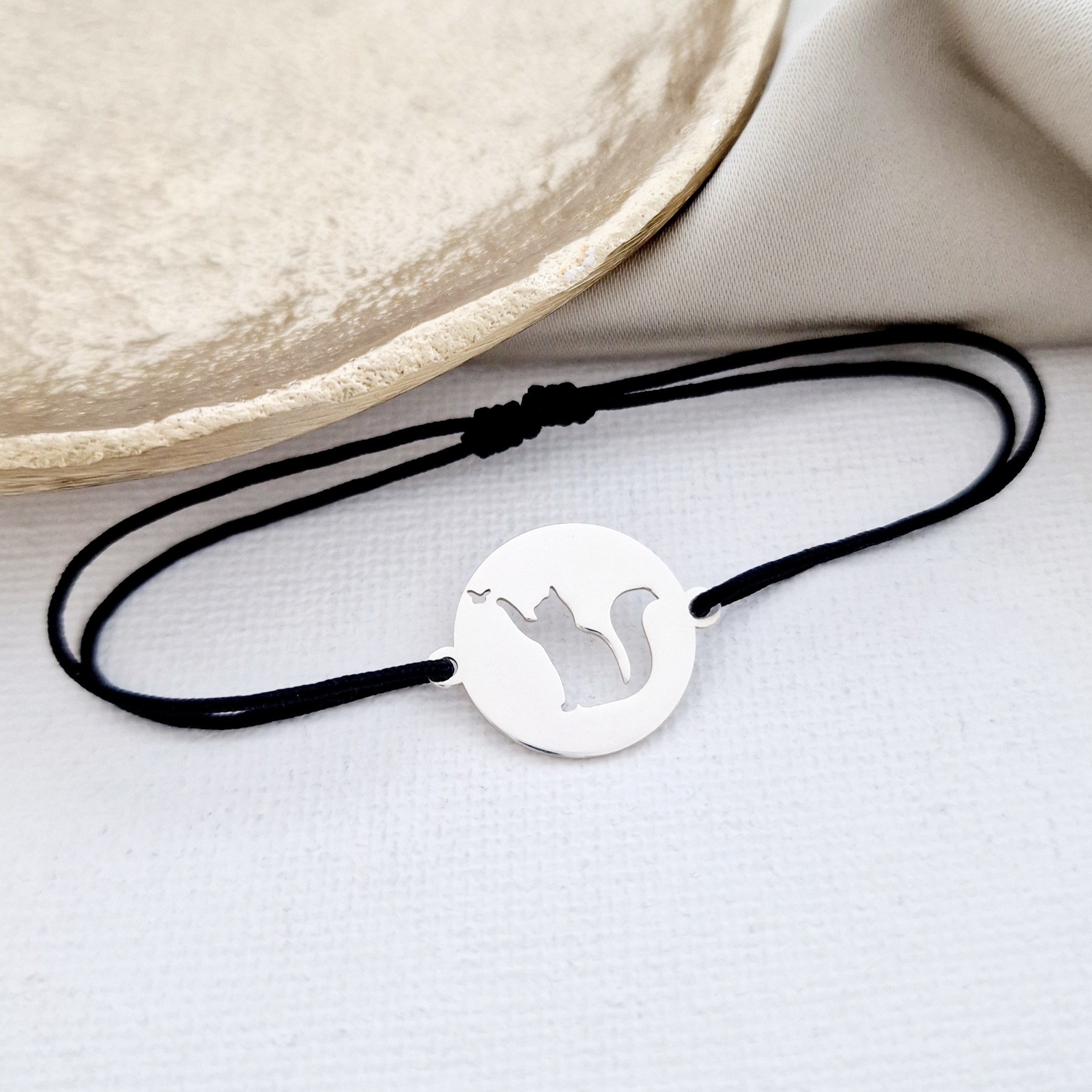 Bratara Pisica decupata - Argint 925, snur reglabil
