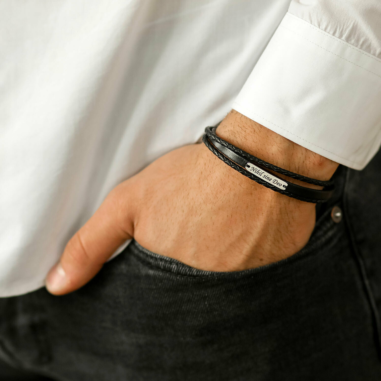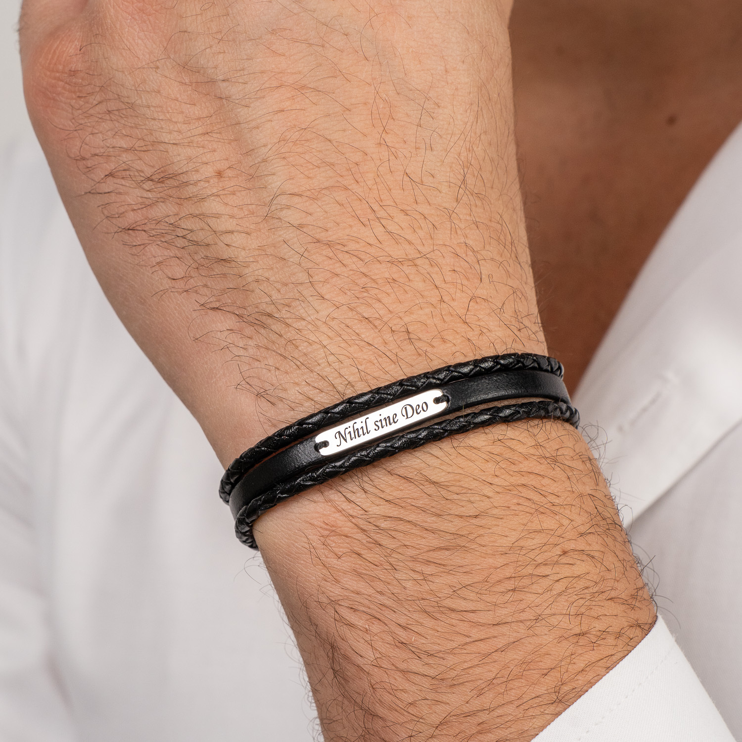 Alege un cadou perfect pentru un tata, prieten, iubit sau sot. Bratara este realizata cu 3 straturi de piele naturala: 2 laterale impletite si una in mijloc simpla pe care este cusuta o placuta personalizata cu un nume sau un mesaj semnificativ. Inchizatoarea din otel inoxidabil aduce tot aspectul bratarii impreuna.