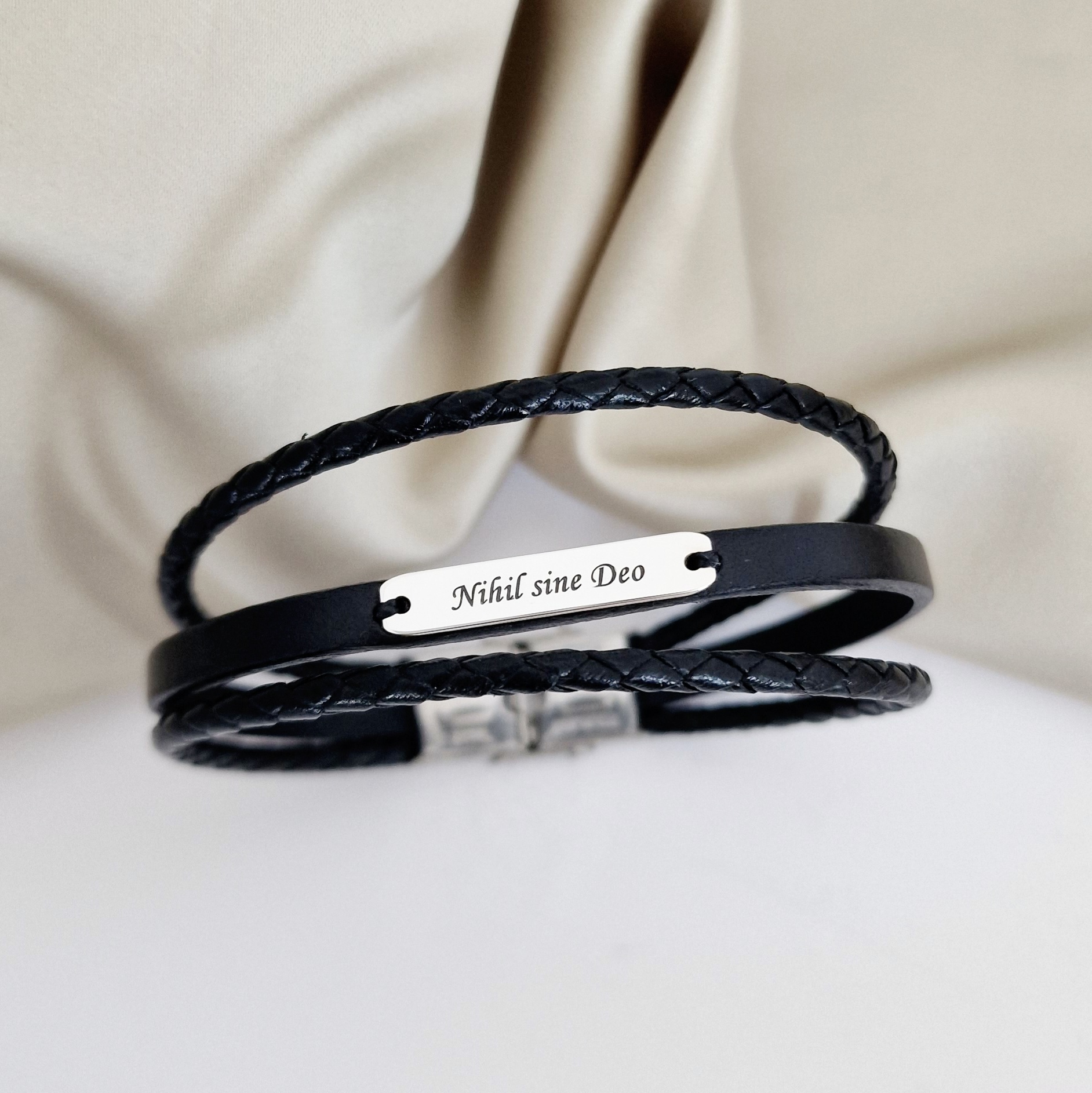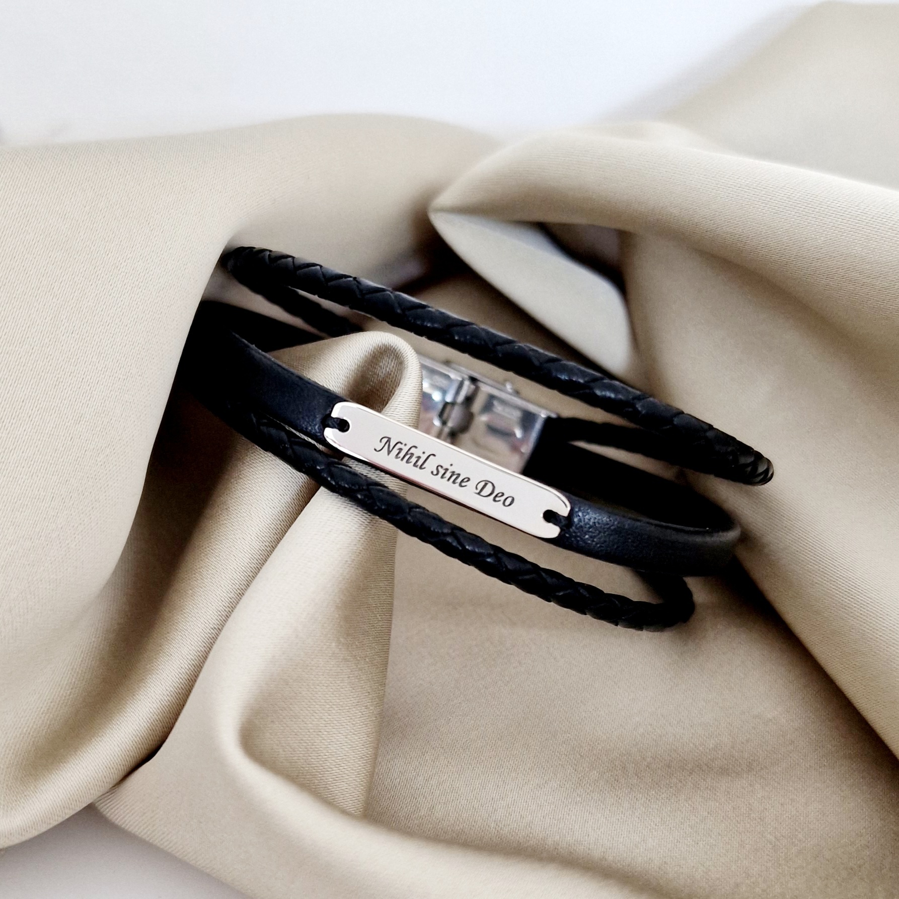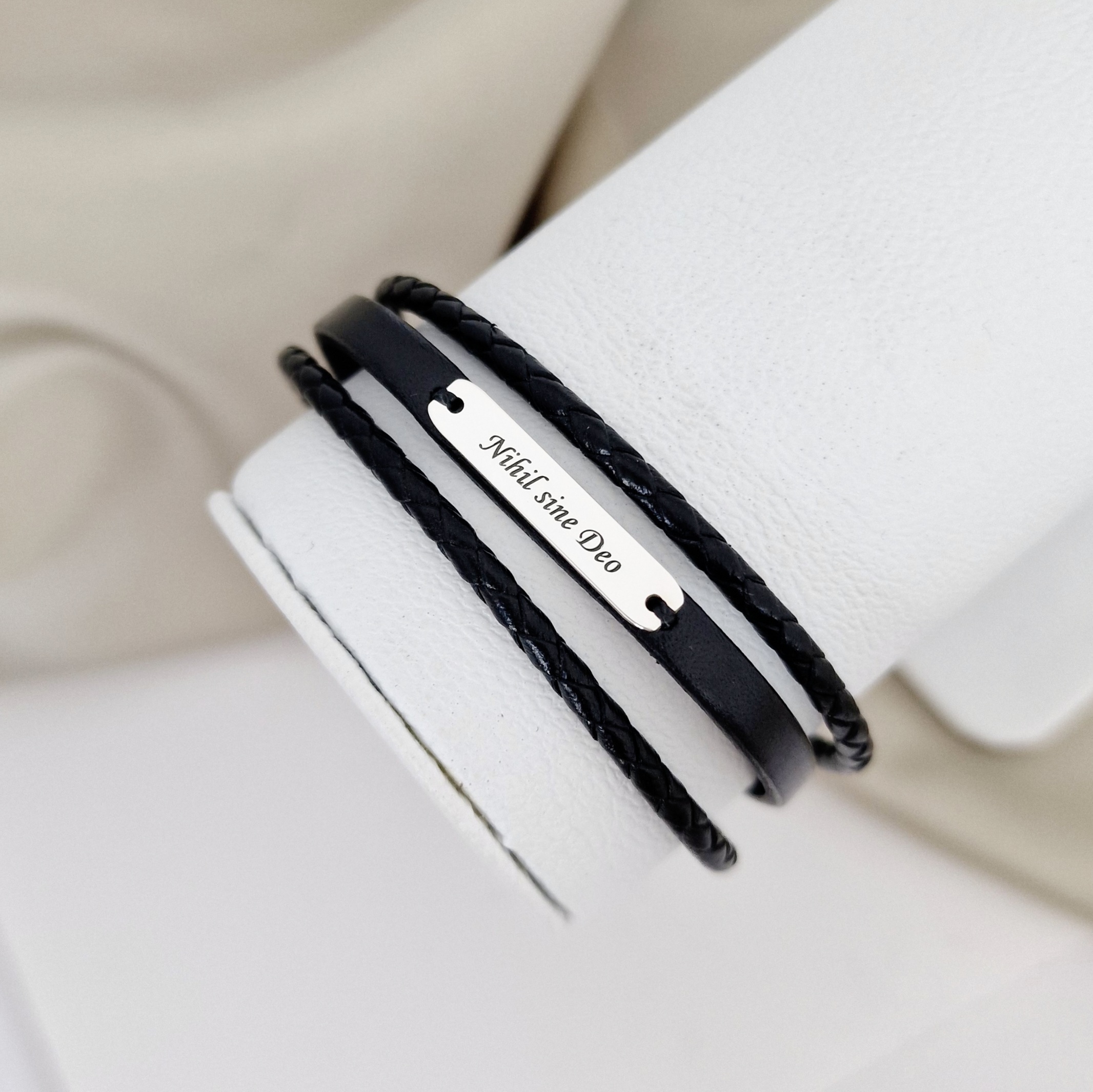 Bratara barbateasca cu 3 straturi de piele naturala neagra - Placuta cu gravura personalizata - Argint 925 - Inchizatoare clips inox