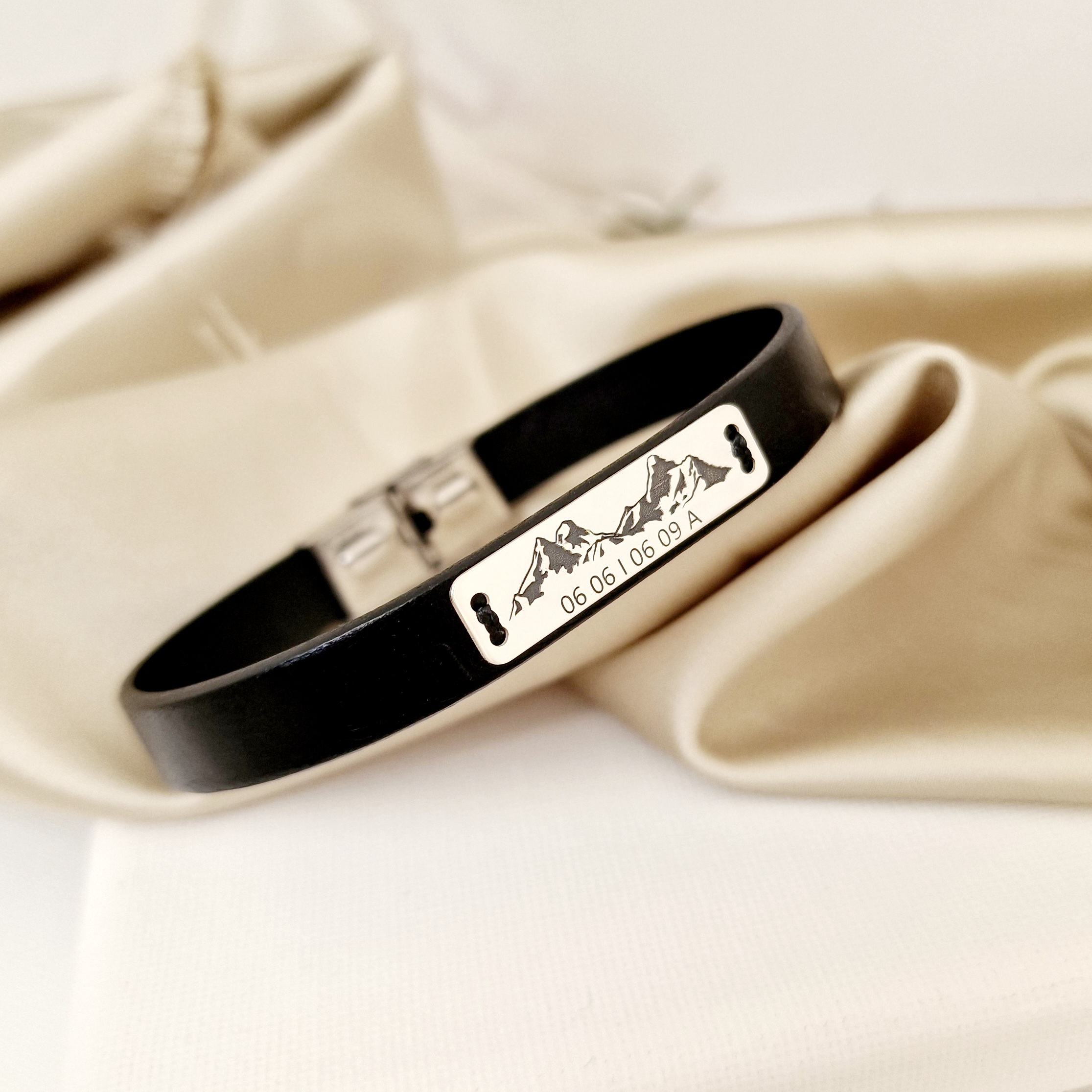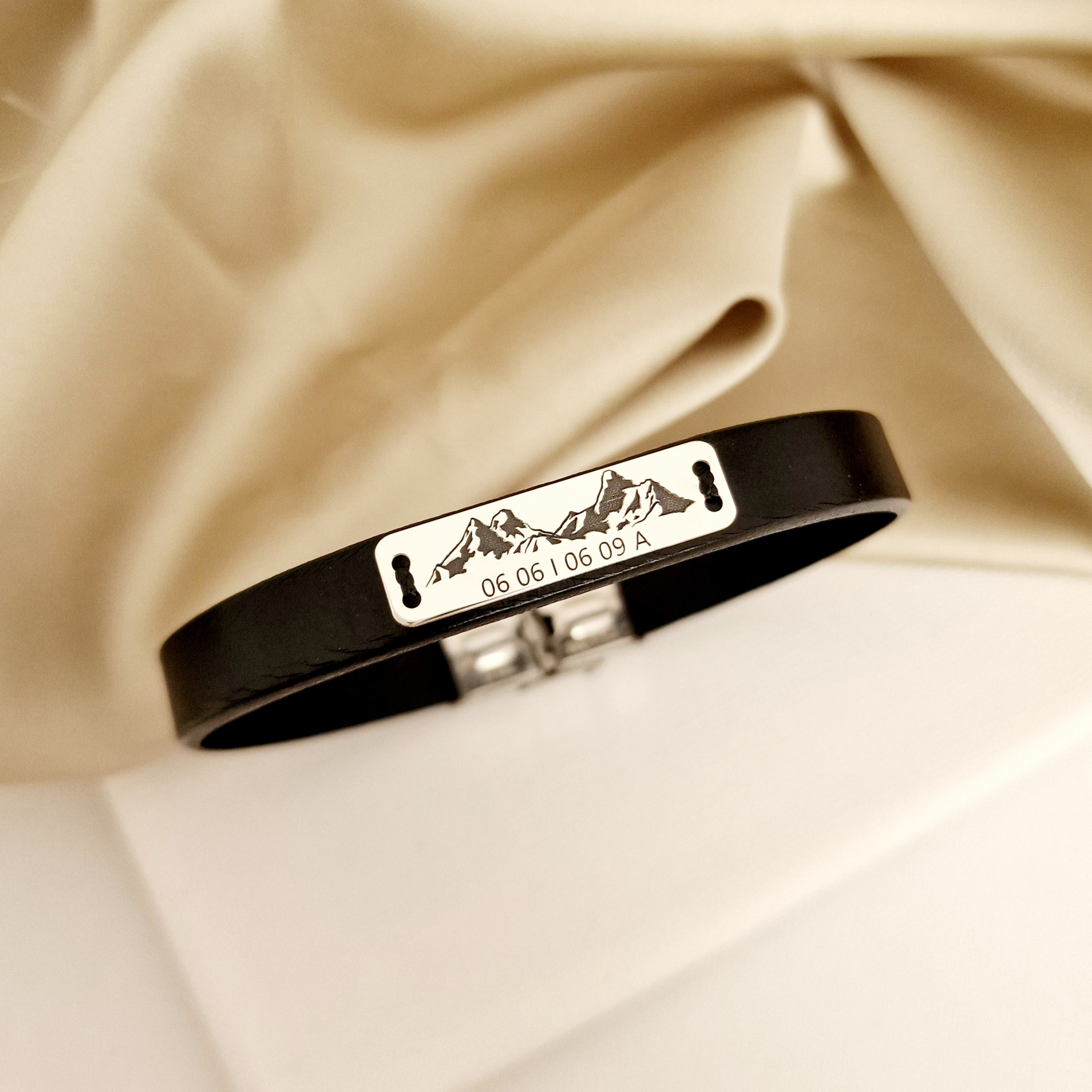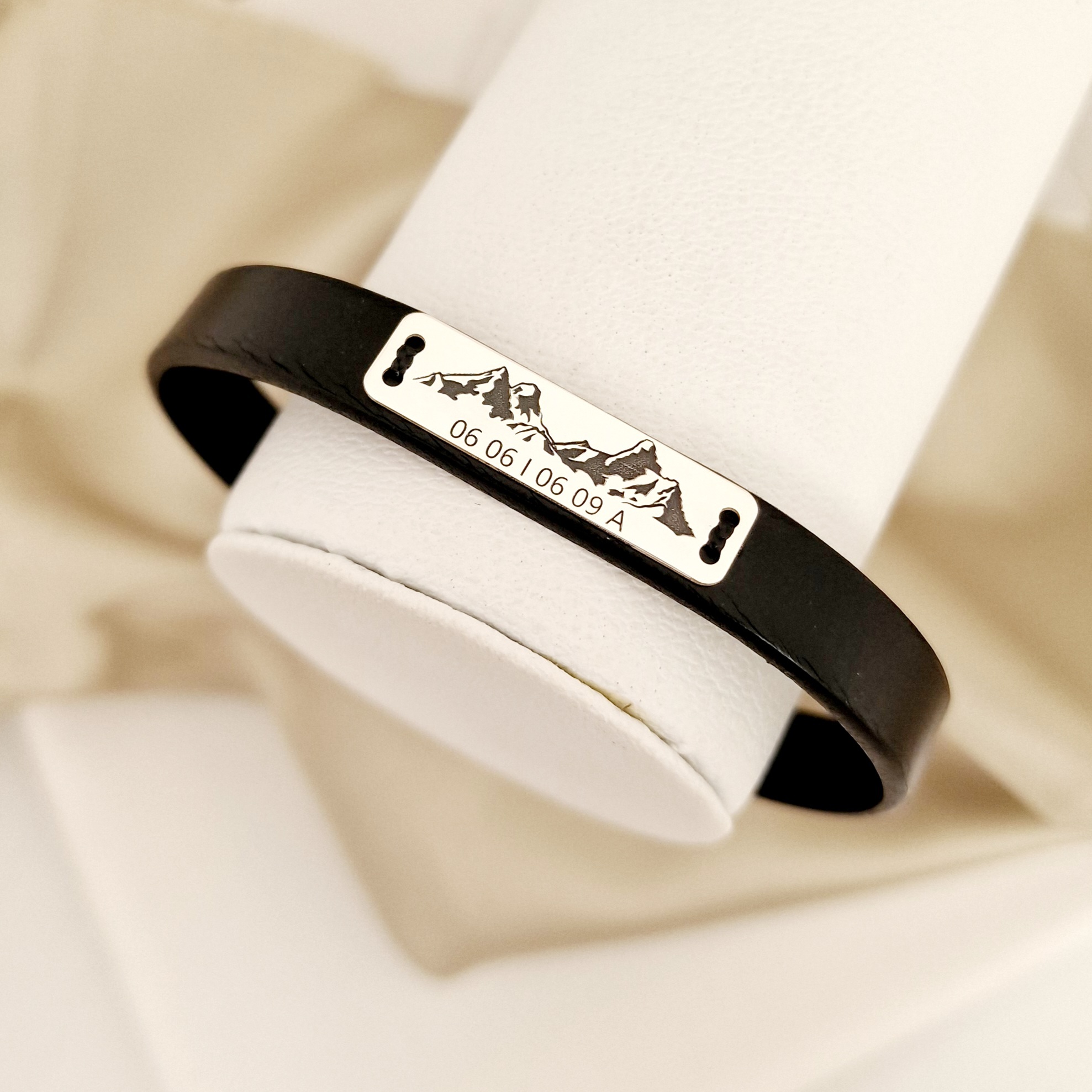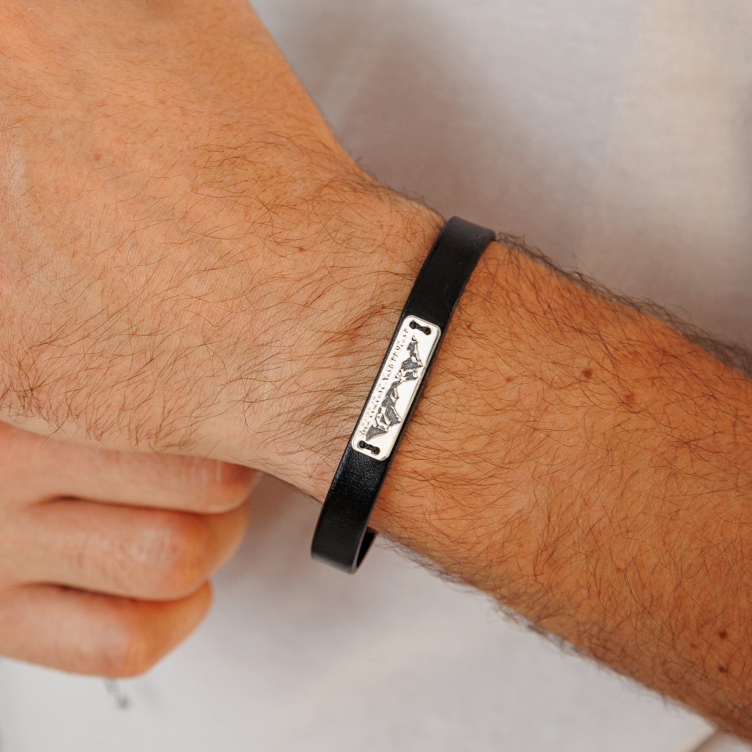 Bratara barbateasca cu piele - Placuta cu peisaj de munte si coordonate - Argint 925 - Inchizatoare clips inox