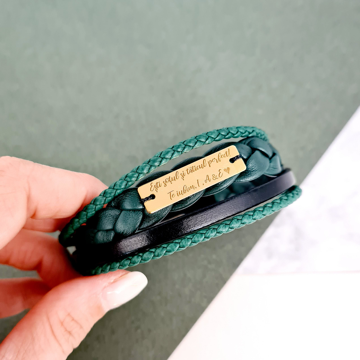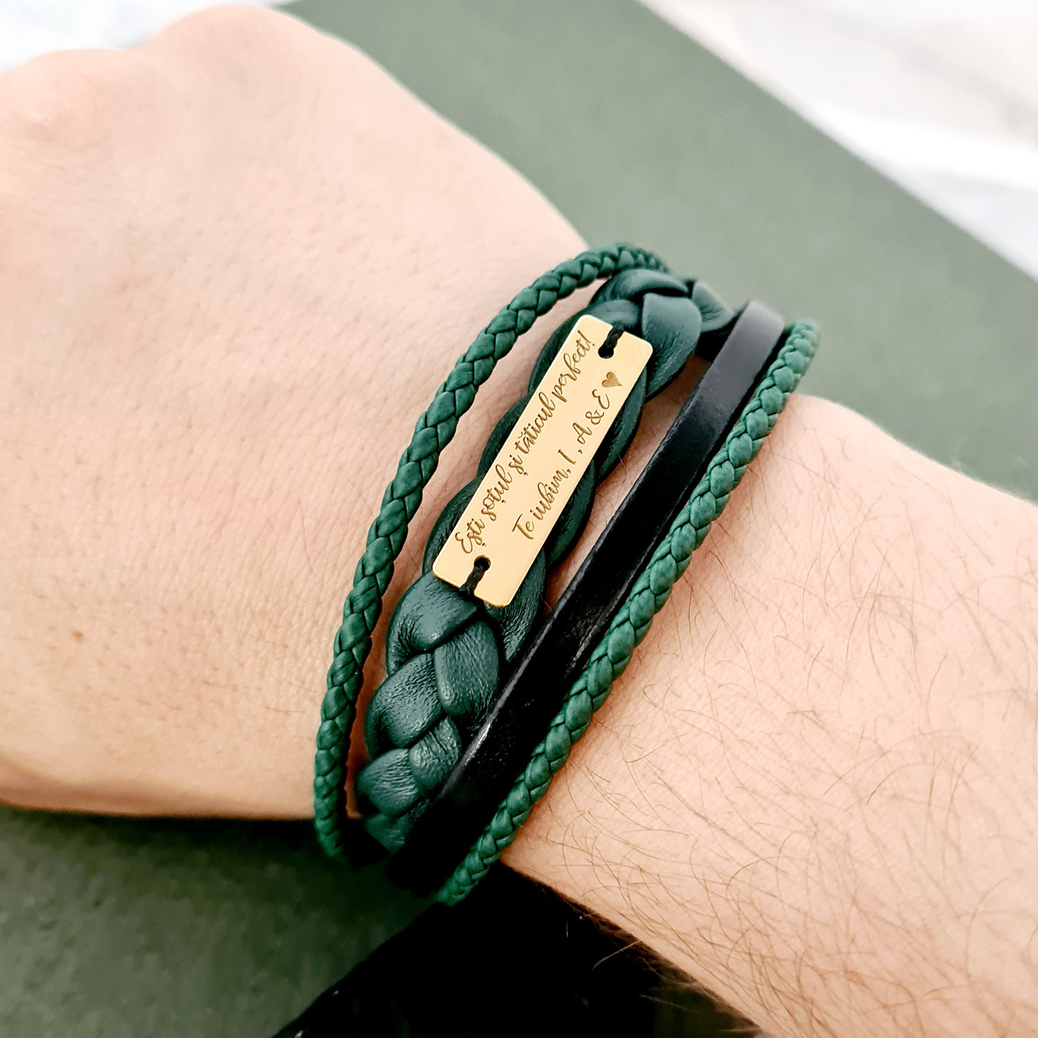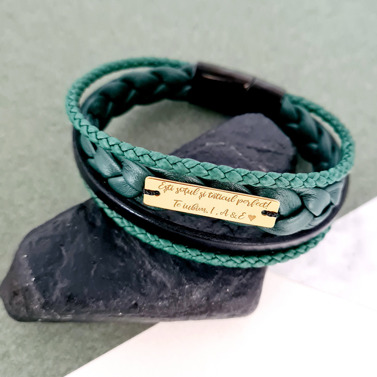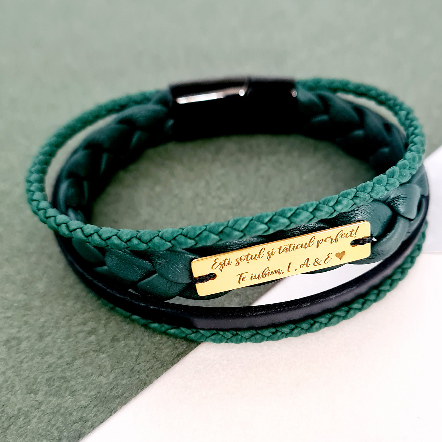 Bratara Fresh - Model barbatesc cu piele verde - Placuta cu gravura personalizata din Argint 925 placat cu Aur Galben 18K - Inchizatoare neagra inox