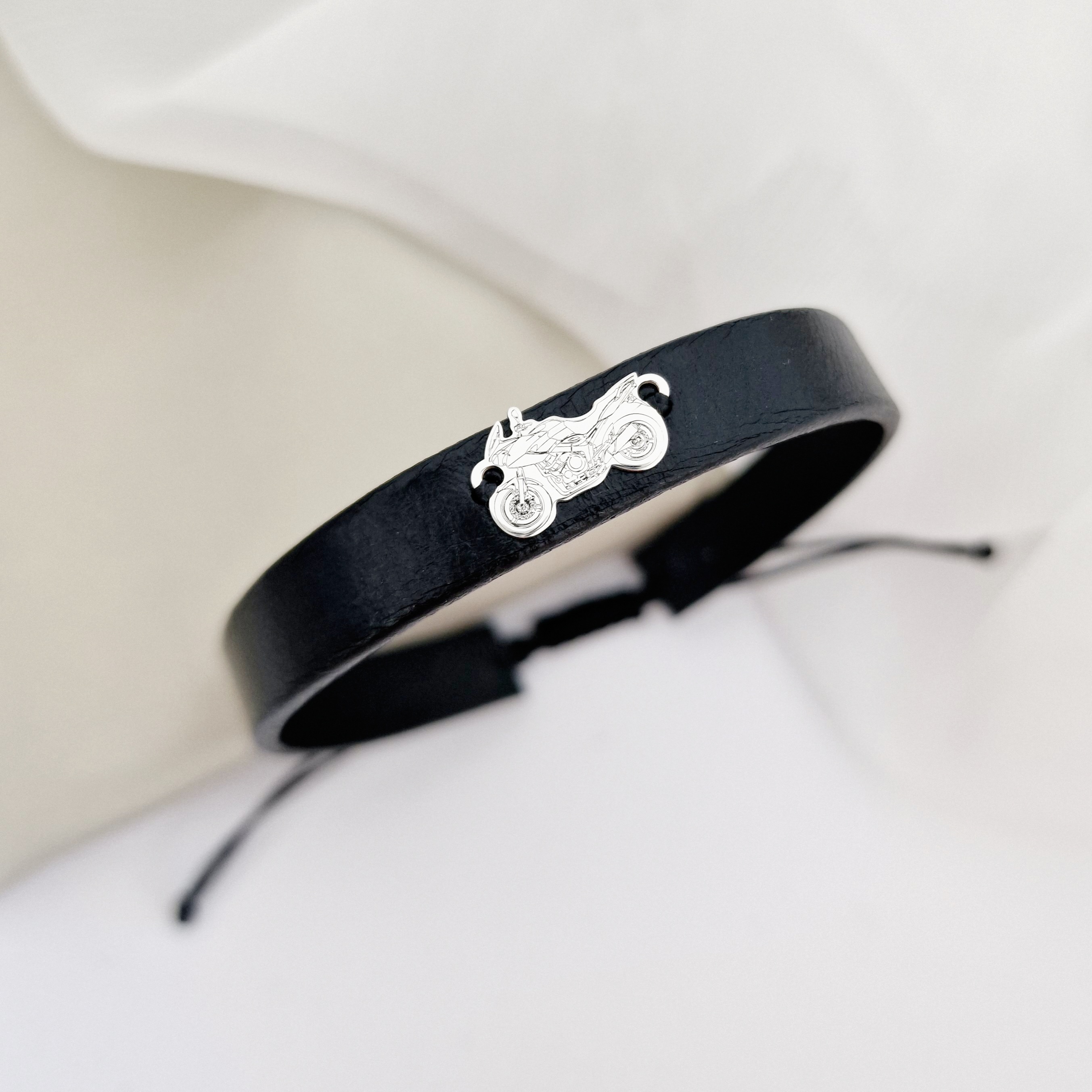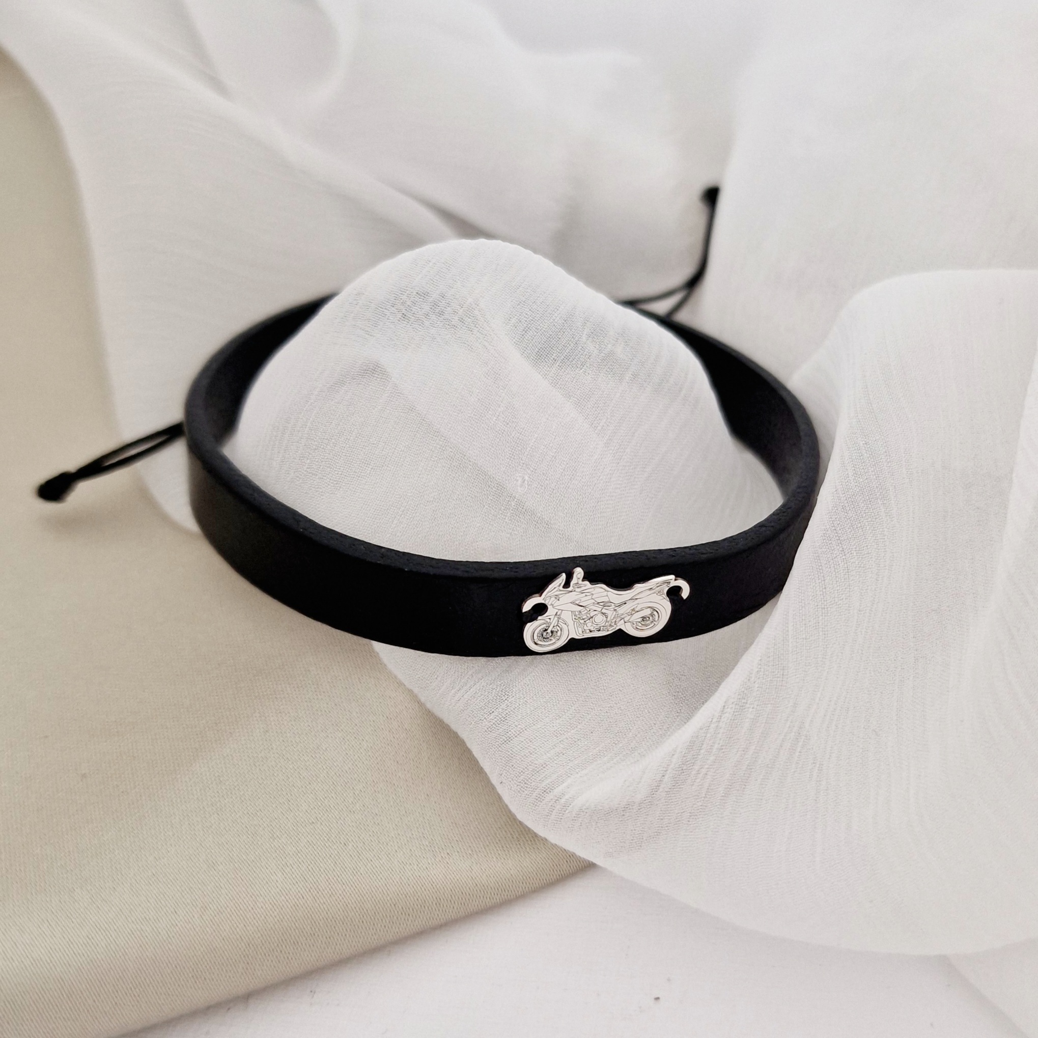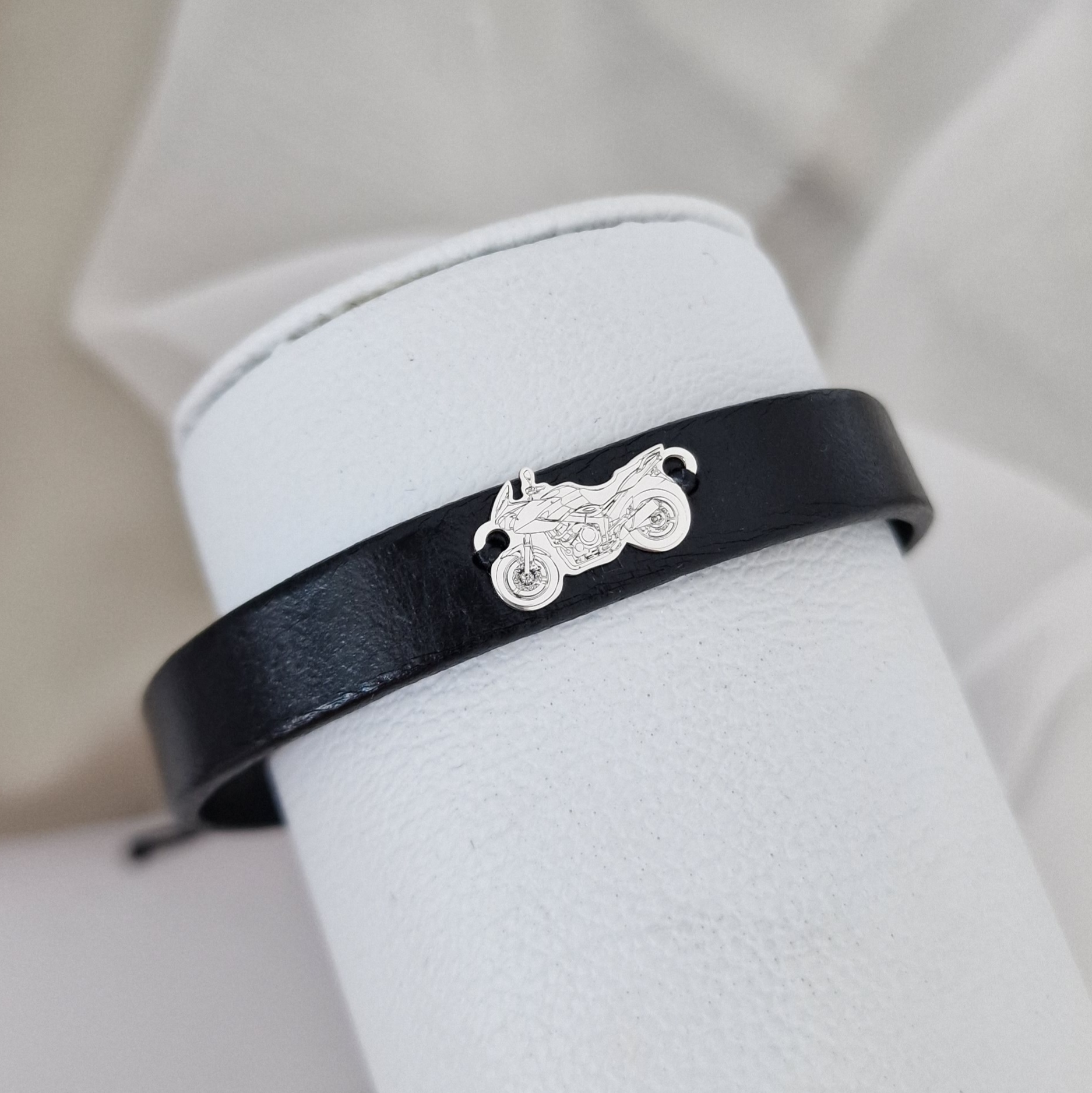 - Pandantul sub forma motocicleta este creat din Argint 925 si este prins de o bratara din piele.