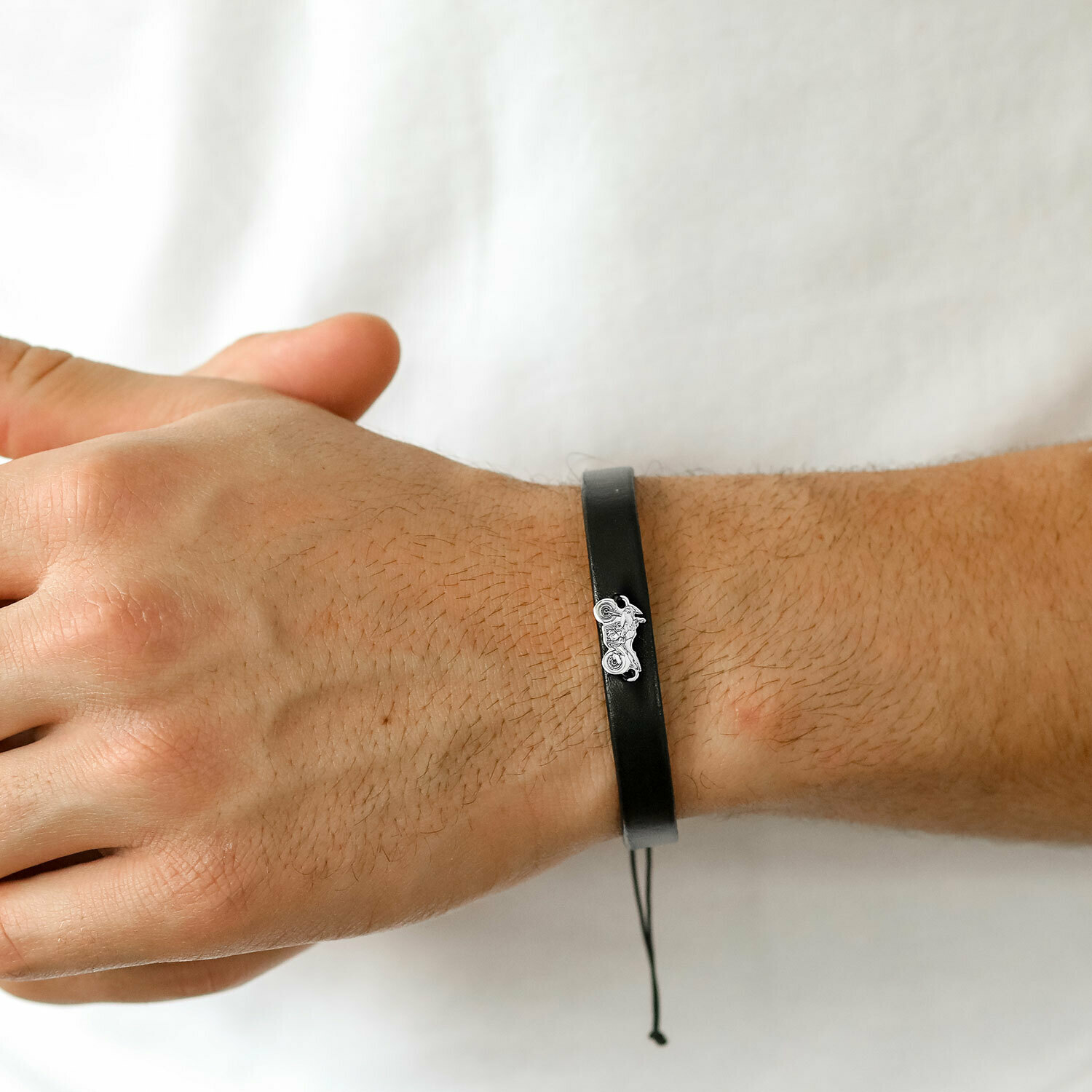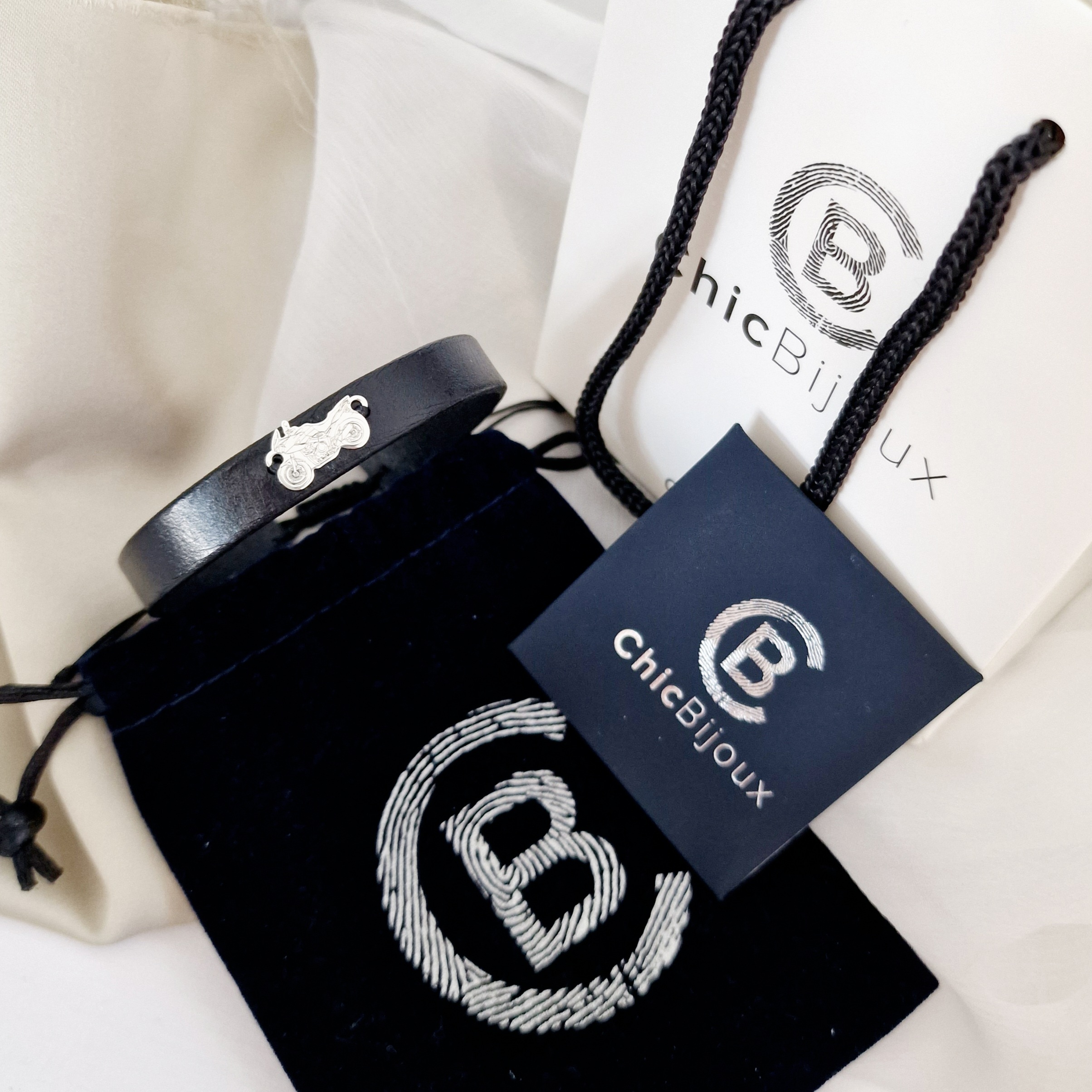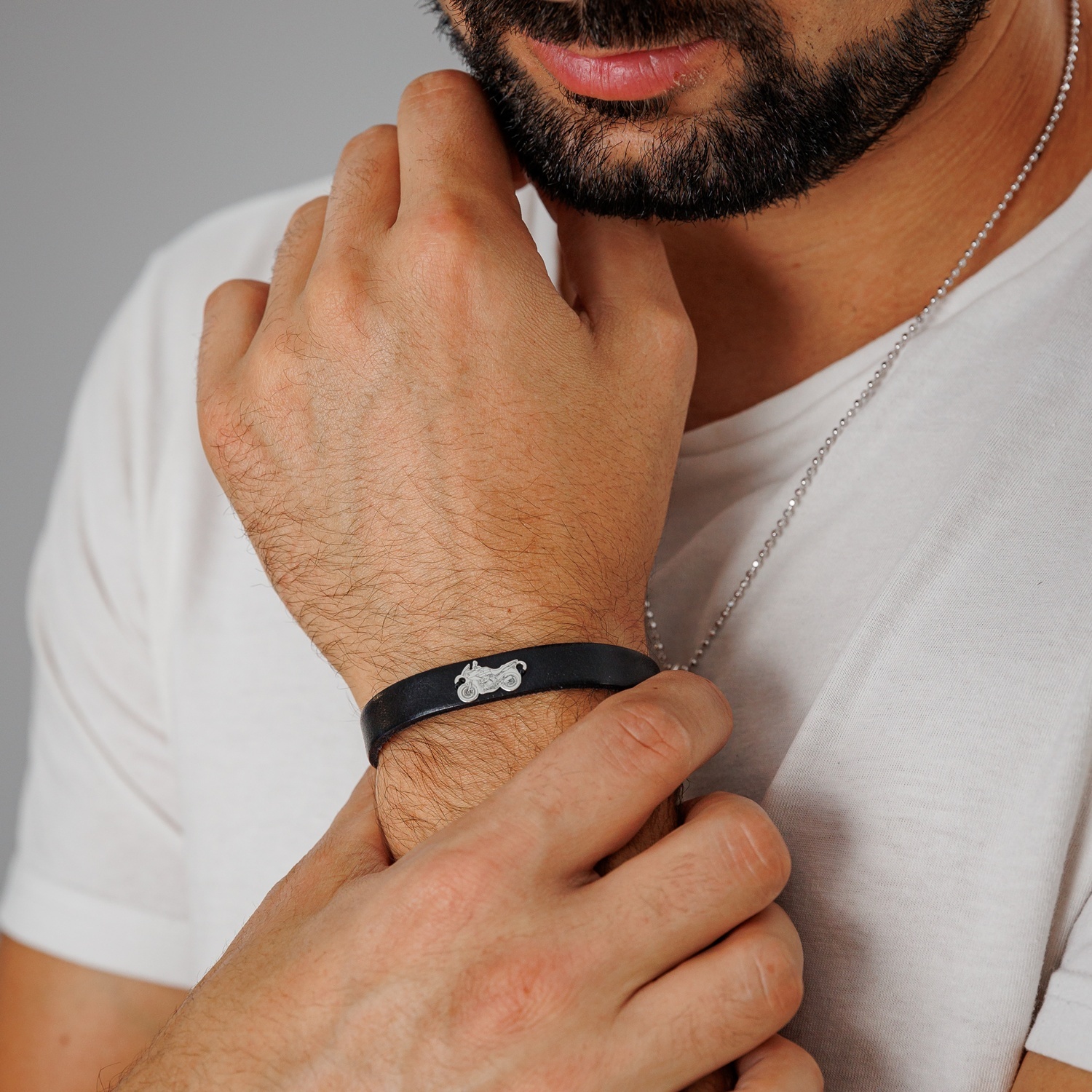 - Pandantul sub forma motocicleta este creat din Argint 925 si este prins de o bratara din piele.