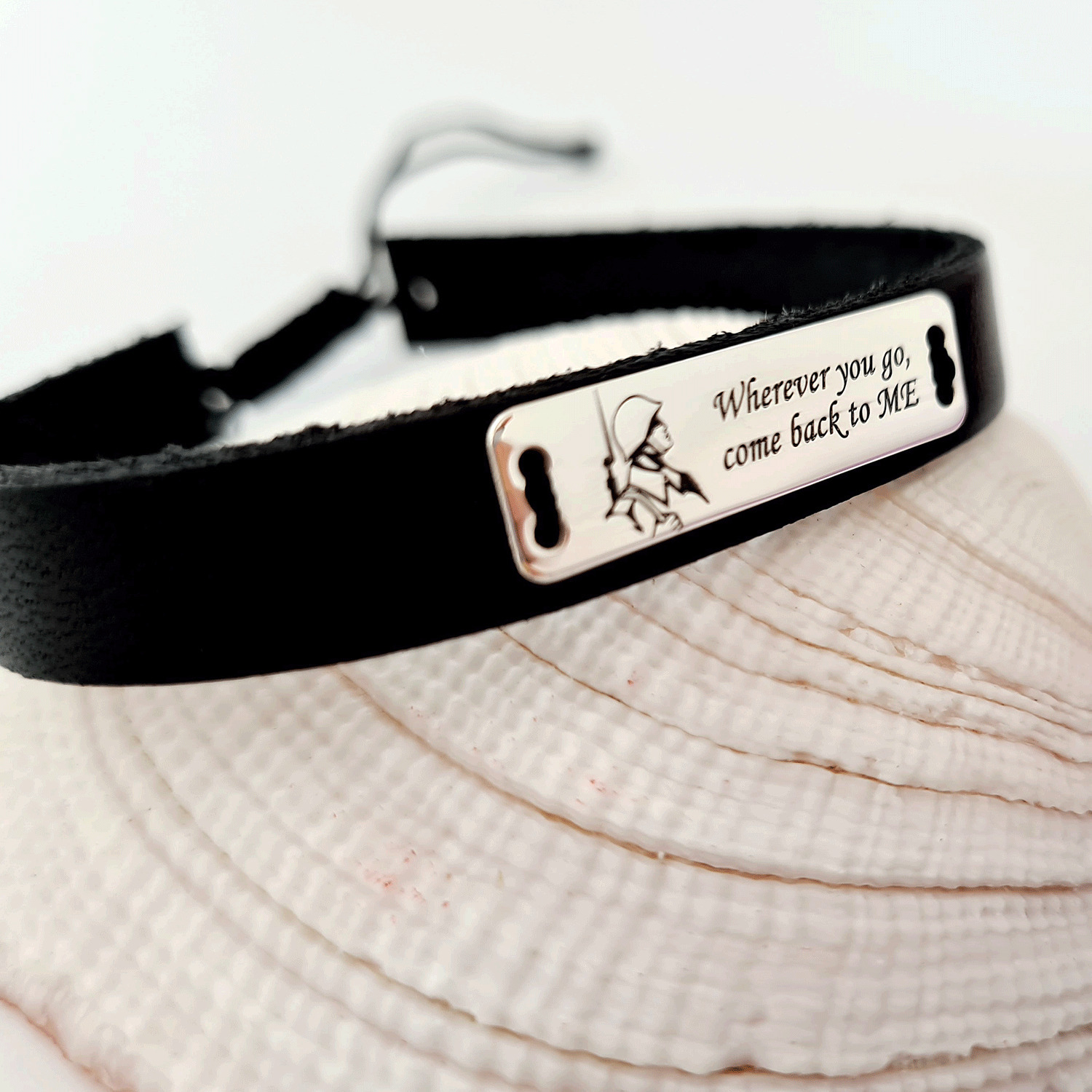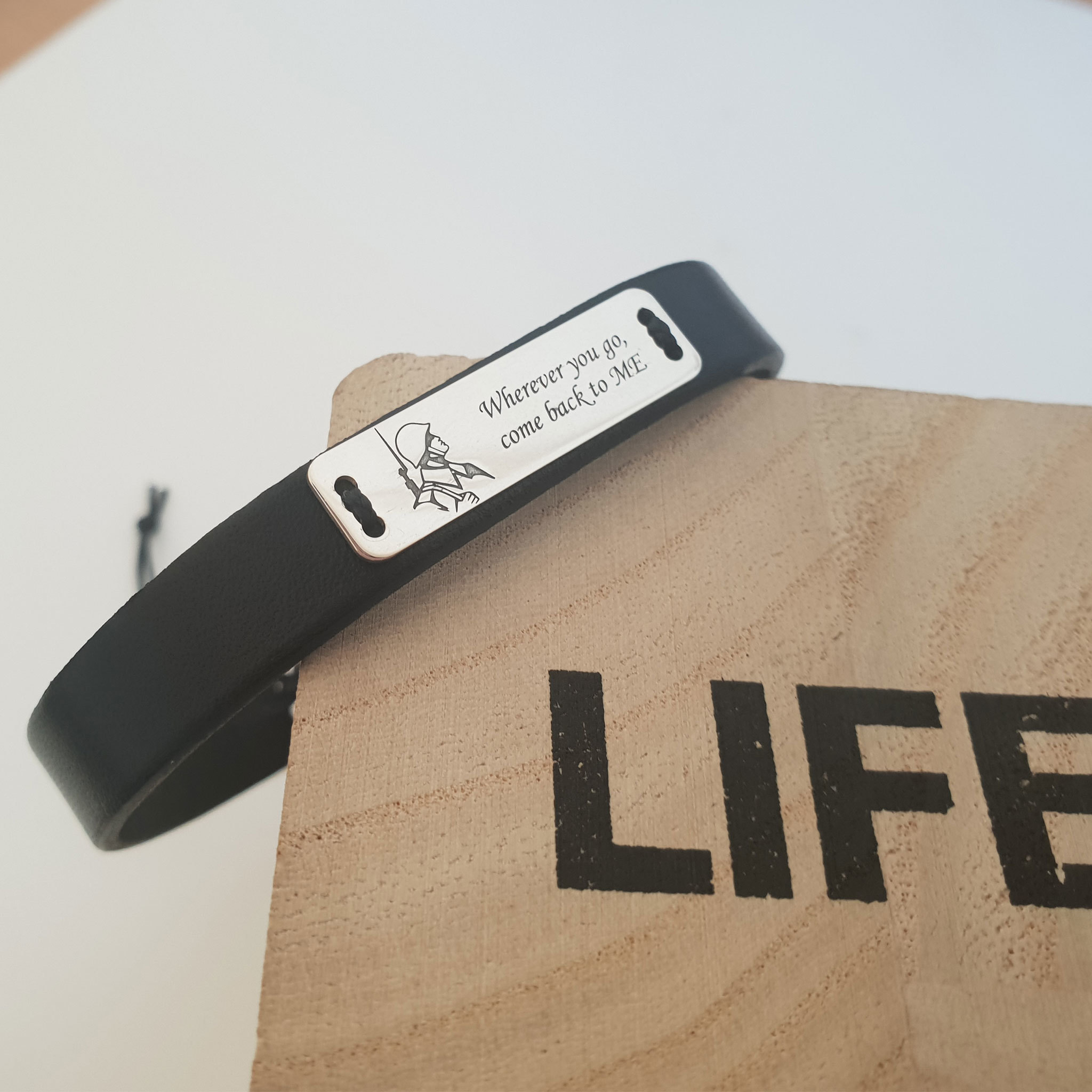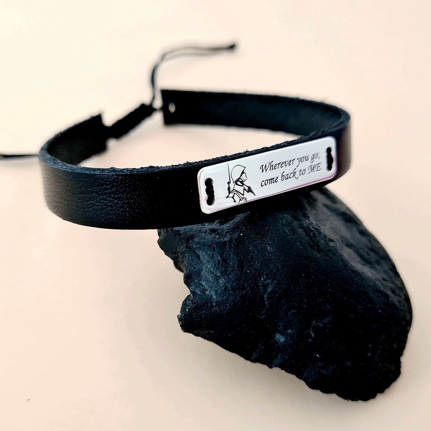 Placuta este creata din Argint 925 prin taiere si gravare laser si este prinsa de o bratara din piele.
