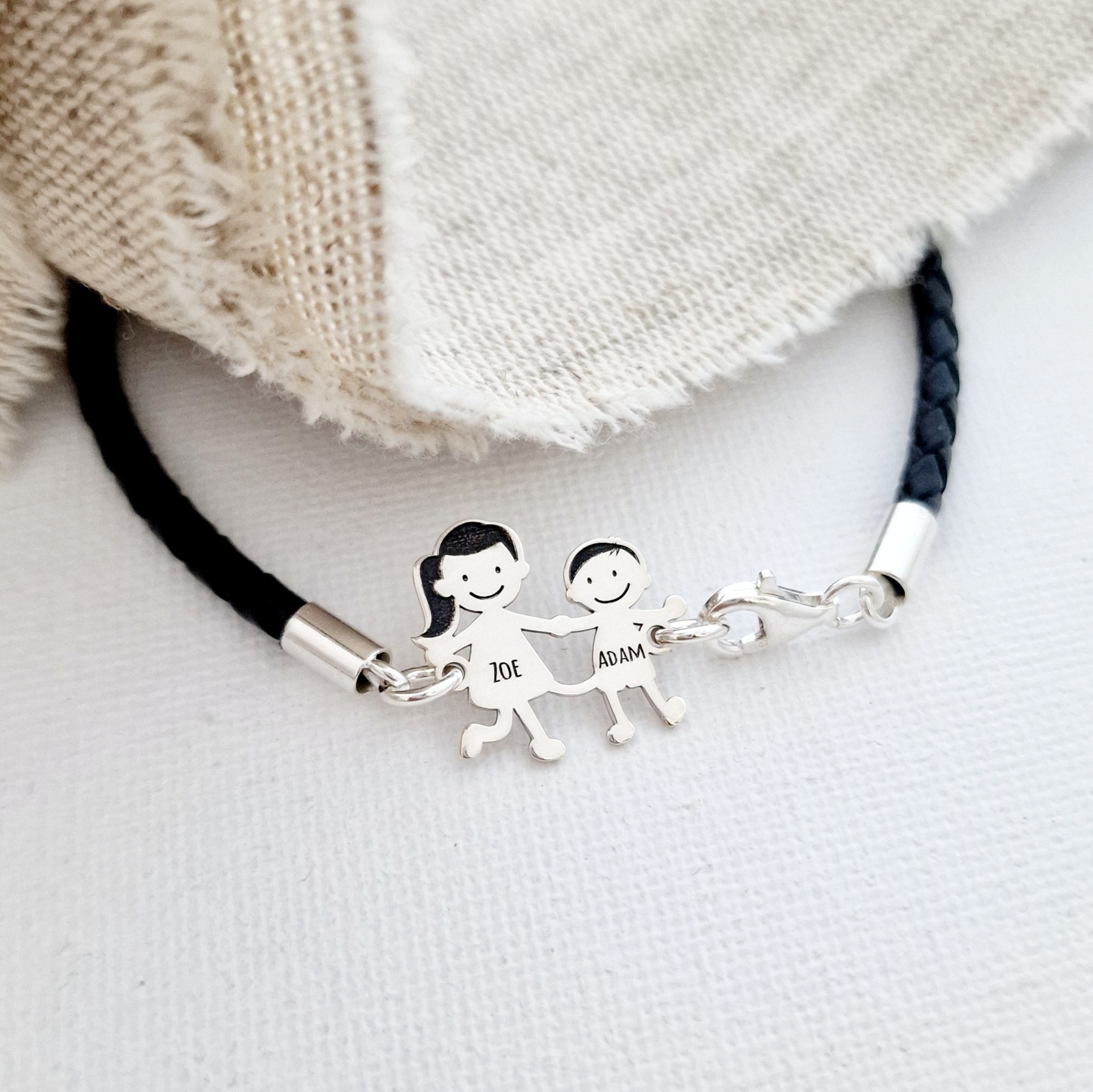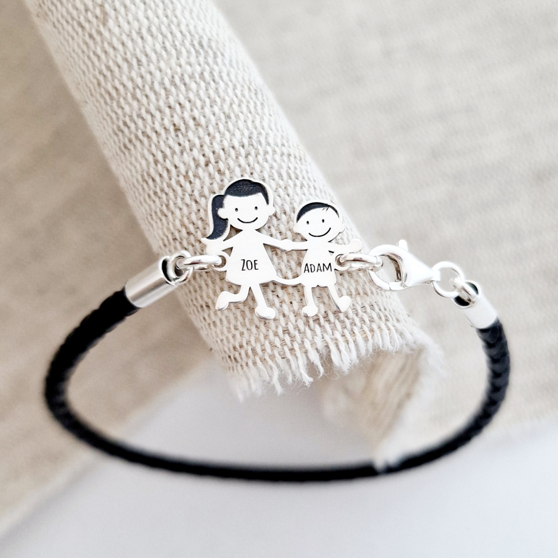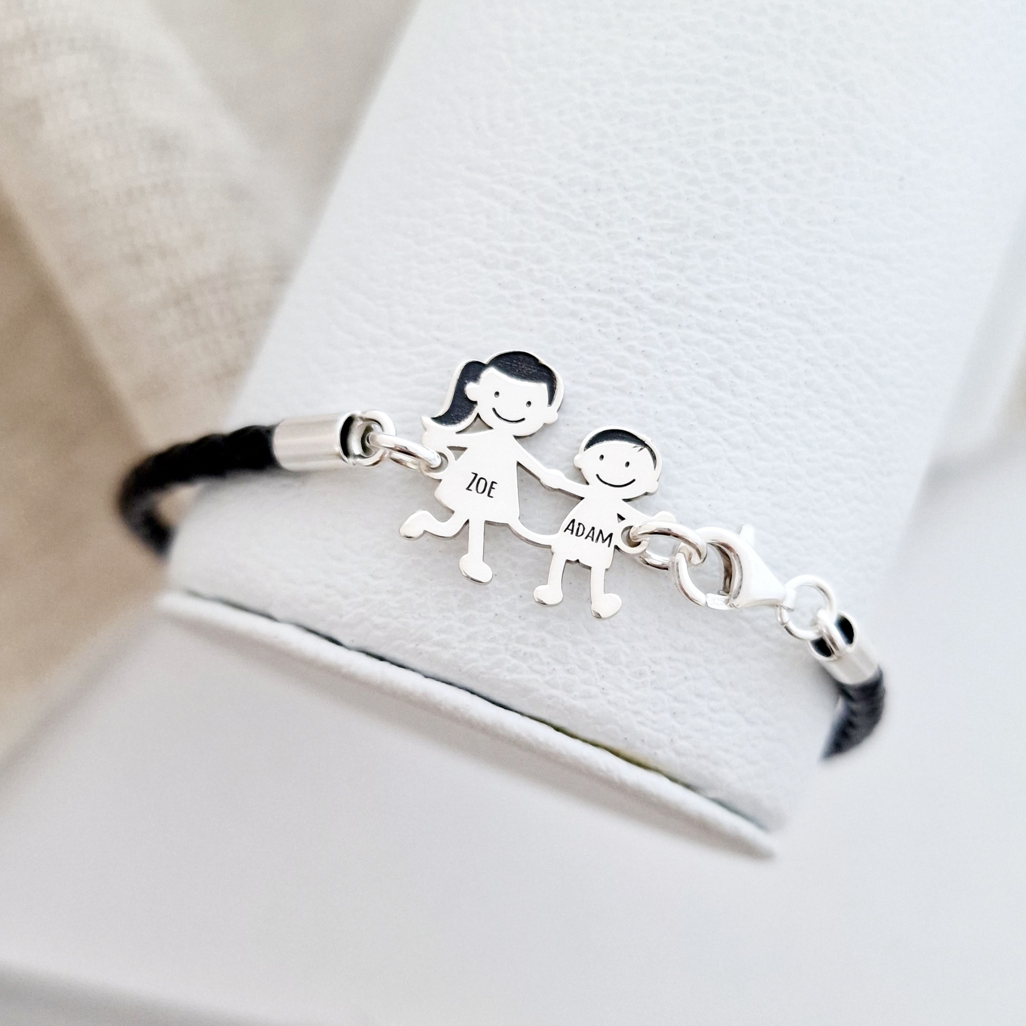 Bratara Unisex cu membrii Familiei - fetita si baiat - Argint 925, piele impletita