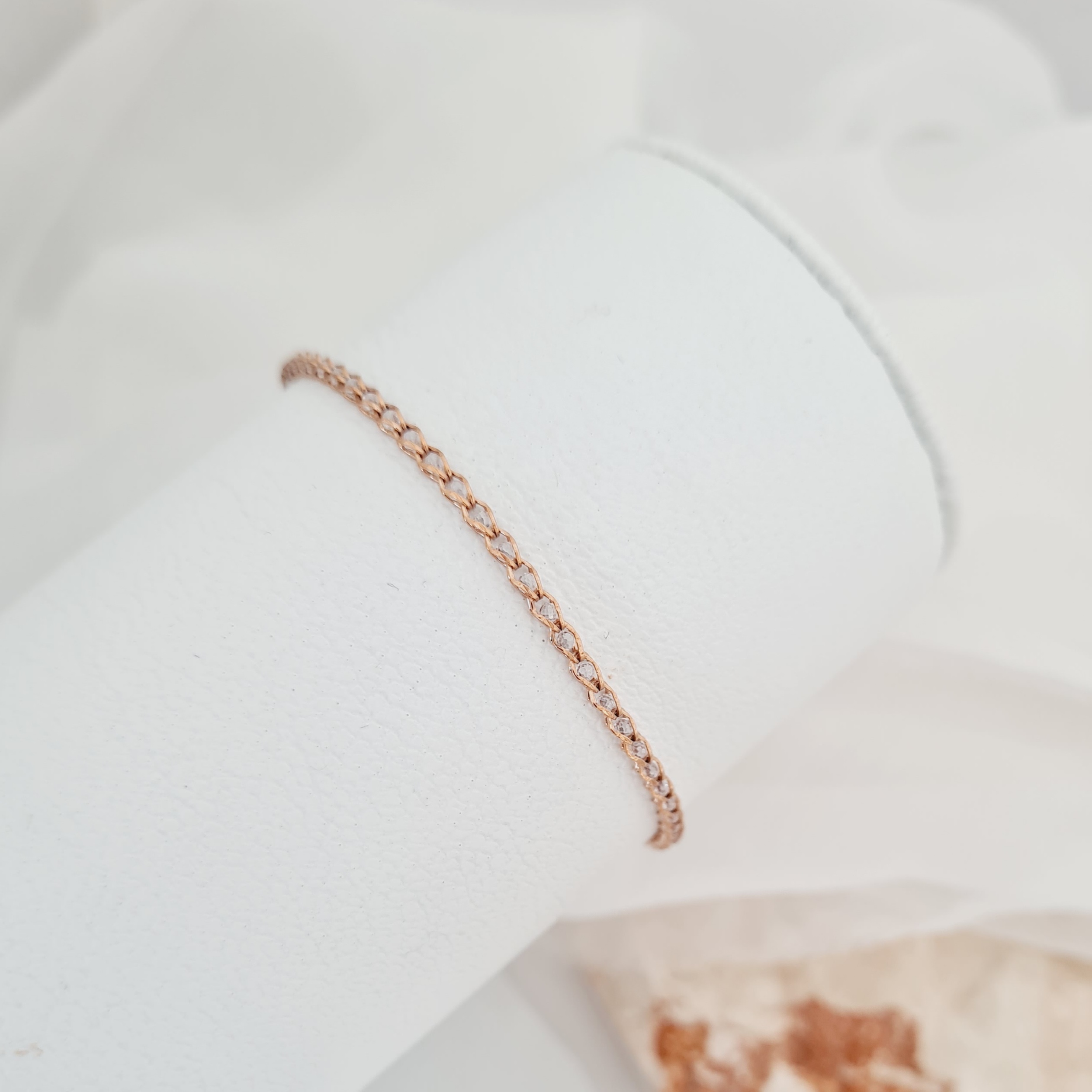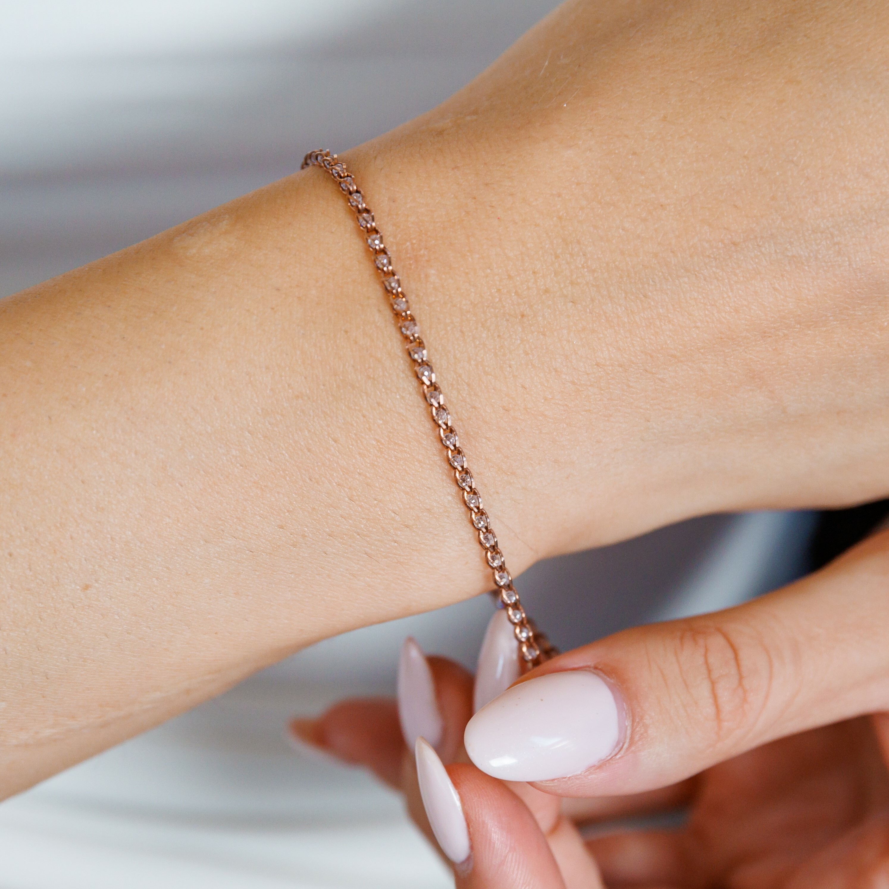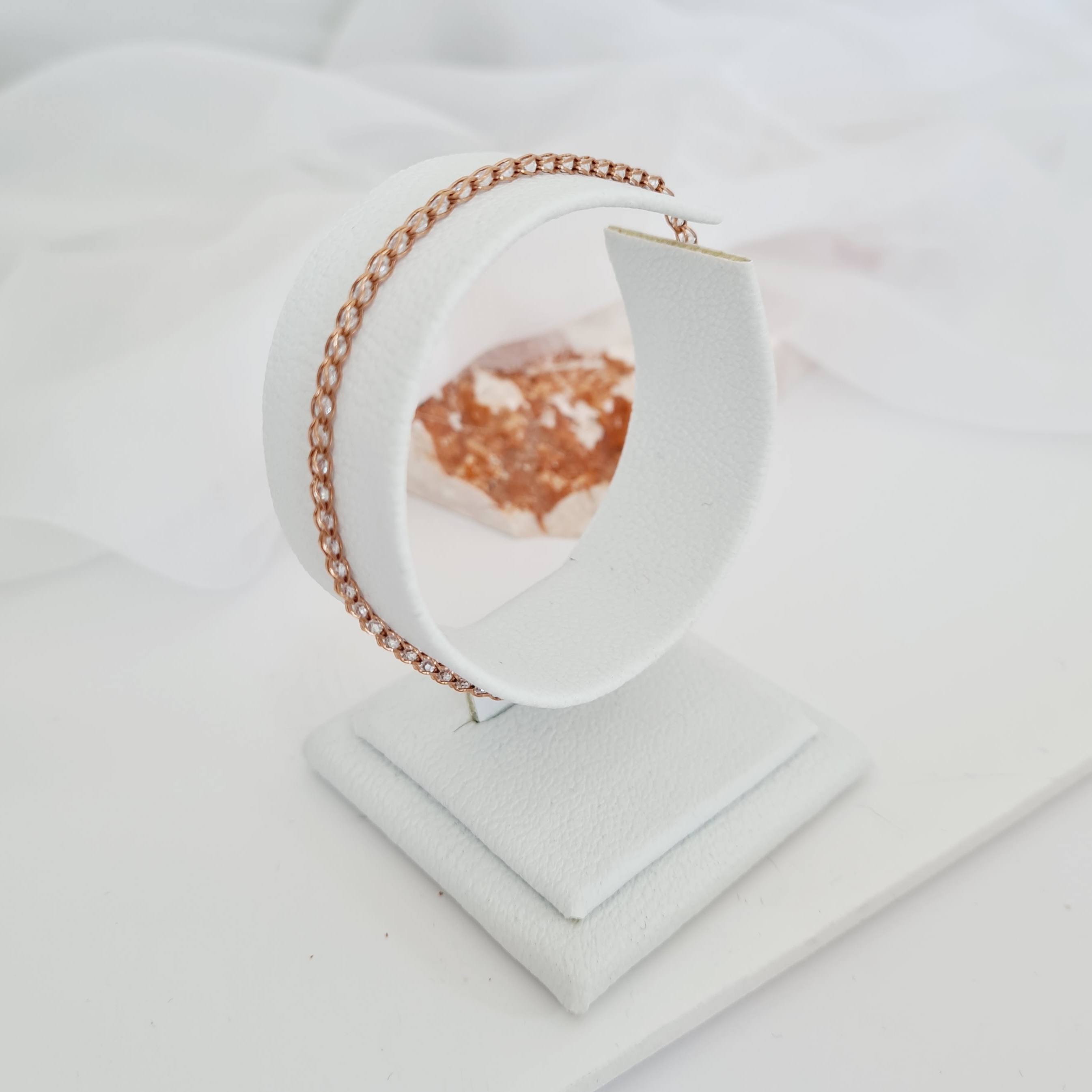 - Bratara este realizata dintr-un lantisor din Argint 925 placat cu Aur Roz de 18K și impletit cu cristale Zirconia în 4 nuante disponibile (alb, negru, roz si albastru).