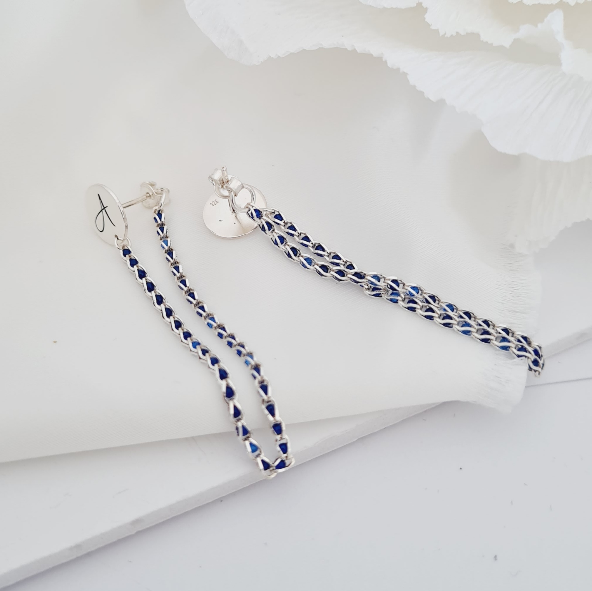 - Cerceii sunt realizati dintr-un lantisor din Argint 925 impletit cu cristale Zirconia în 4 nuante disponibile (alb, negru, roz si albastru).