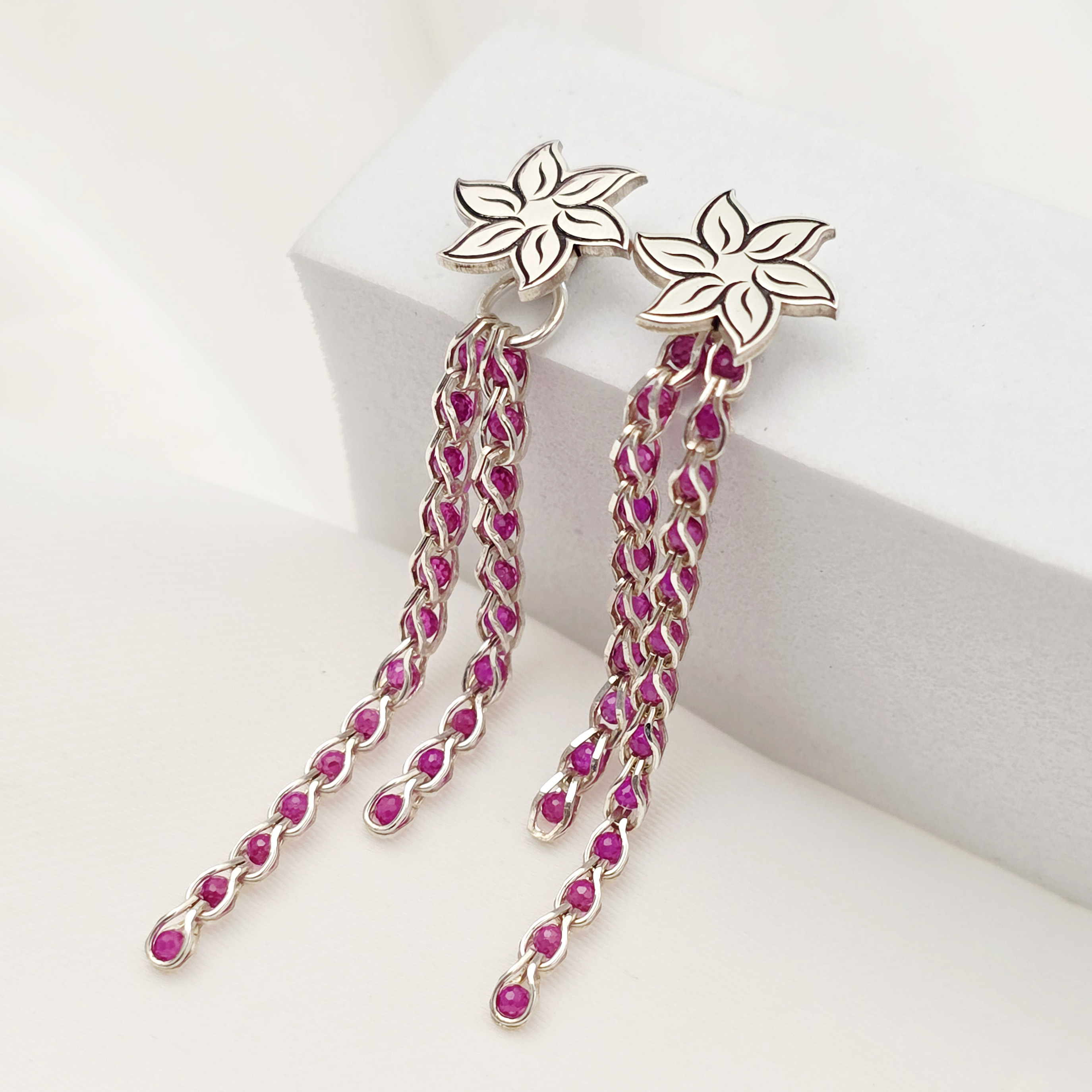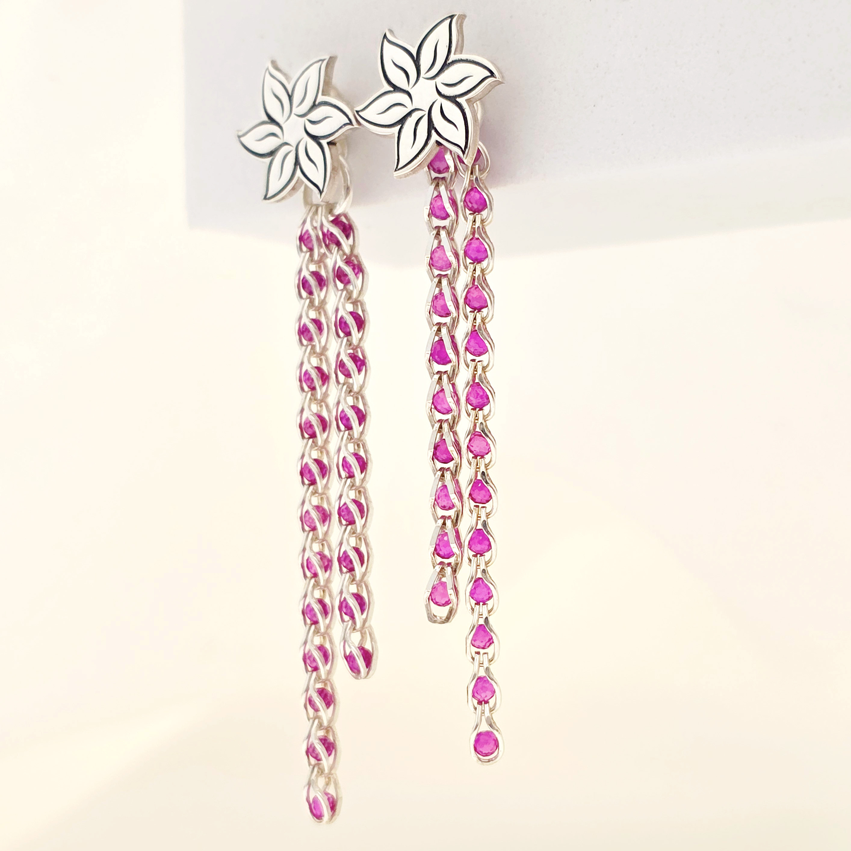 Perechea de cercei face parte din colectia inovatoare de bijuterii cu lantisor cromatic, in care stralucirea cristalelor Zirconia se impleteste cu gratie in lantisoare din Argint 925 sau Argint 925 placat cu Aur Galben si Roz de 18K, aducand astfel, o explozie de culoare si eleganta in fiecare piesa.