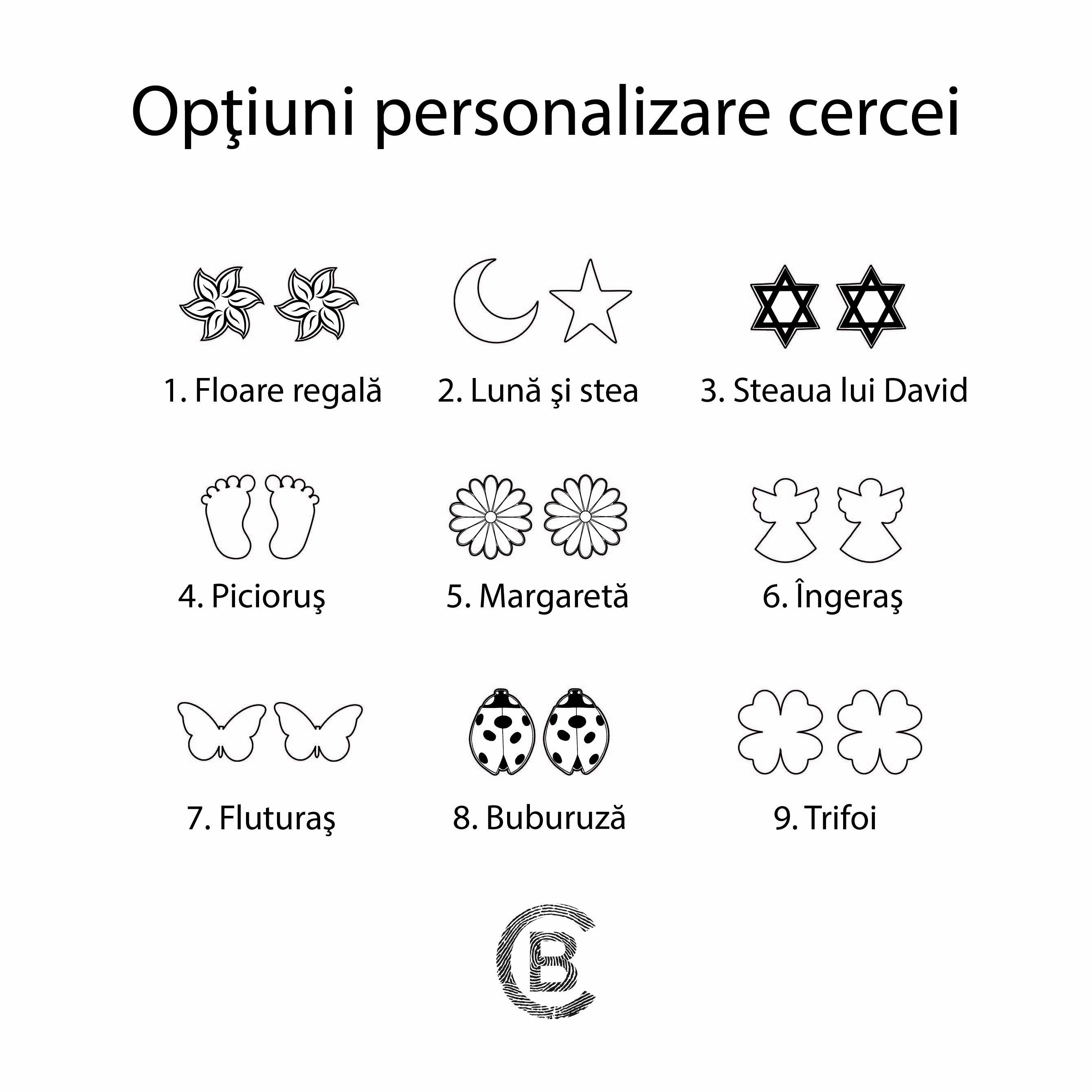 - Sistemul de inchidere este tip surub, iar in fata cercelul are un simbol ales de tine - vezi poza explicativa. .