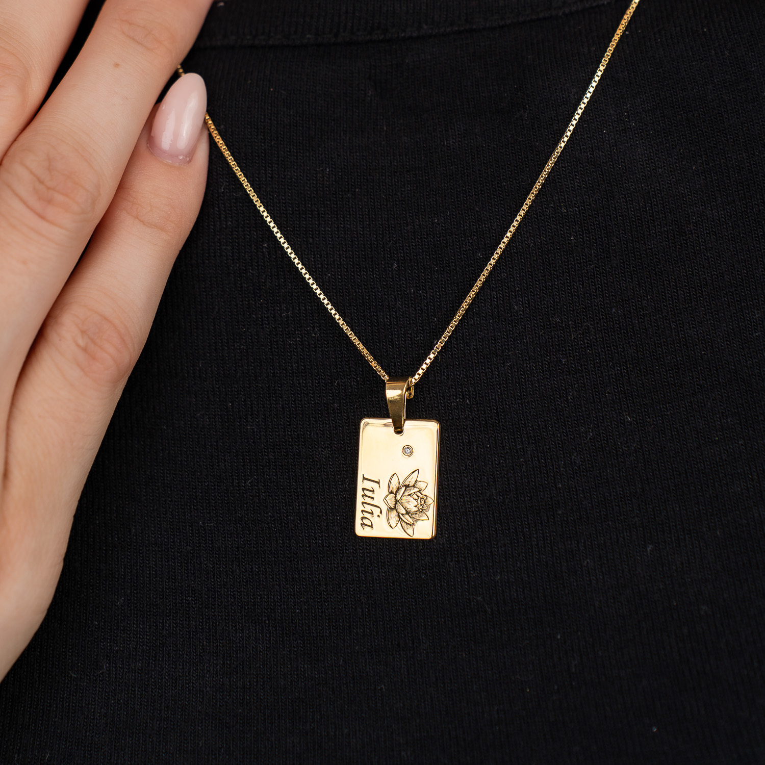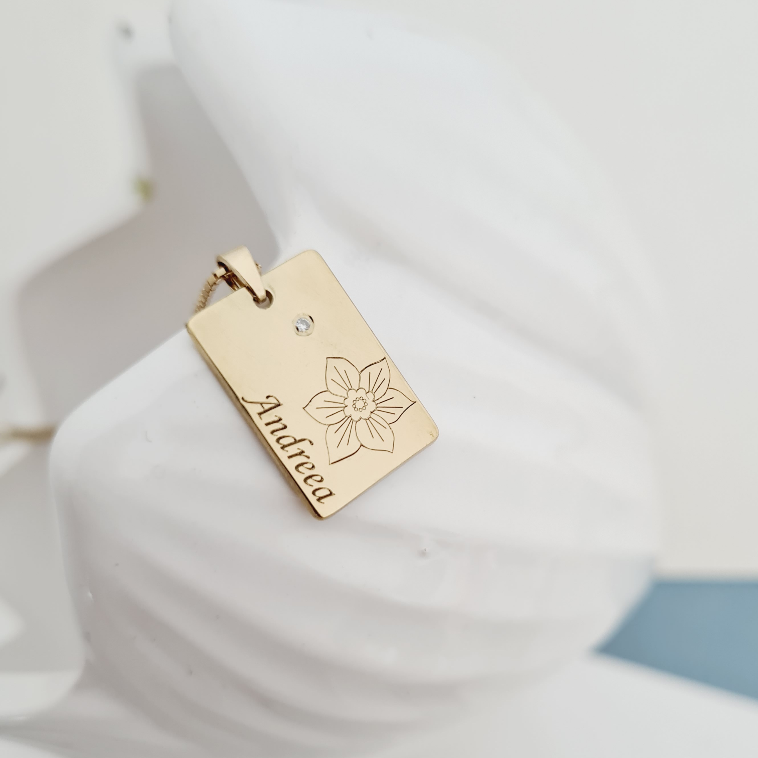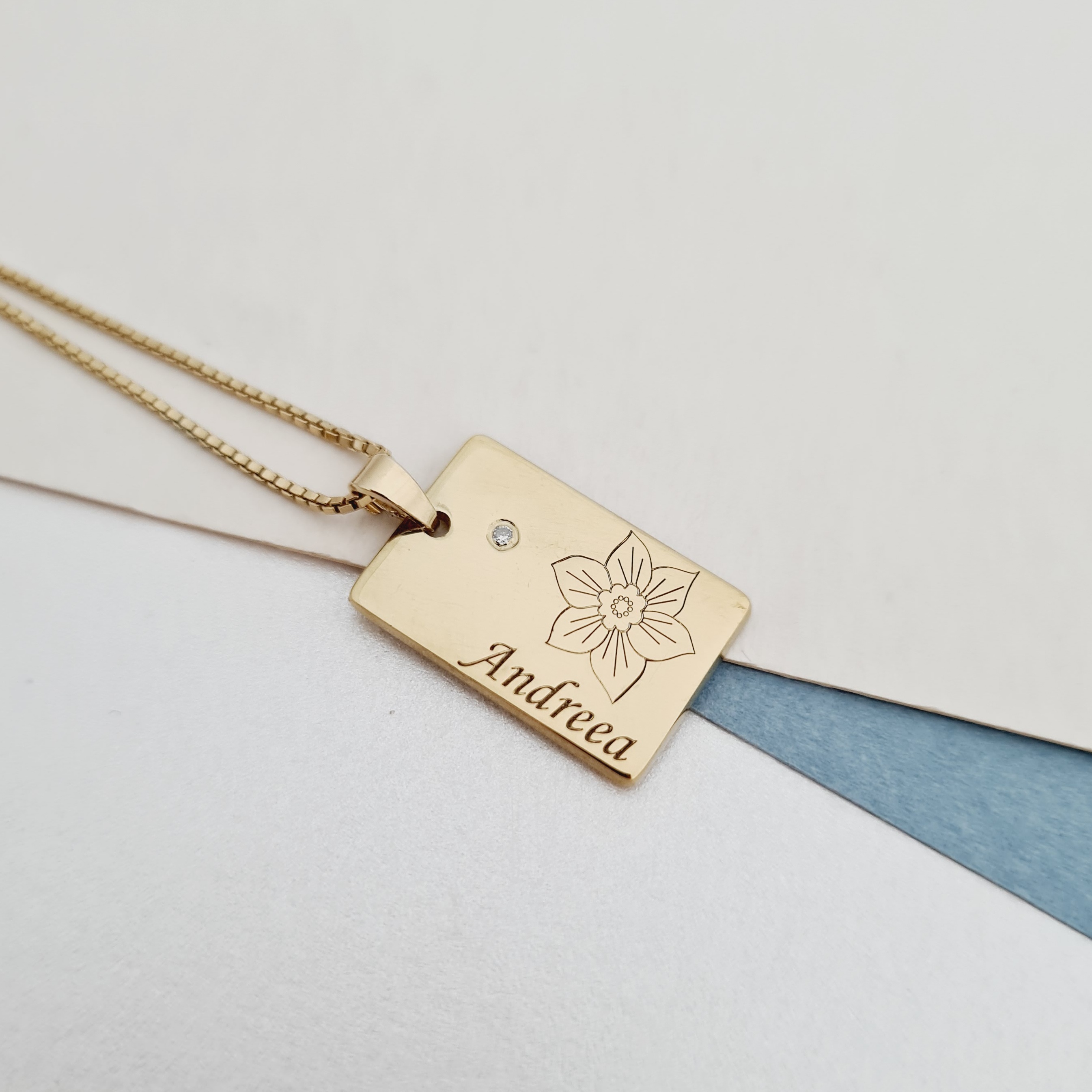 Lantisor Floarea mea - Diamant natural, nume si floarea lunii de nastere - Argint 925 placat cu Aur Galben 18K