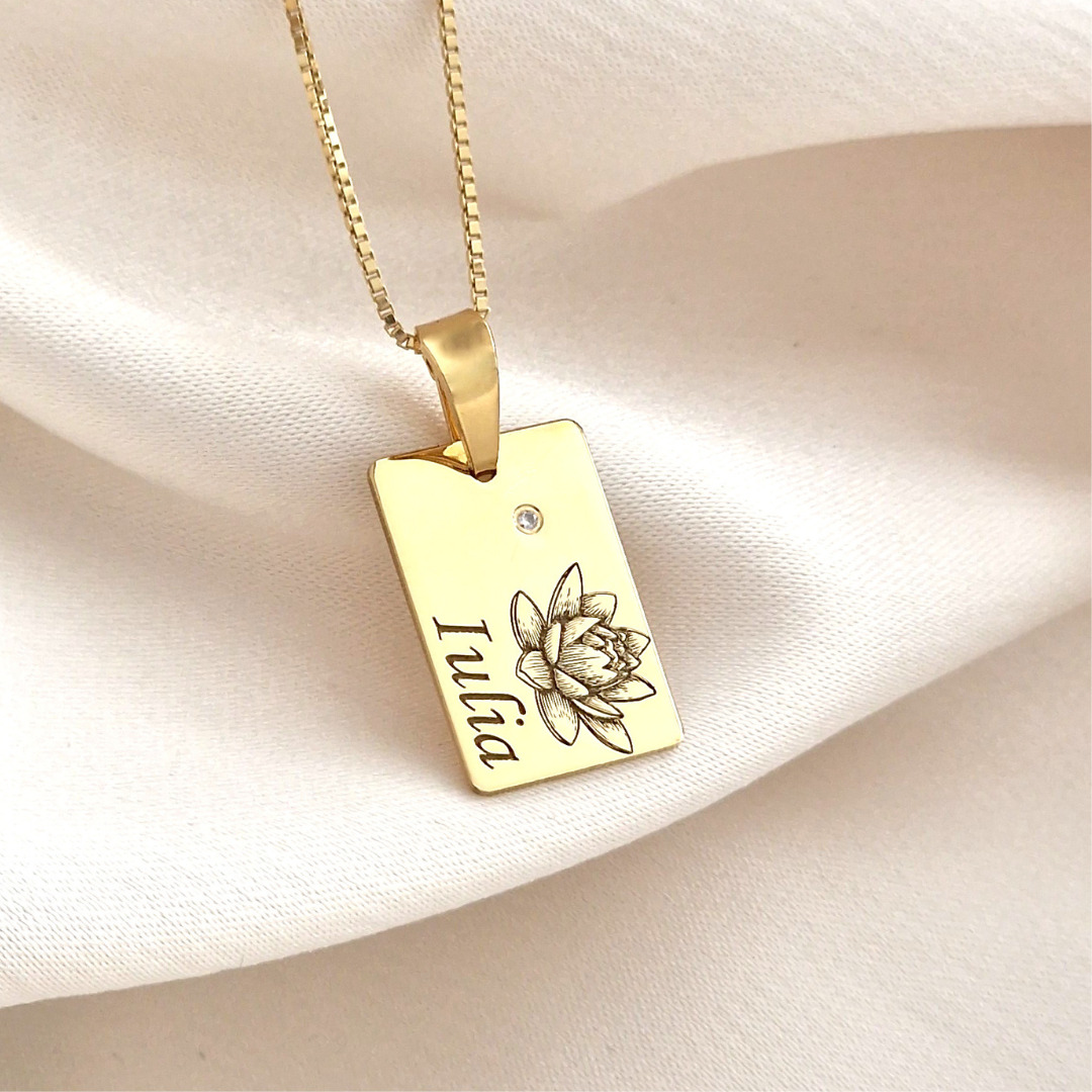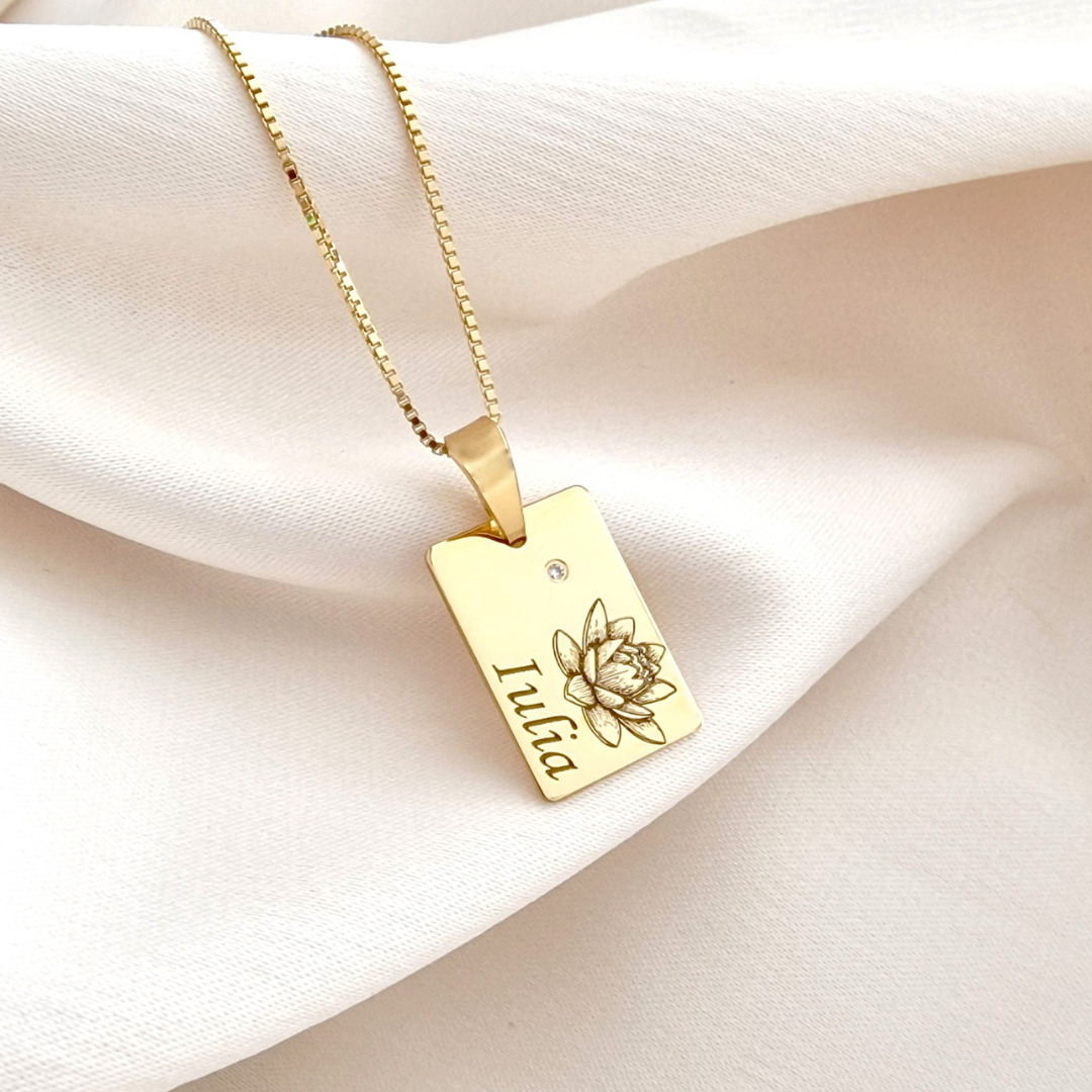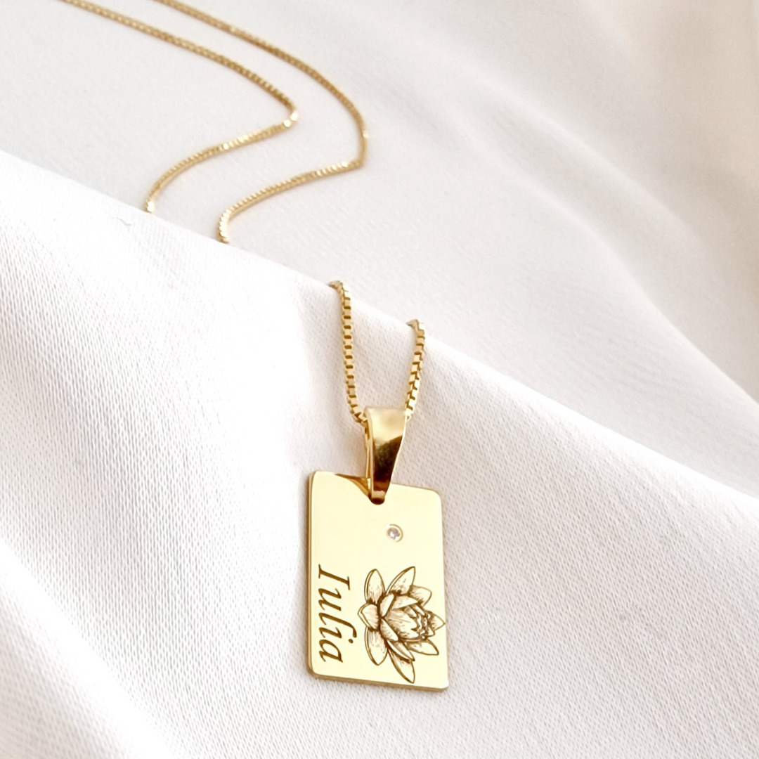 Lantisor Floarea mea - Diamant natural, nume si floarea lunii de nastere - Argint 925 placat cu Aur Galben 18K