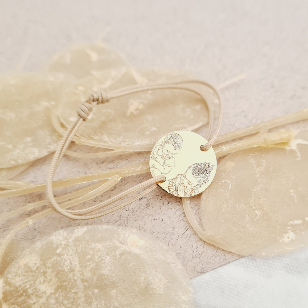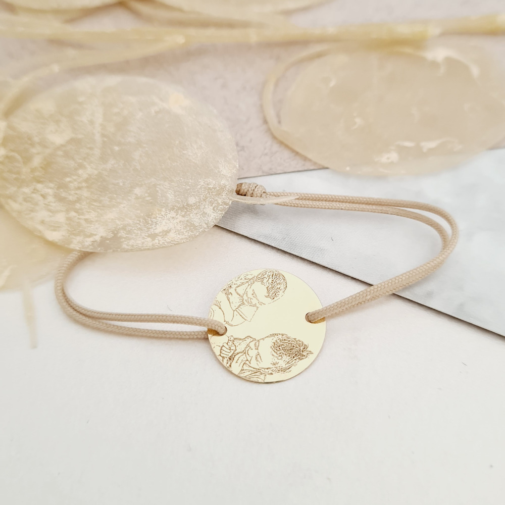 Bratara personalizata cu poza - Capsula timpului - Banut 15 mm - Aur Galben 14K - Snur reglabil, diverse culori