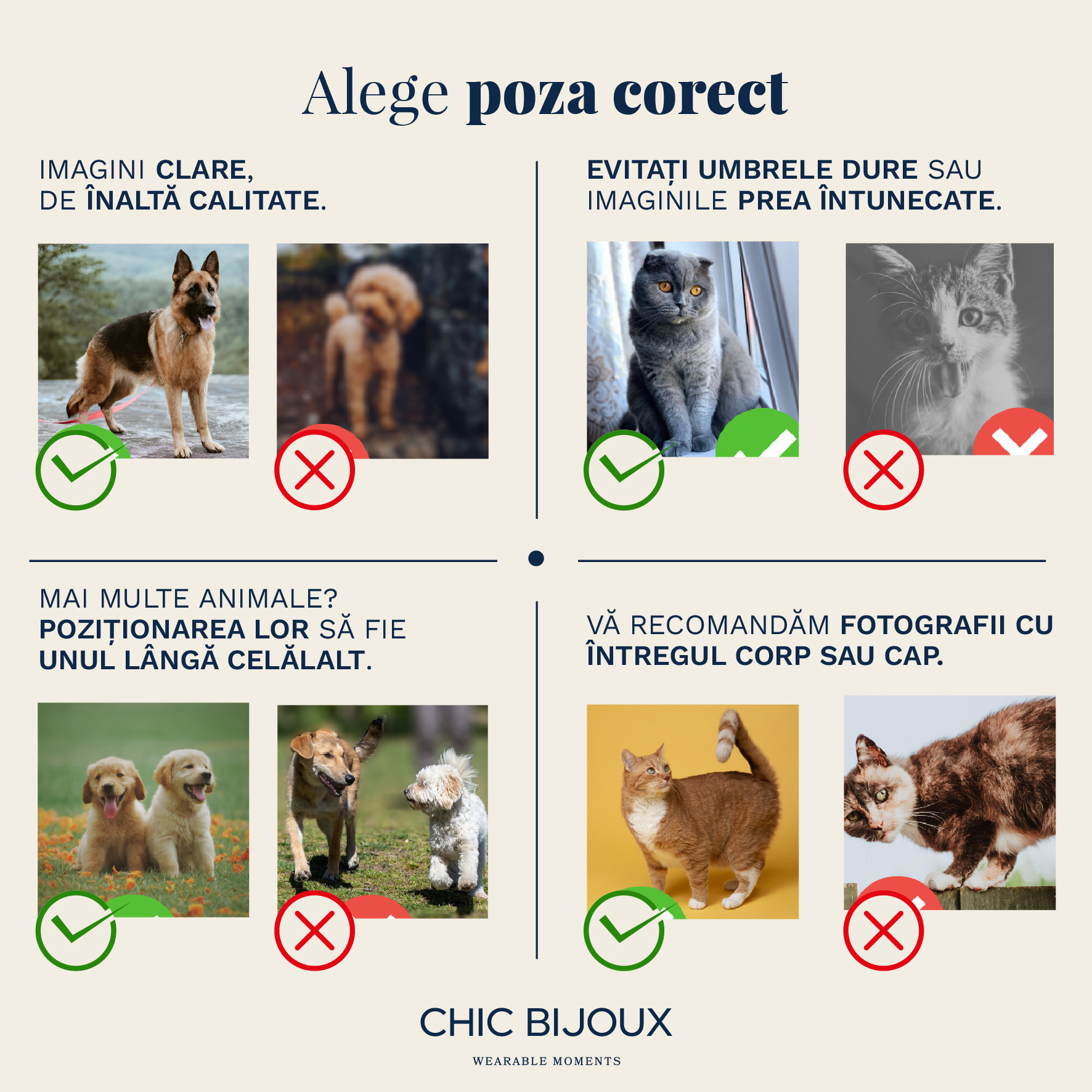 - Inainte de plasarea comenzii ia in considerare dimensiunea bijuteriei si elementele ce ti le doresti gravate din fotografie. In cazul in care iti doresti fotogravura cu mai multe animale acestea trebuie sa fie incadrate cat mai apropiat in imagine.
