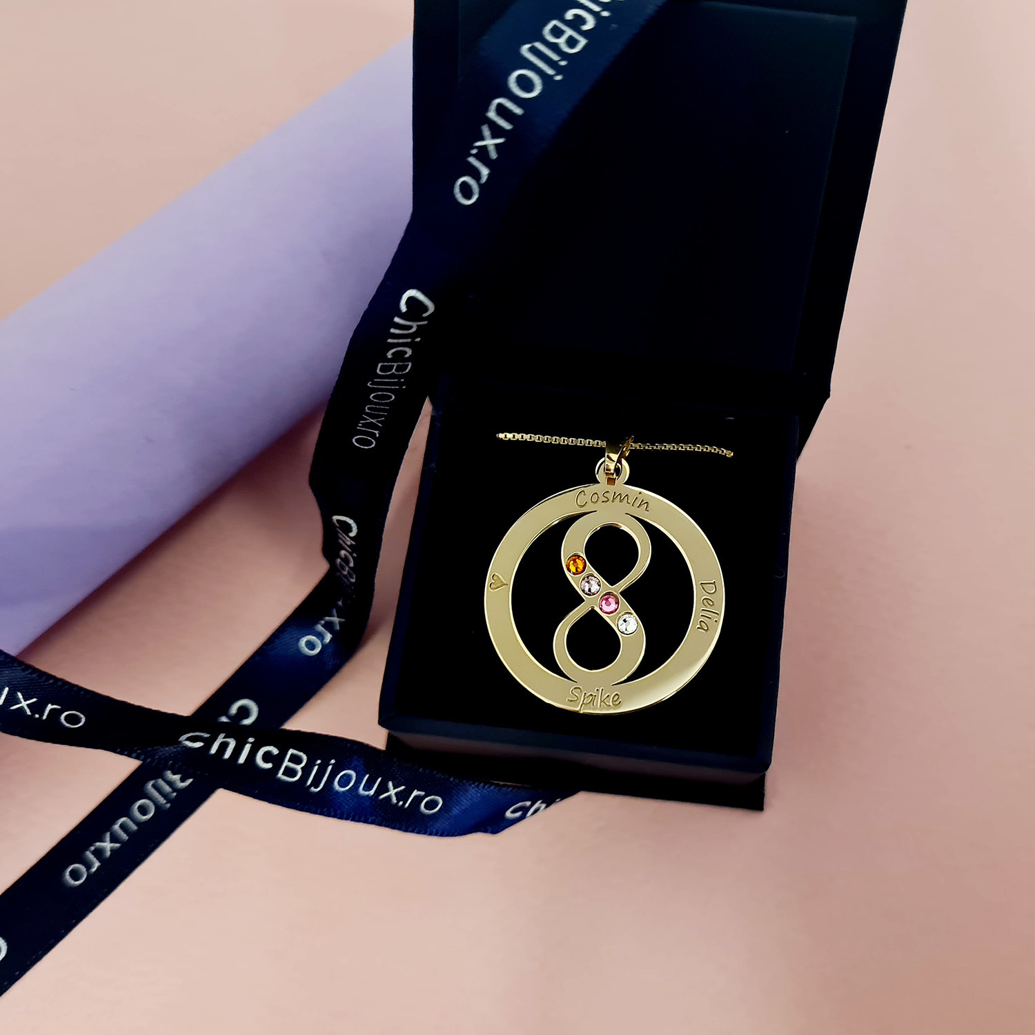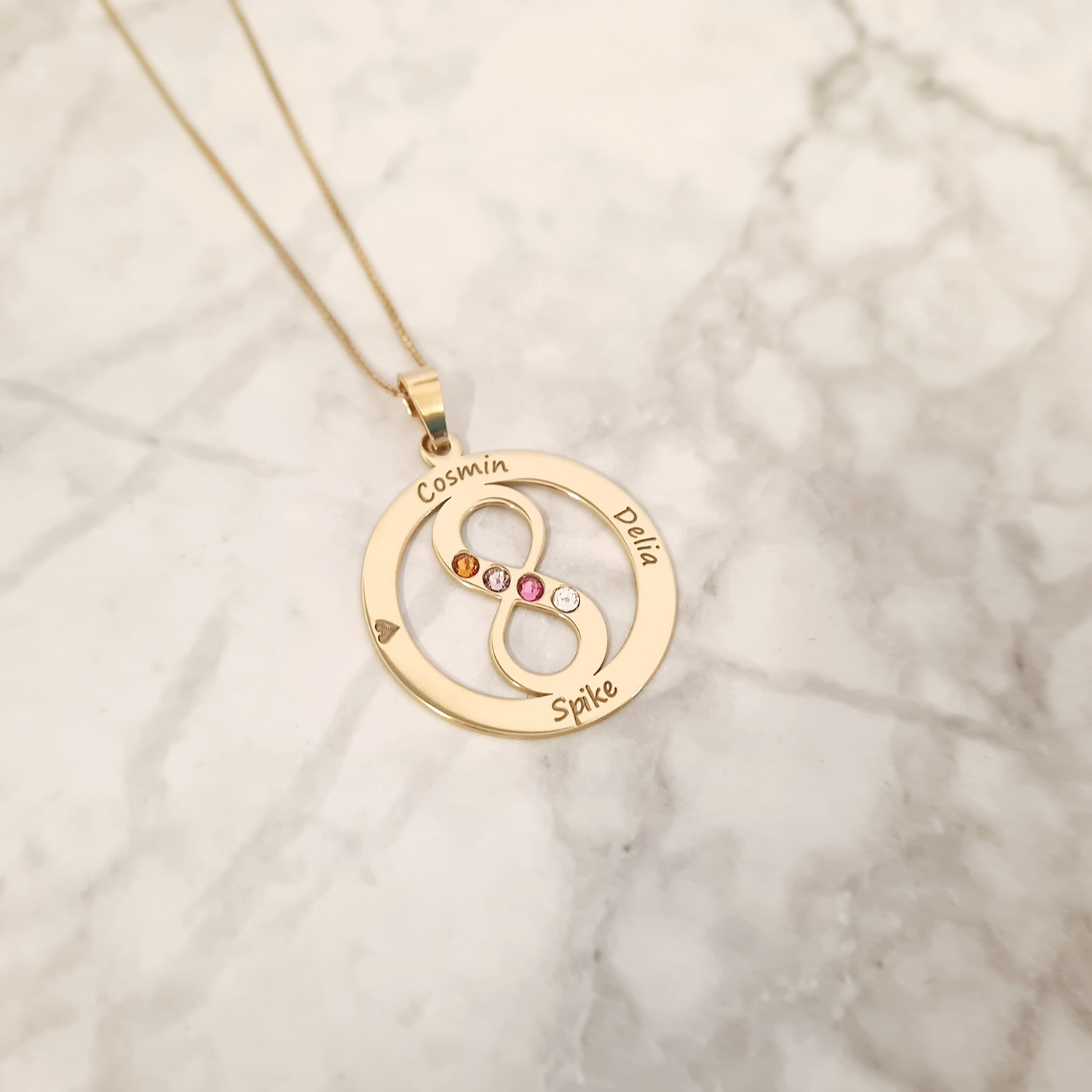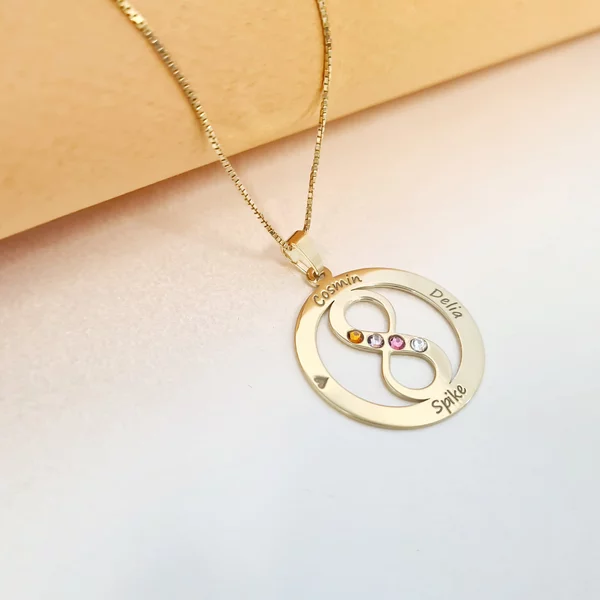 Lantisorul "Iubire Infinita" si-a primit acest nume datorita simbolului infinit pozitionat in mijlocul unui cerc pe care sunt gravate numele celor mai importante persoane din viata ta.