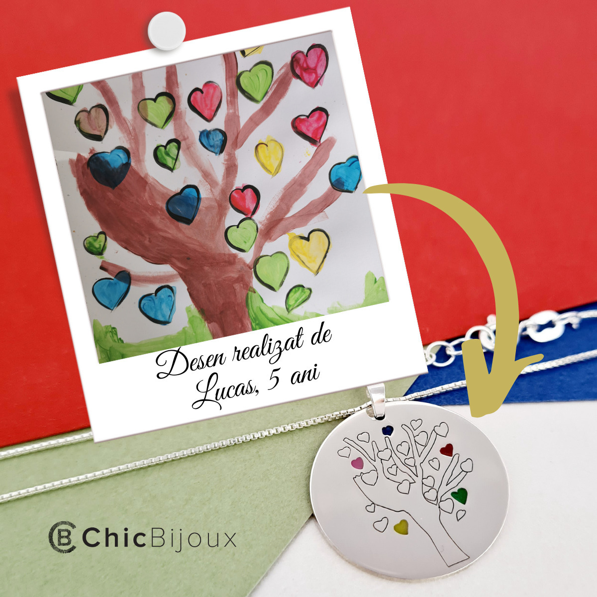 Bijuteria face parte din colectia “Our Children” un concept fabulos ce transforma lucrarile de arta ale copiilor in bijuterii personalizate adorabile. Fiecare piesa este realizata conform desenelor celor mici. Astfel iau nastere in atelierul nostru bijuterii cu modele si gravuri iesite din mana si imaginatia copiilor.
