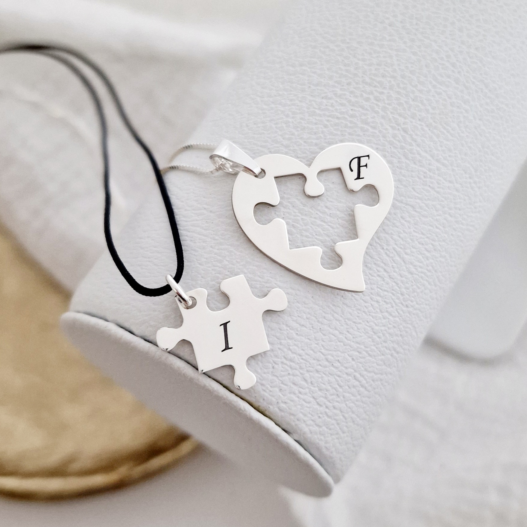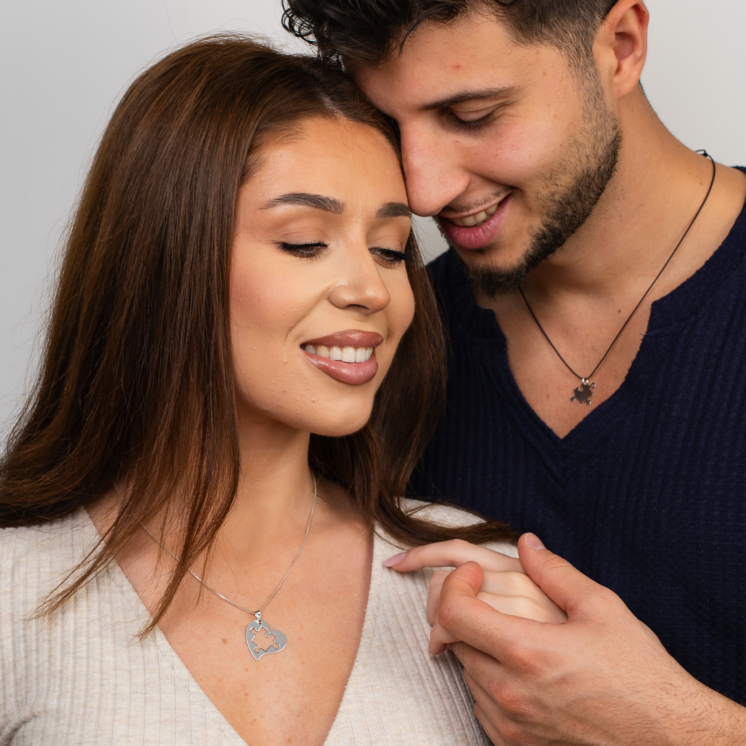 Cele doua pandantive reprezinta o inima din care este taiata o bucata de puzzle. Conectate acestea reflecta dragostea pe care vi-o purtati unul altuia si semnifica faptul ca impreuna formati un intreg!