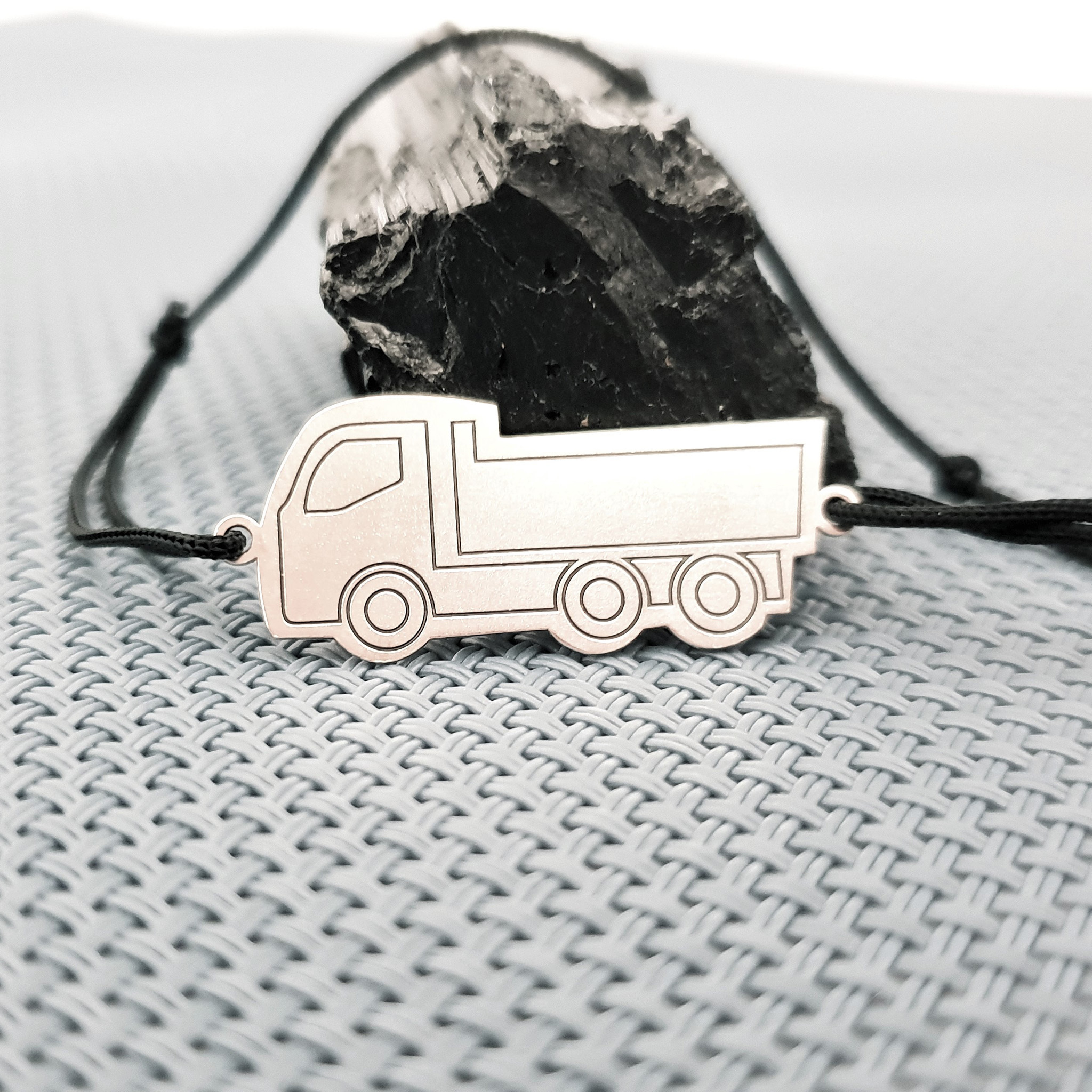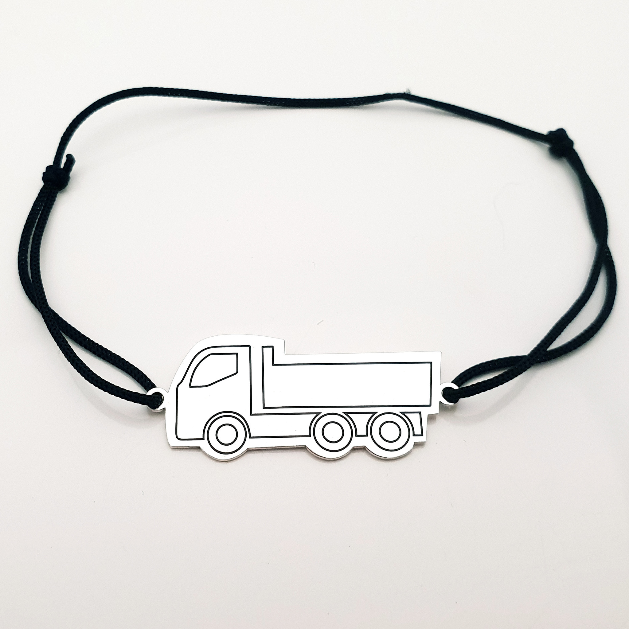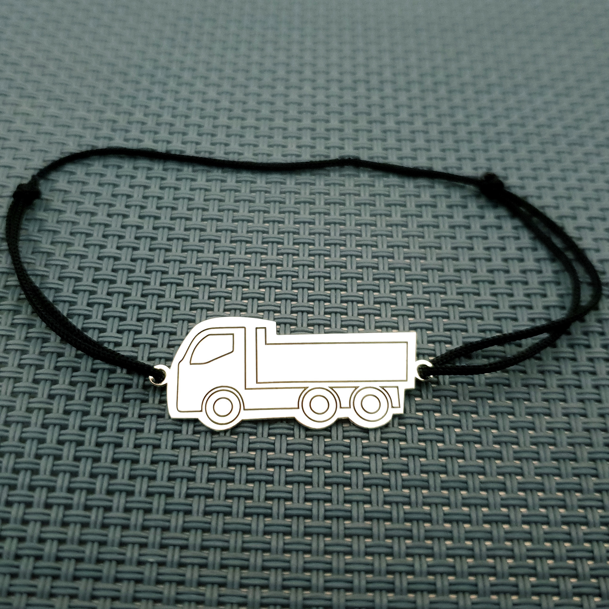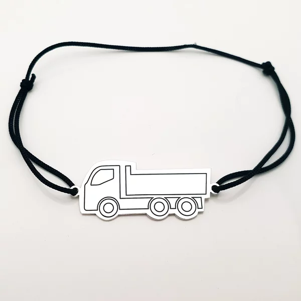 Bratara Camion este creata din Argint 925 prin taiere si gravare laser si fiind atasata unui snur de matase vegetala, marime reglabila.