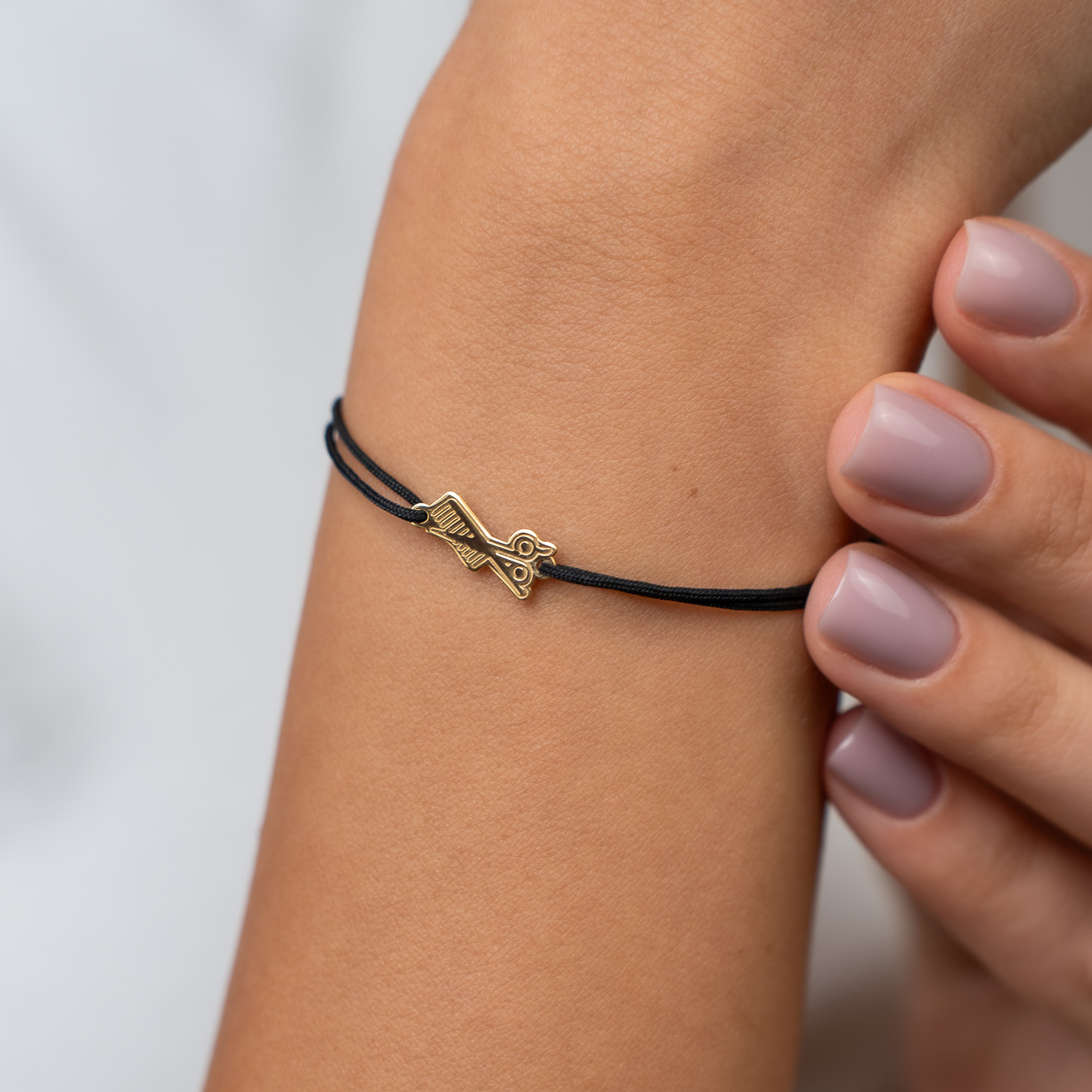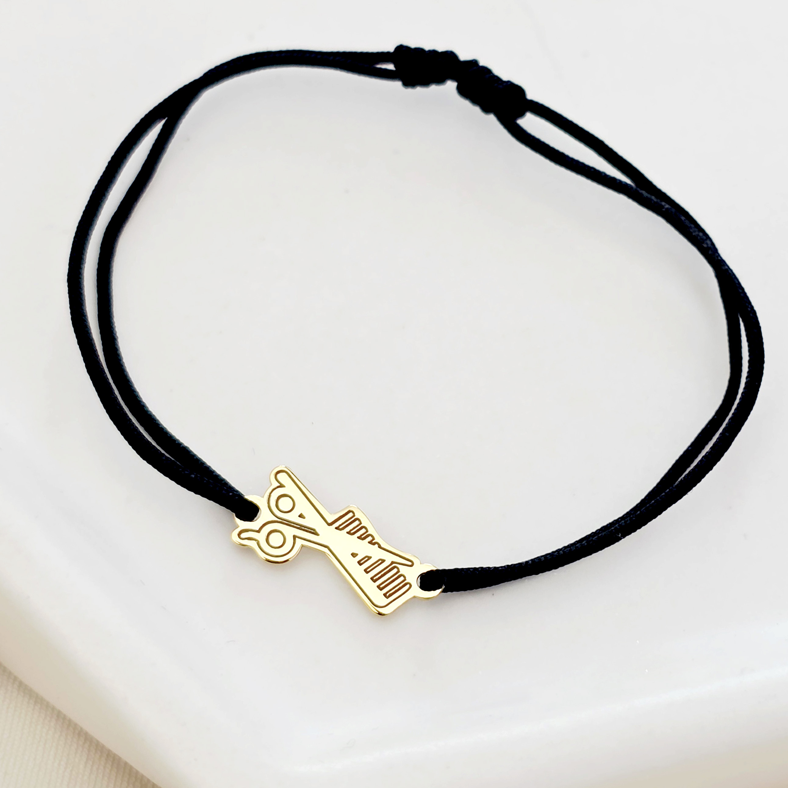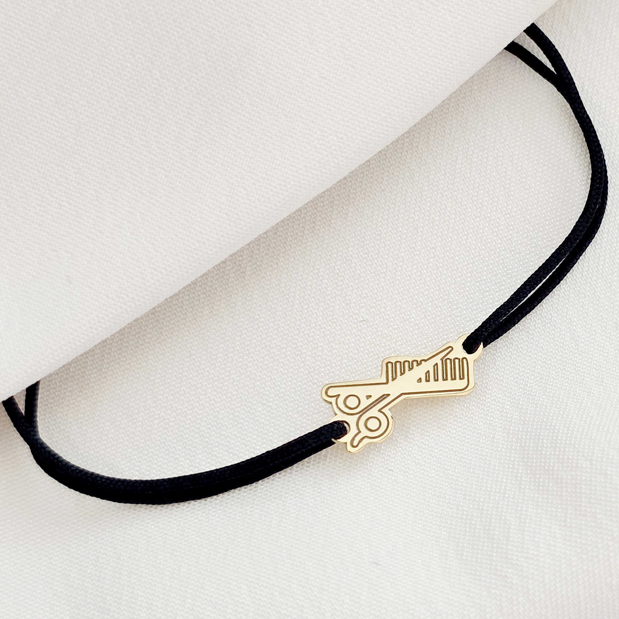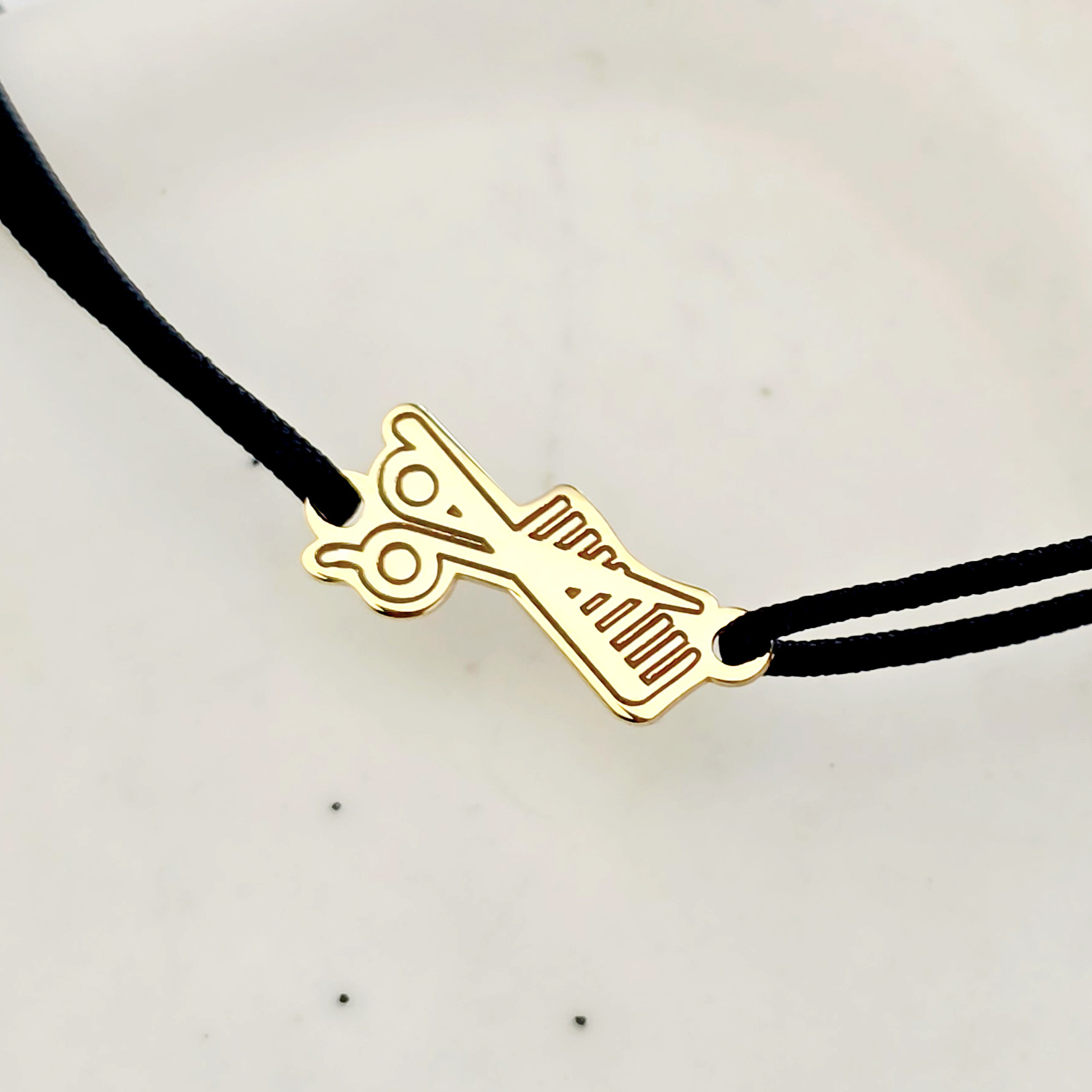 O bratara personalizata creata din Argint 925 placat cu Aur Galben 18K, avand dimensiunea de 1,3x0,5 cm si fiind atasata unui snur de matase vegetala, marime reglabila. Un cadou deosebit hairstylistului tau!