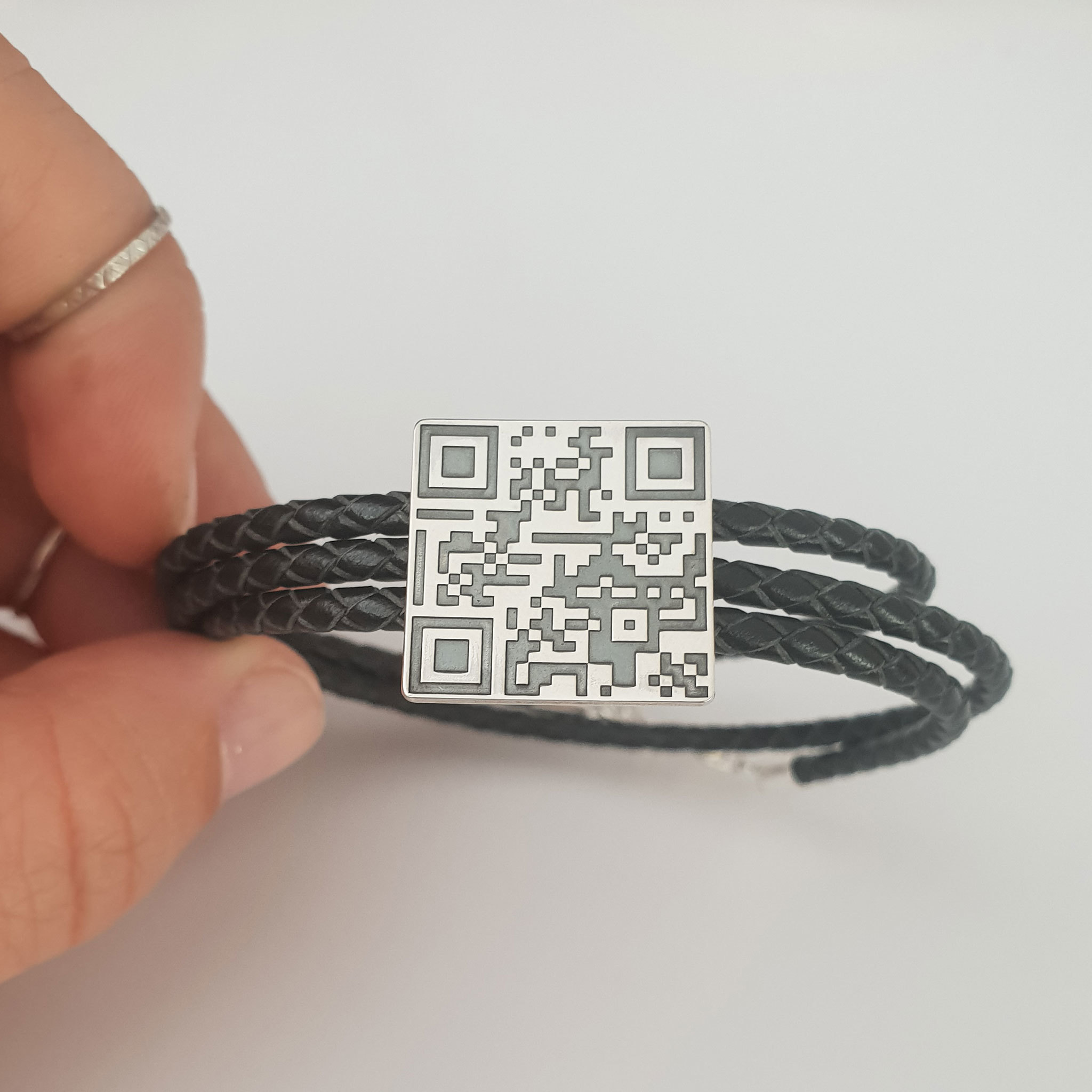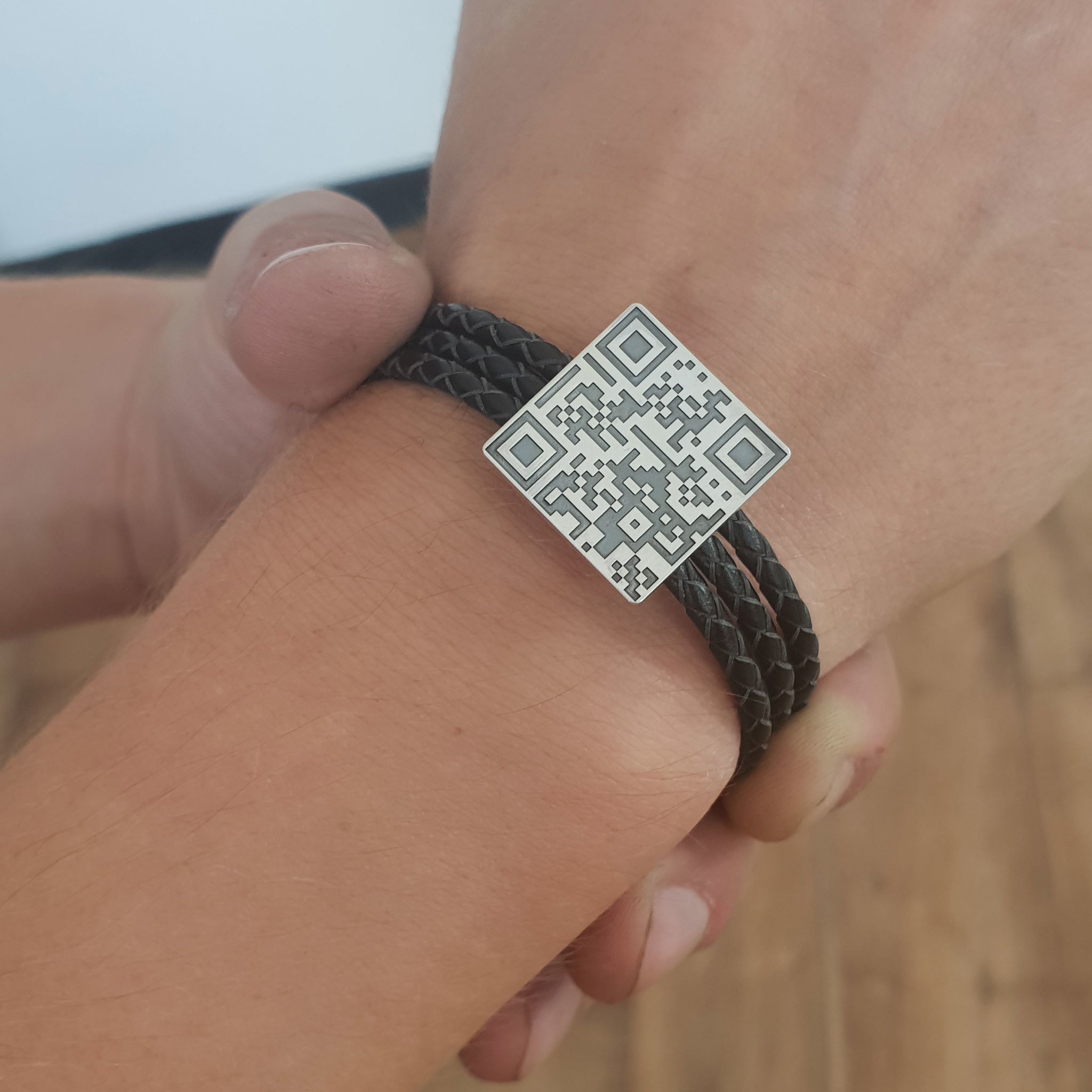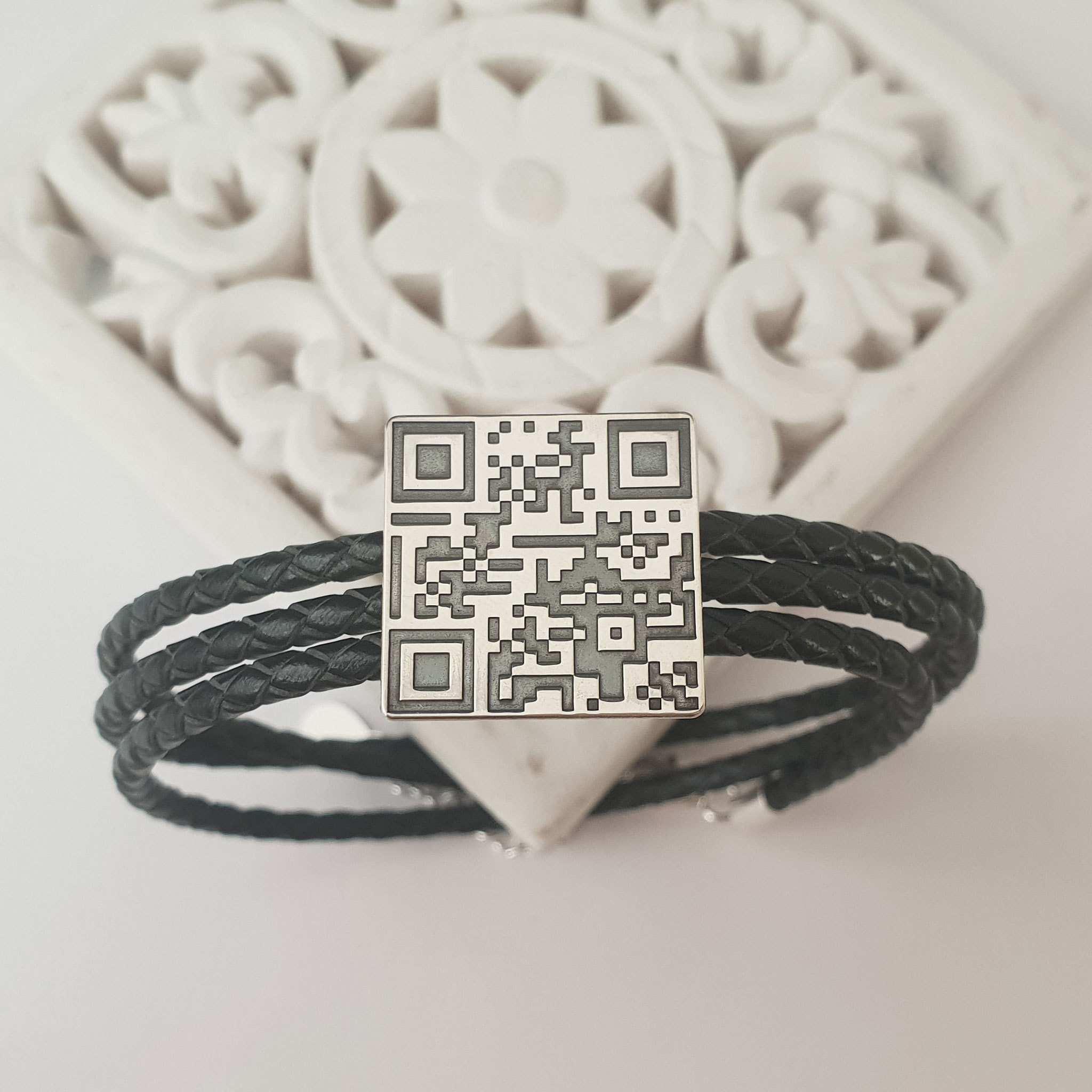 Bratara barbati - personalizata cu QR code - Argint 925 si Piele impletita