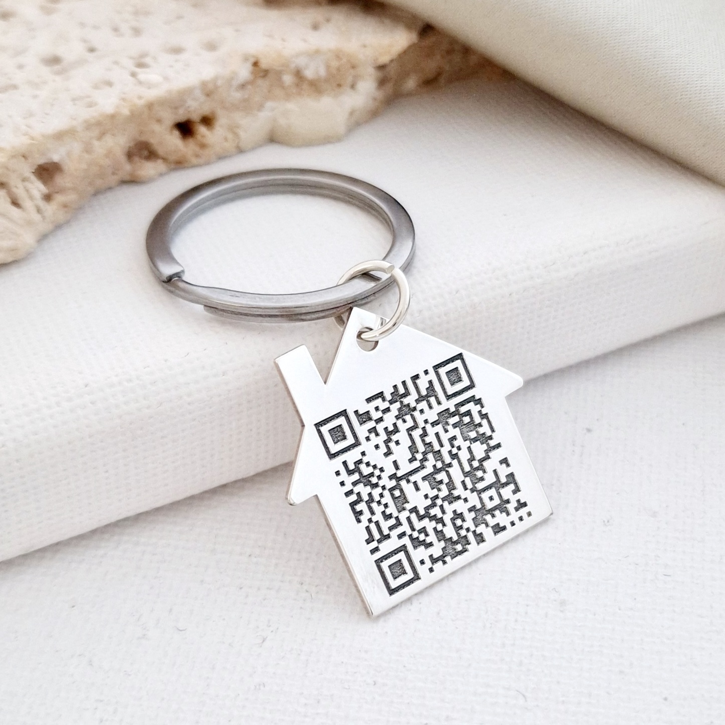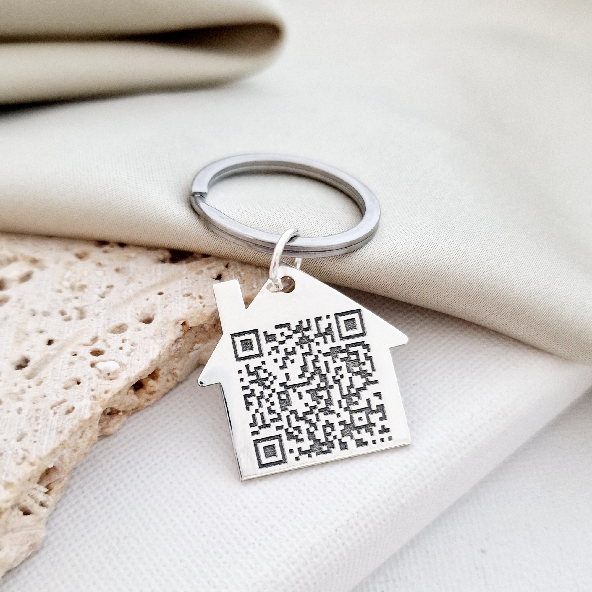 Breloc Casuta personalizat cu QR code - Argint 925, otel inoxidabil
