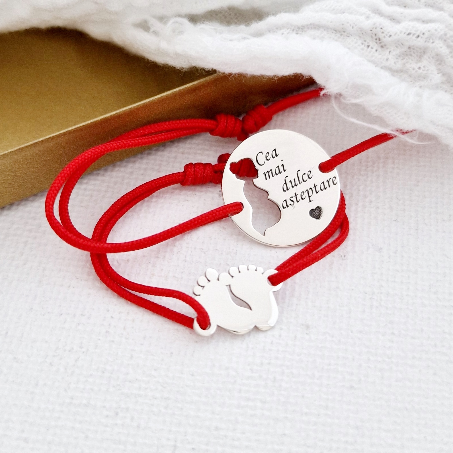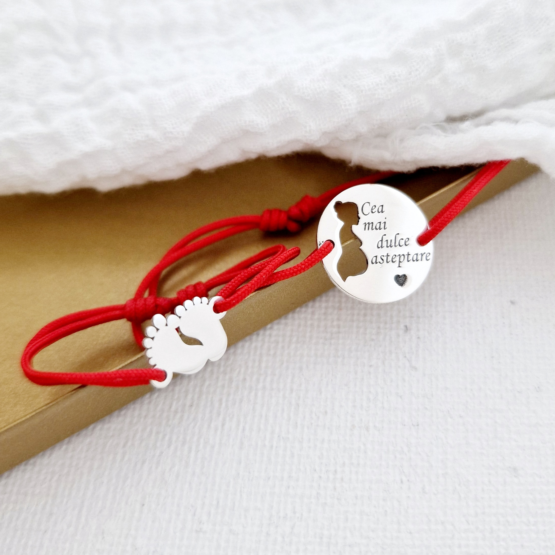 Set 2 bratari - Cea mai dulce asteptare - Bratara banut viitoare mamica 15 mm - Bratara picioruse 10x12 mm bebe - Argint 925 - snur reglabil