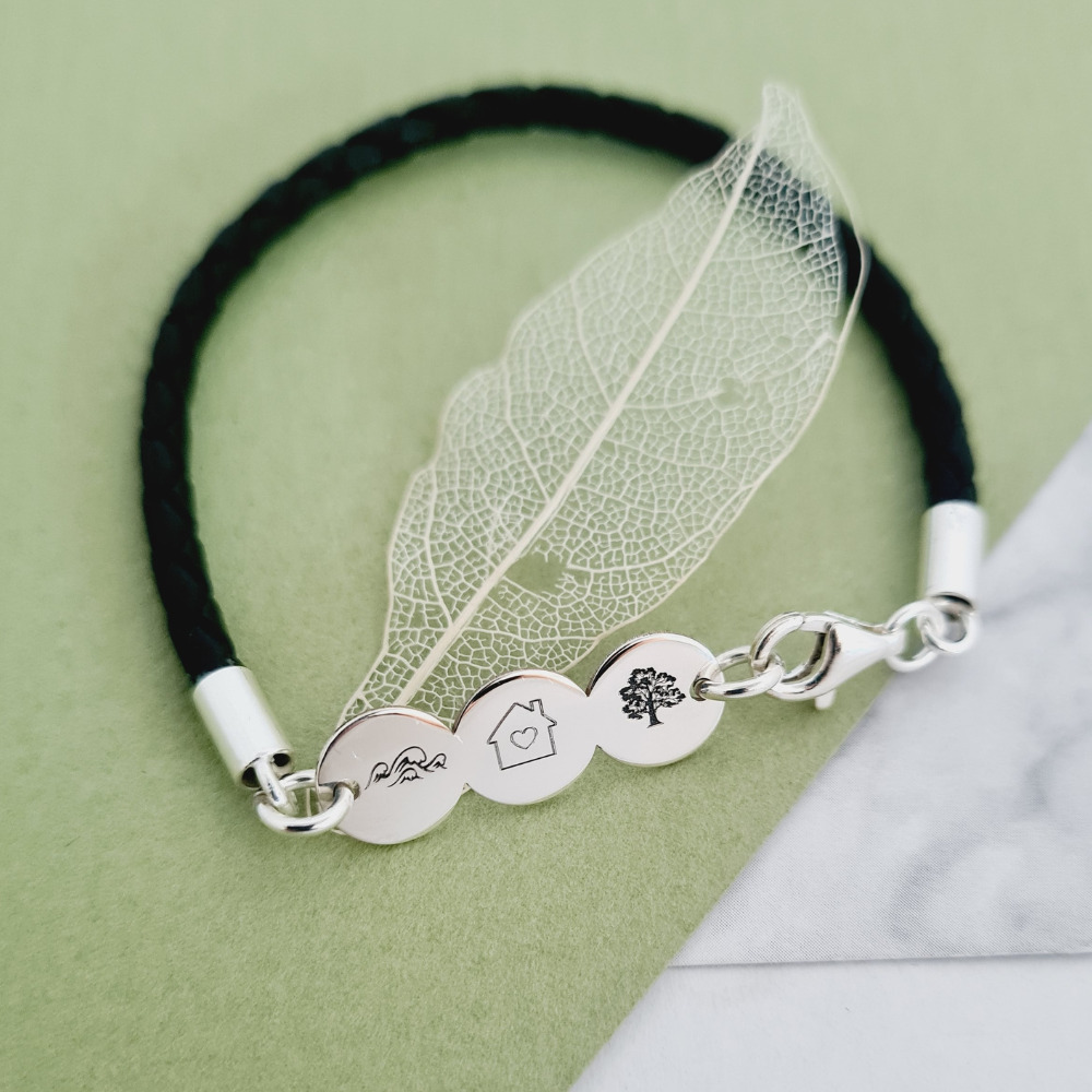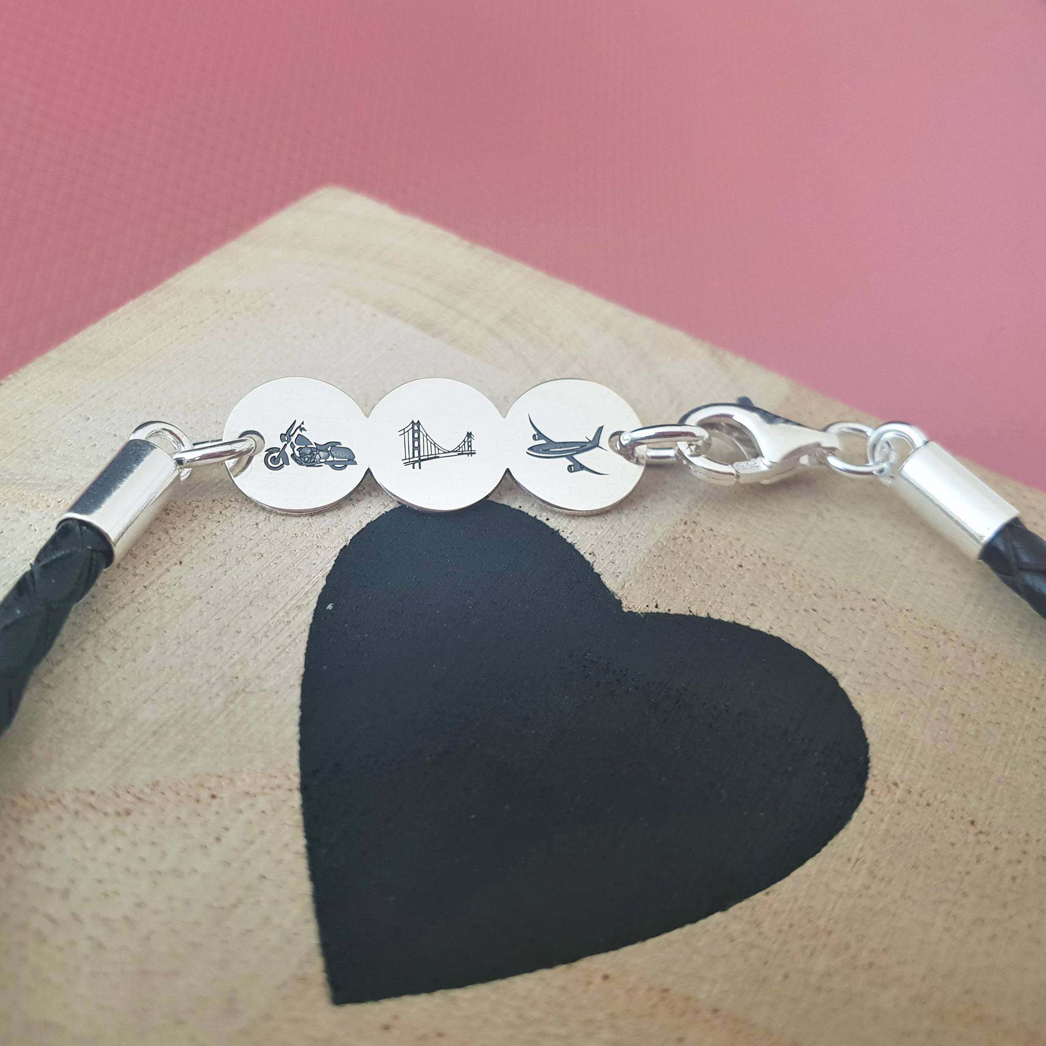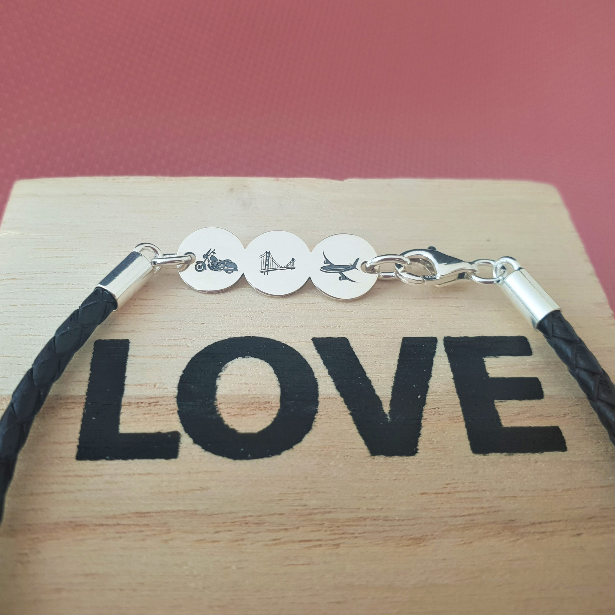 Bratara 3 banuti - 3 pasiuni gravate - Argint 925, piele impletita