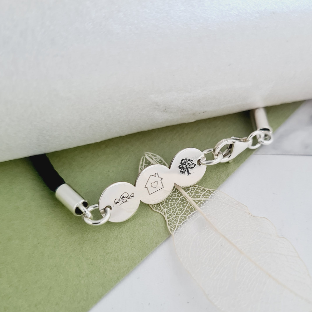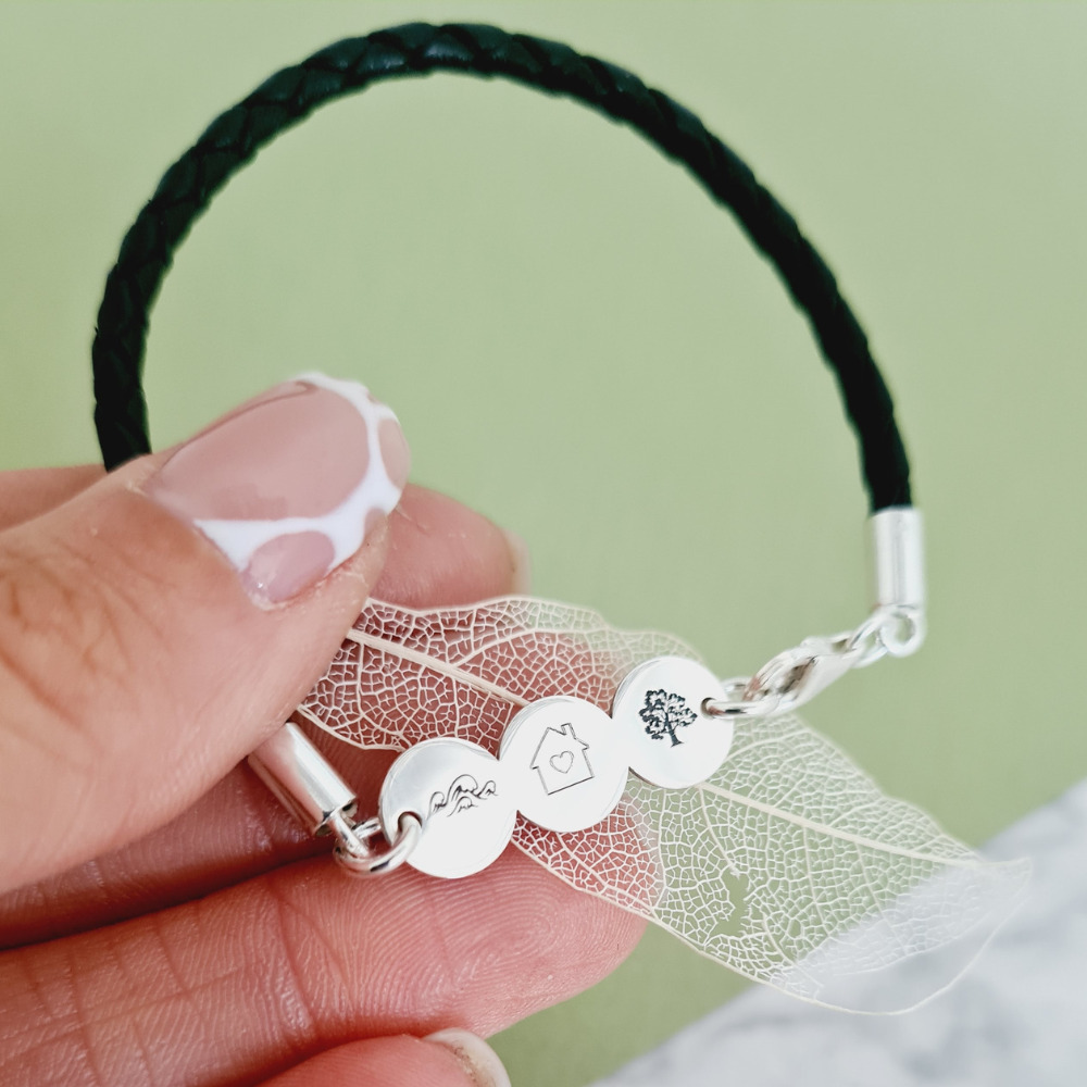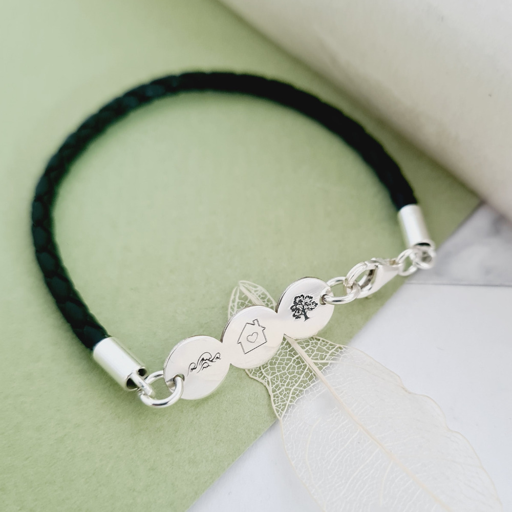 Bratara 3 banuti - 3 pasiuni gravate - Argint 925, piele impletita