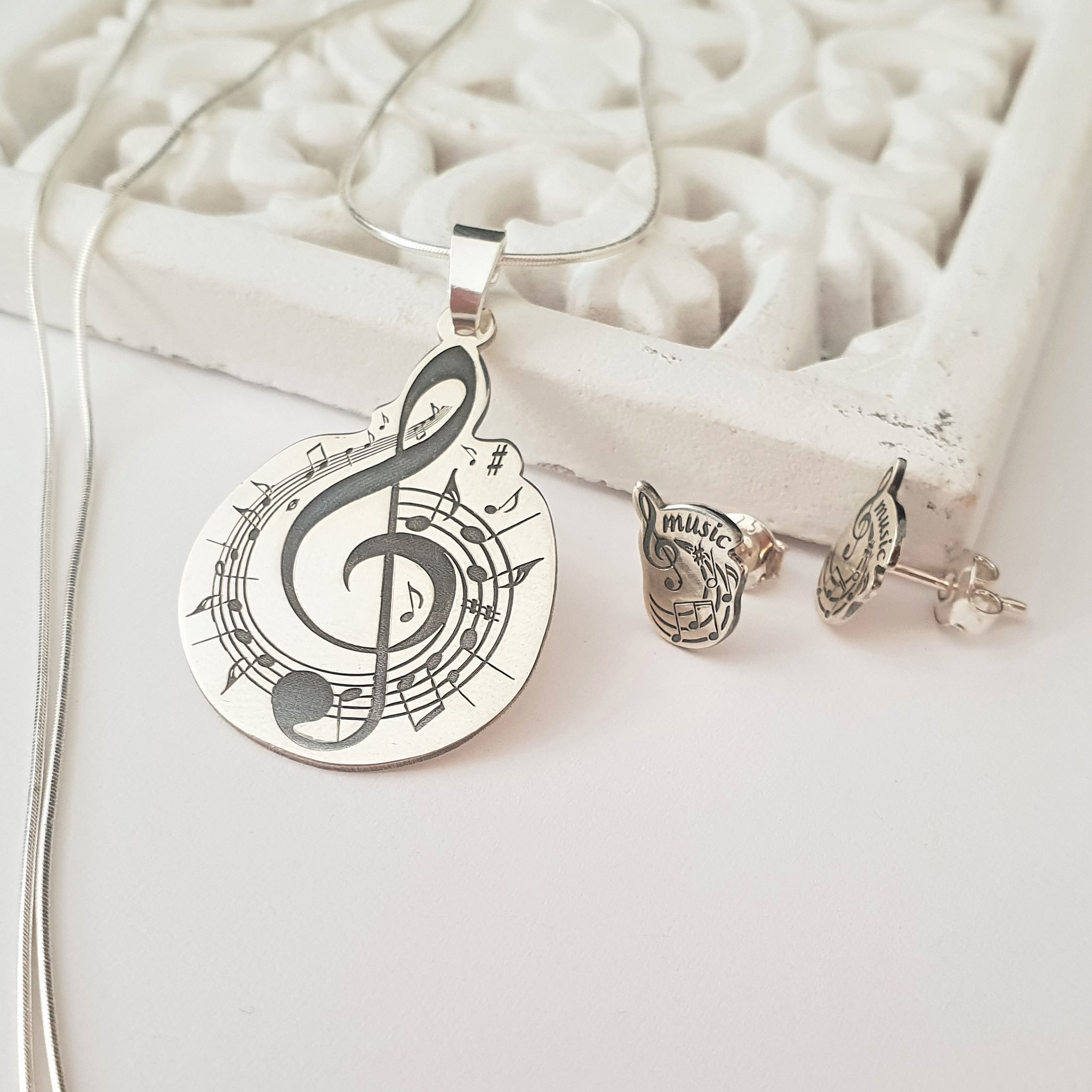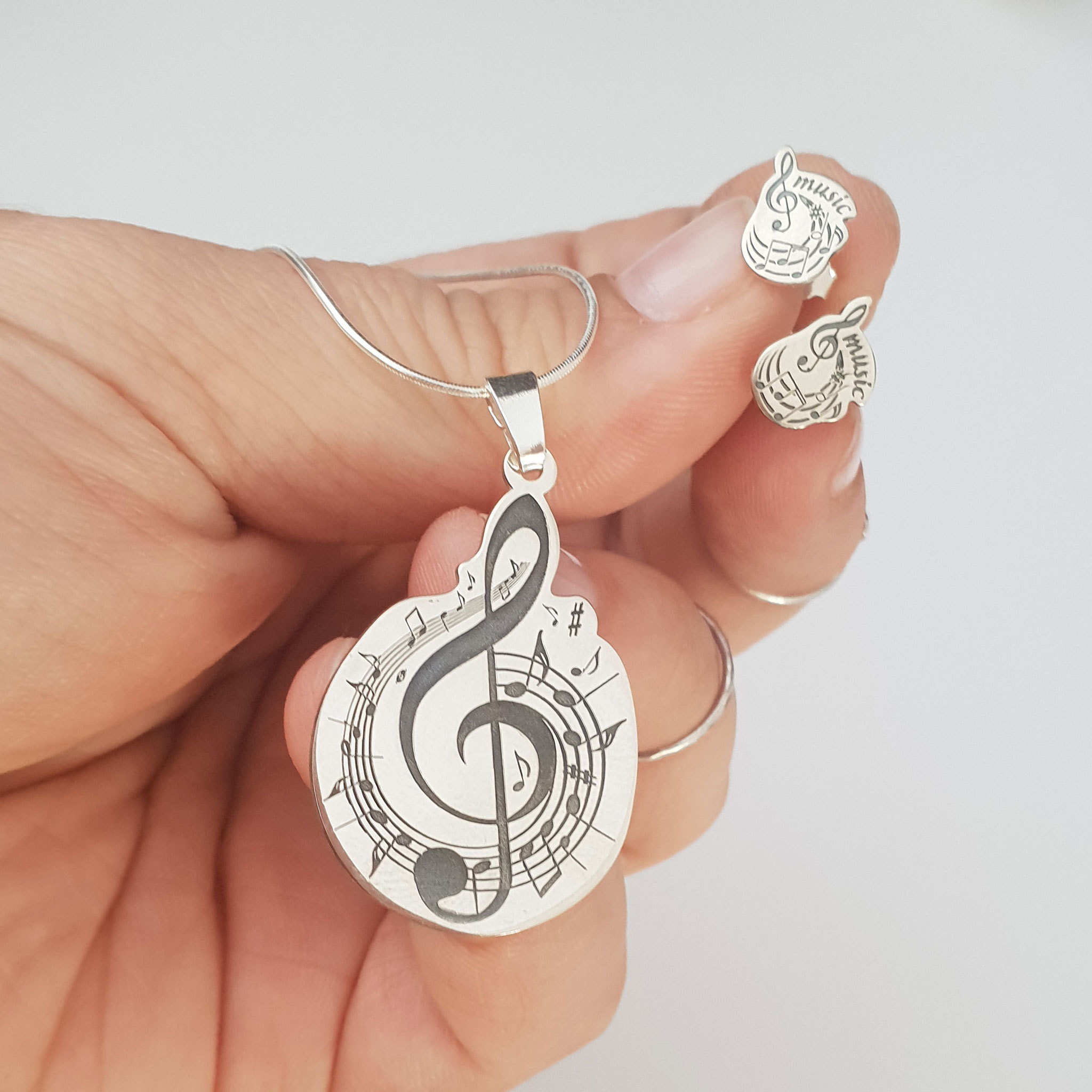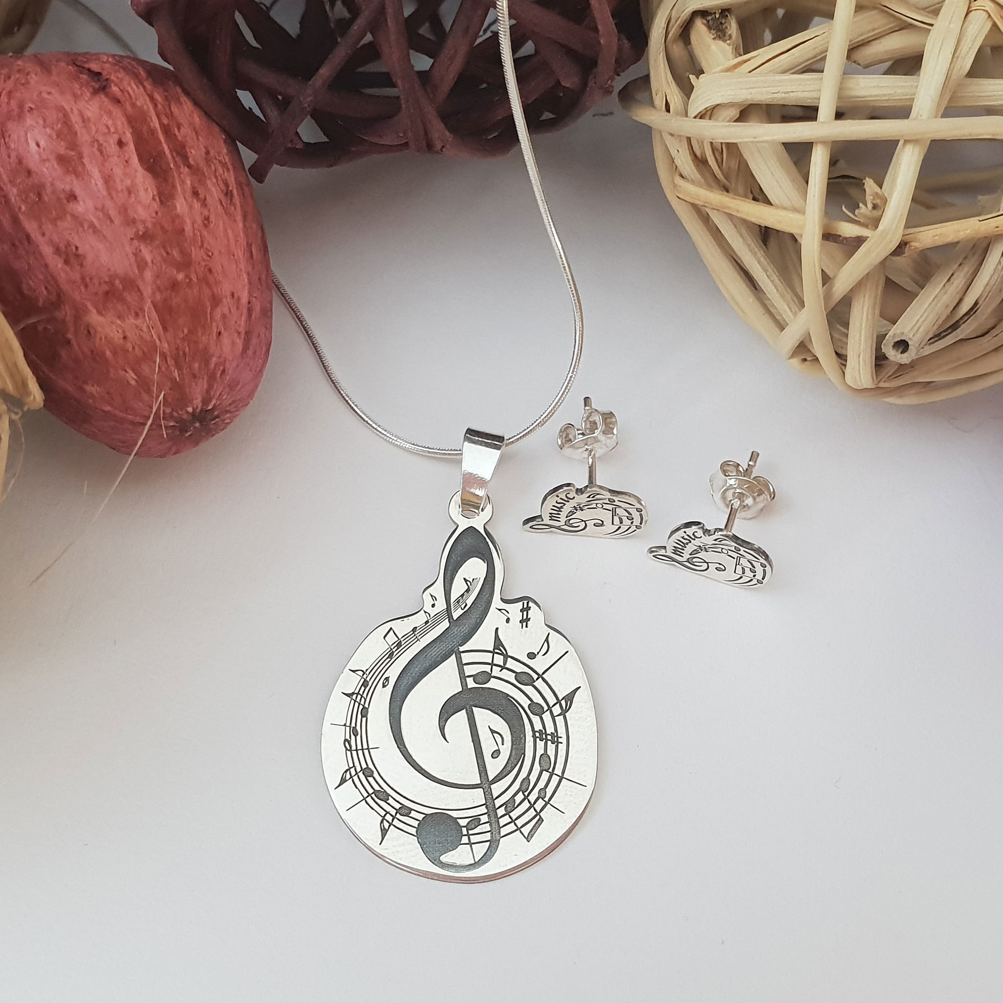 Set personalizat lantisor si cercei - Cheia Sol cu portativ si note muzicale - Argint 925