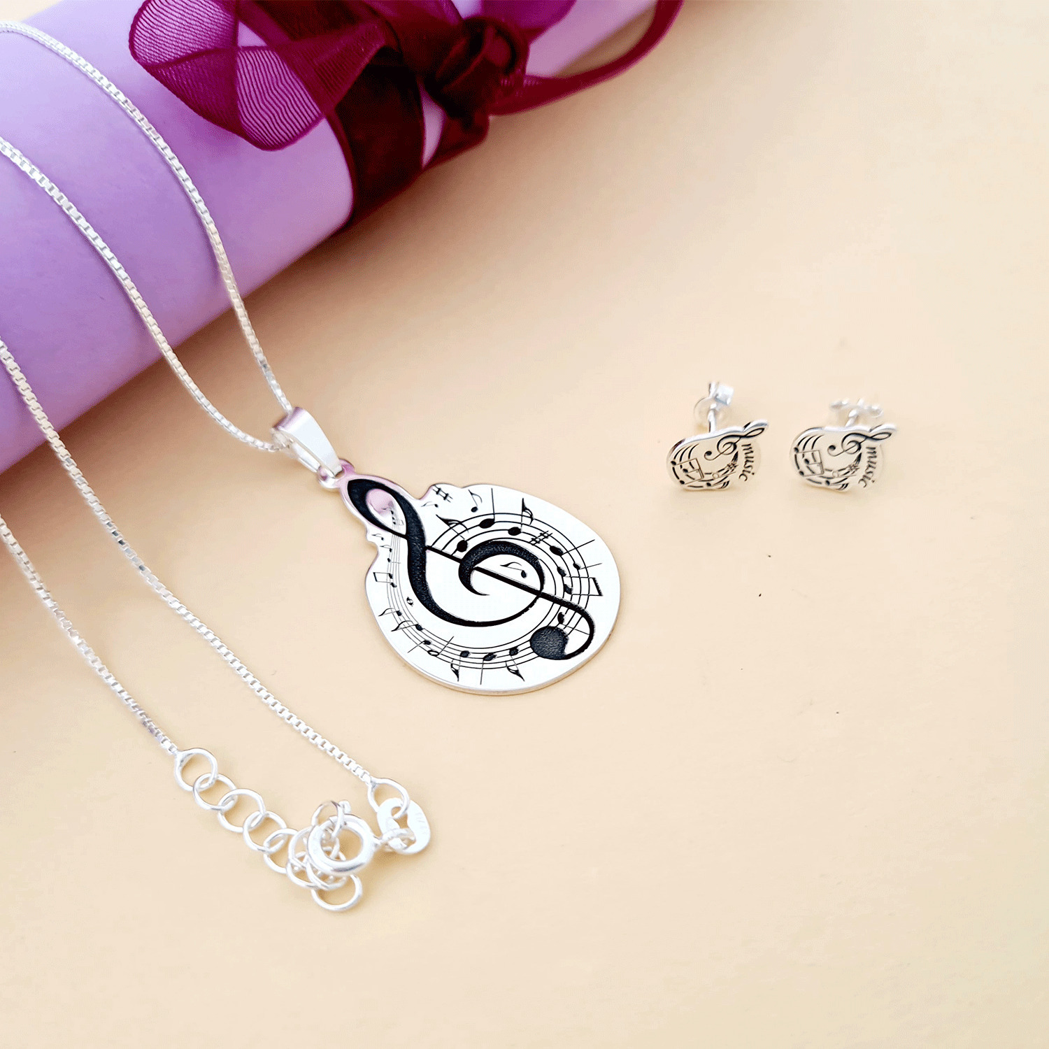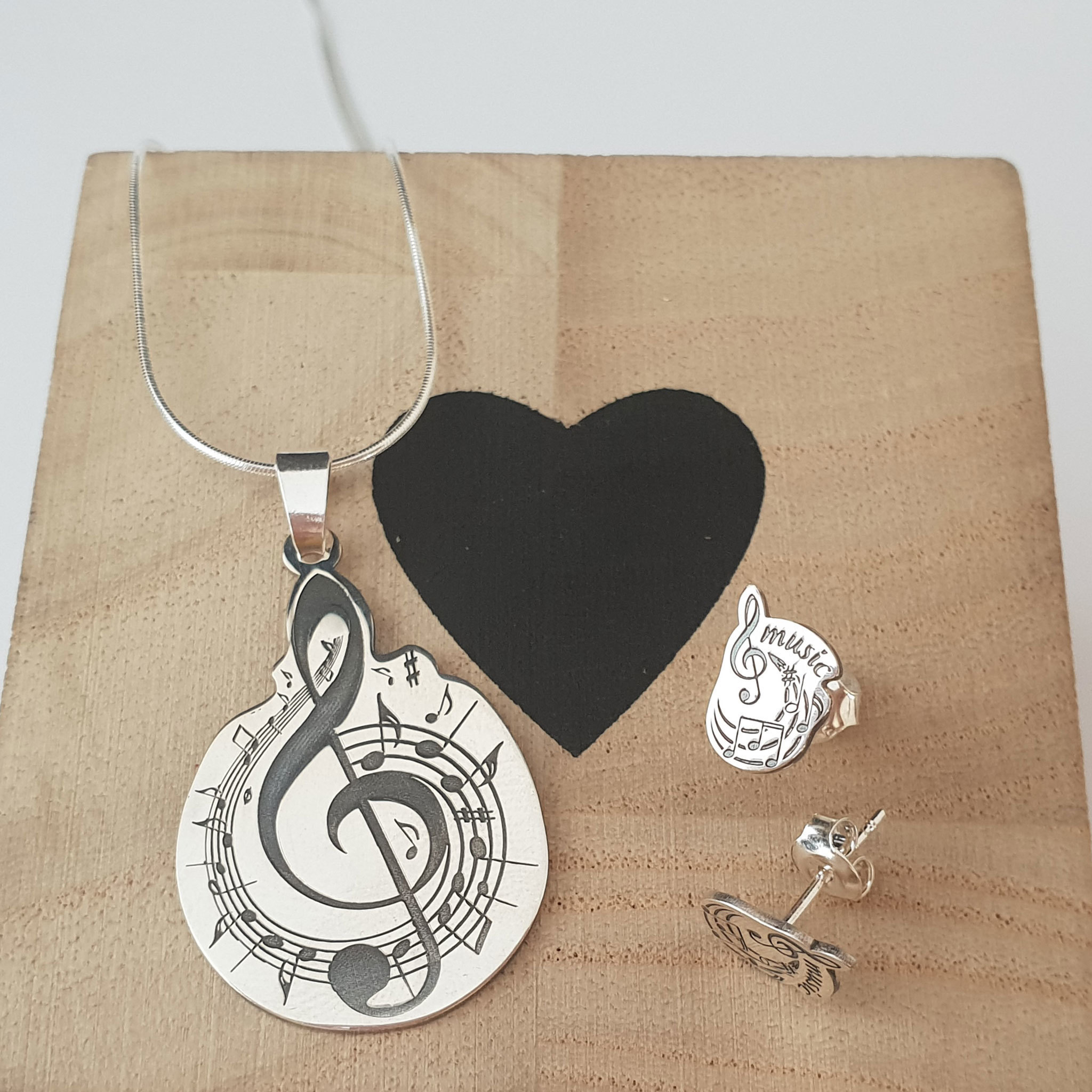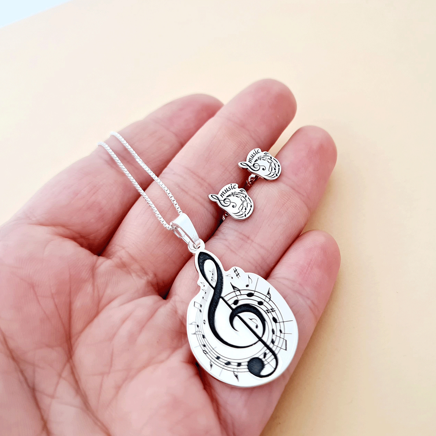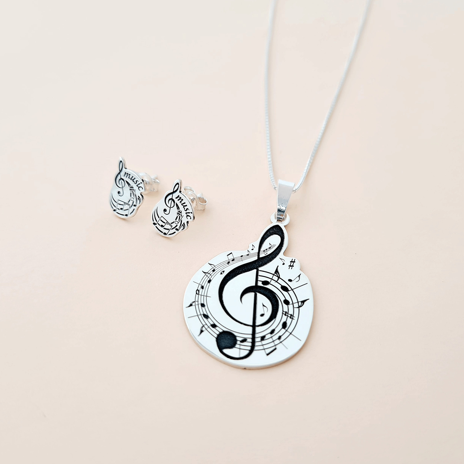 Set personalizat lantisor si cercei - Cheia Sol cu portativ si note muzicale - Argint 925