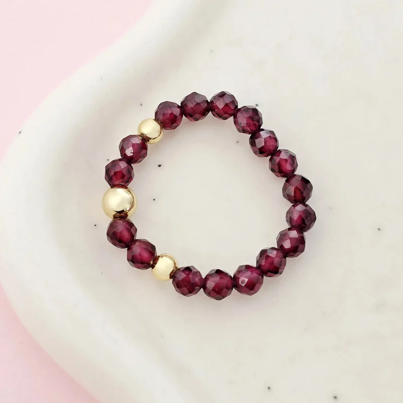 - Inelul este realizata dintr-un sirag de pietre Granat si trei bilute din Argint placat cu Aur Galben 18K.