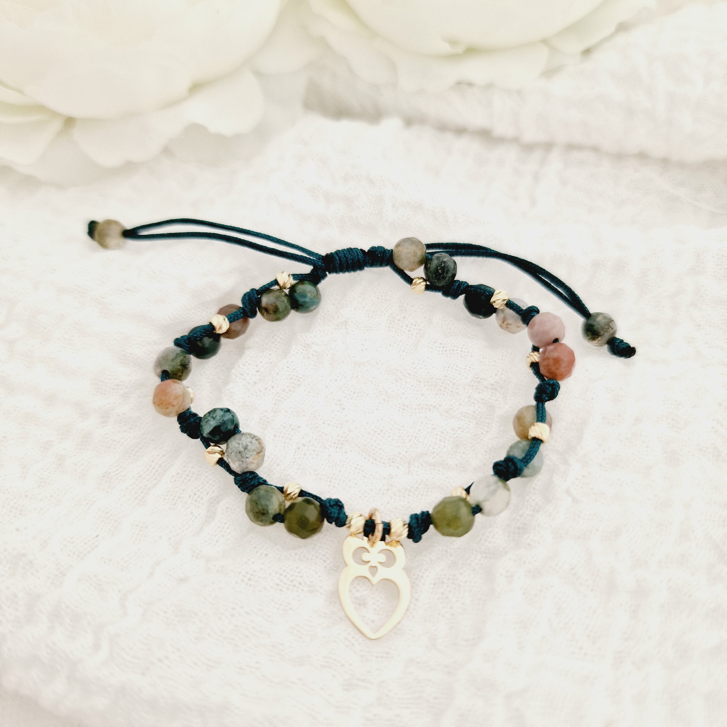 O brățară rafinată, încrustată cu agat fatetat și biluțe din aur, însoțită de un pandantiv bufniță, emblema înțelepciunii și protecției.