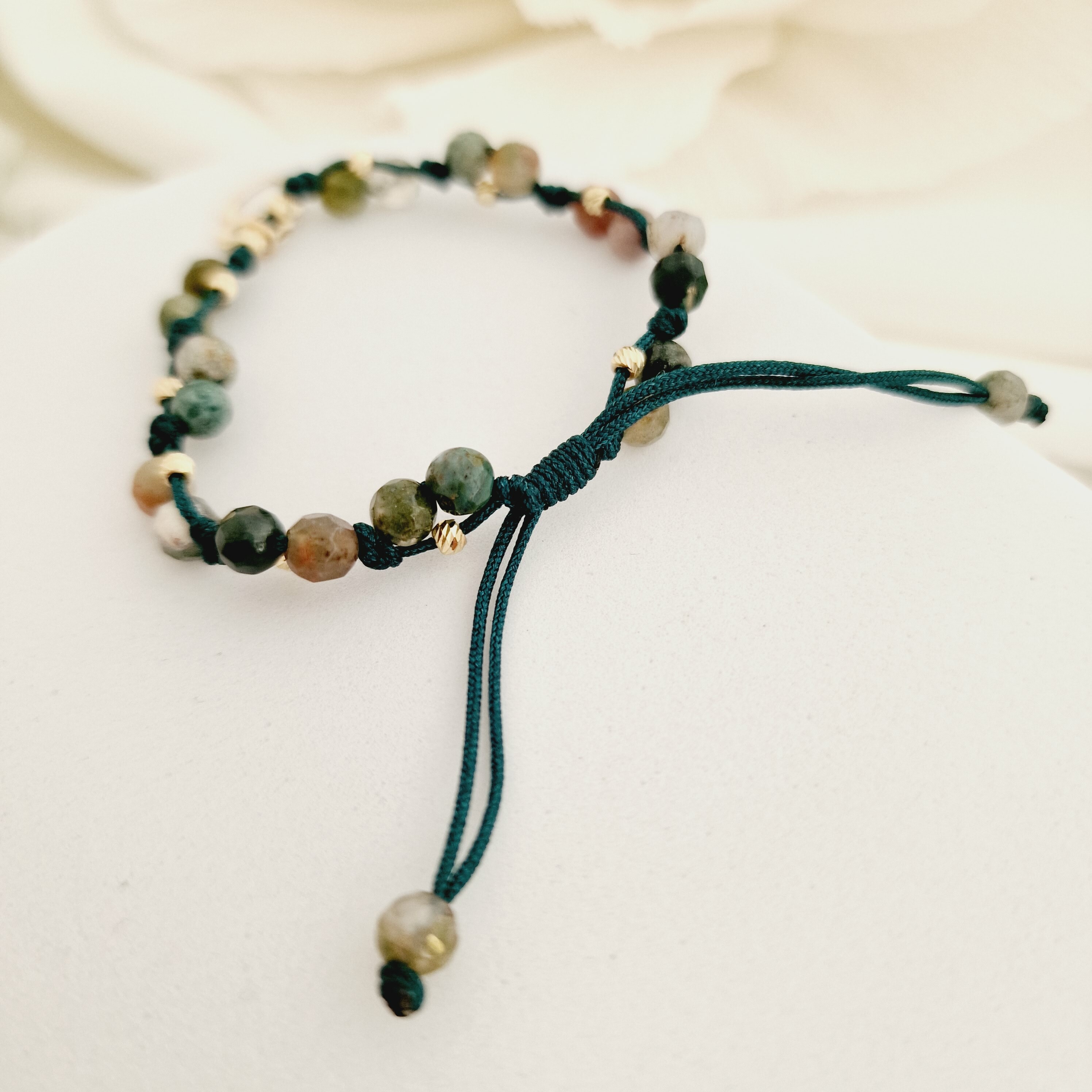 - Bratara este creata dintr-un sirag de pietre semipretioase Agat fatetat alaturi 12 bilute de 2.5 mm din Aur Galben 14K.