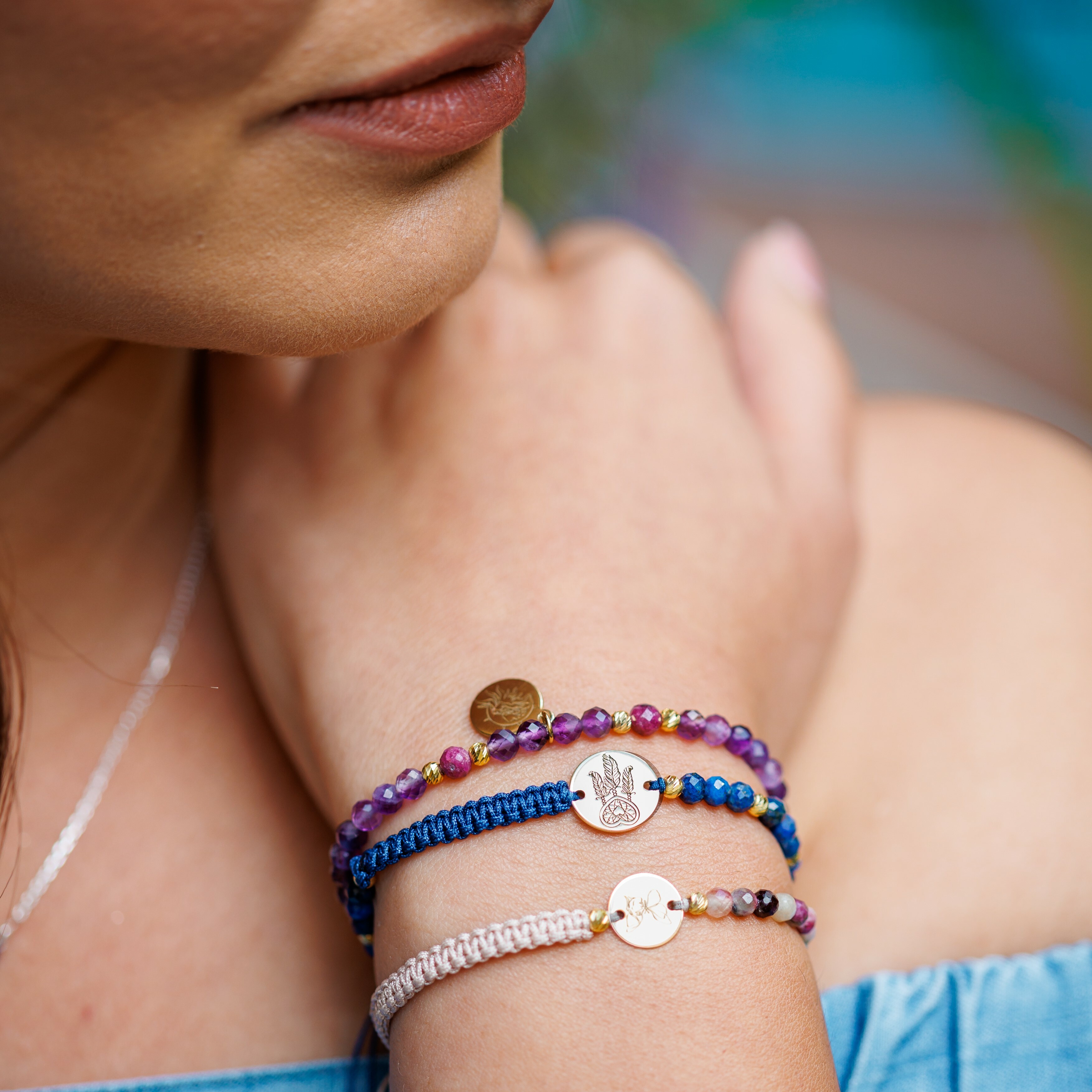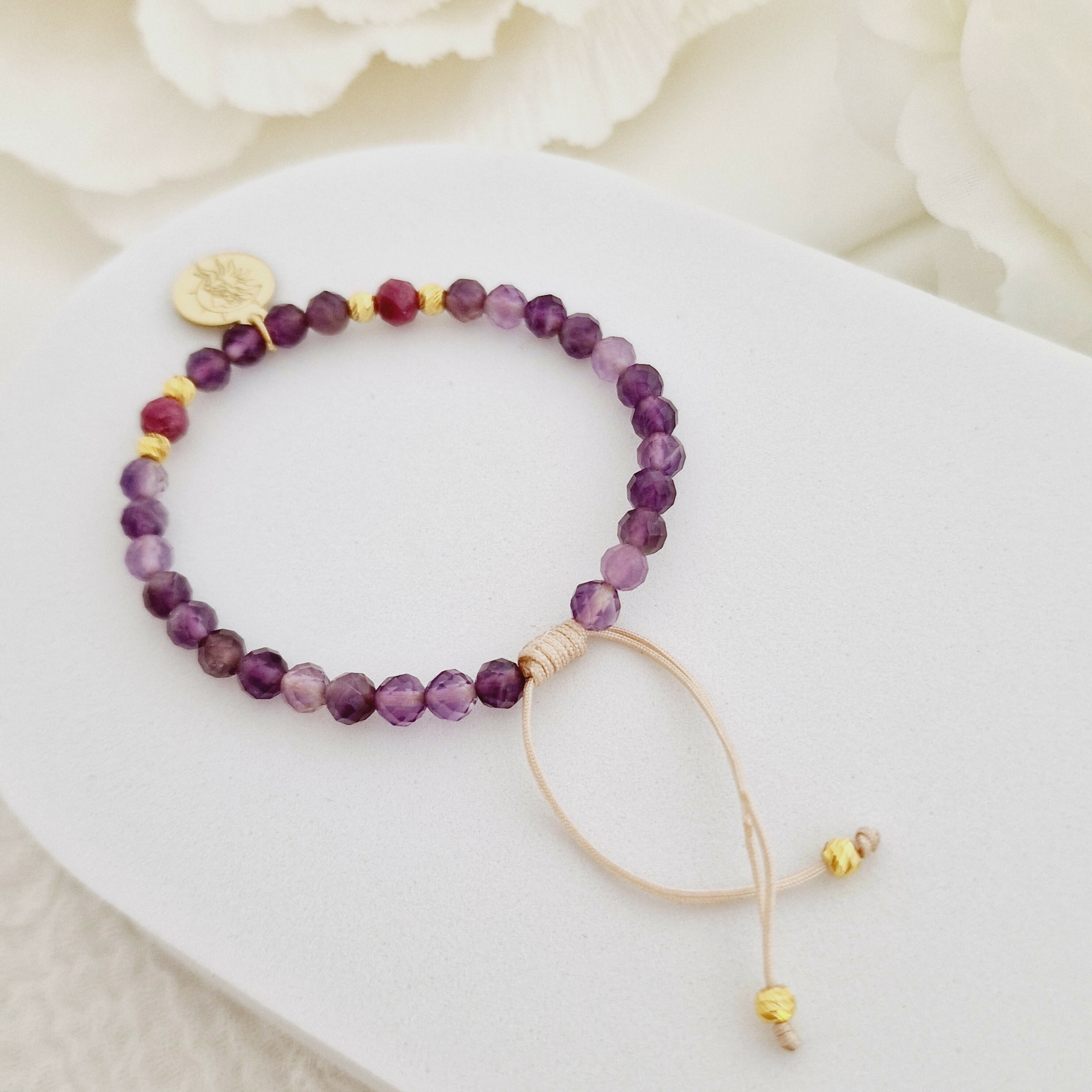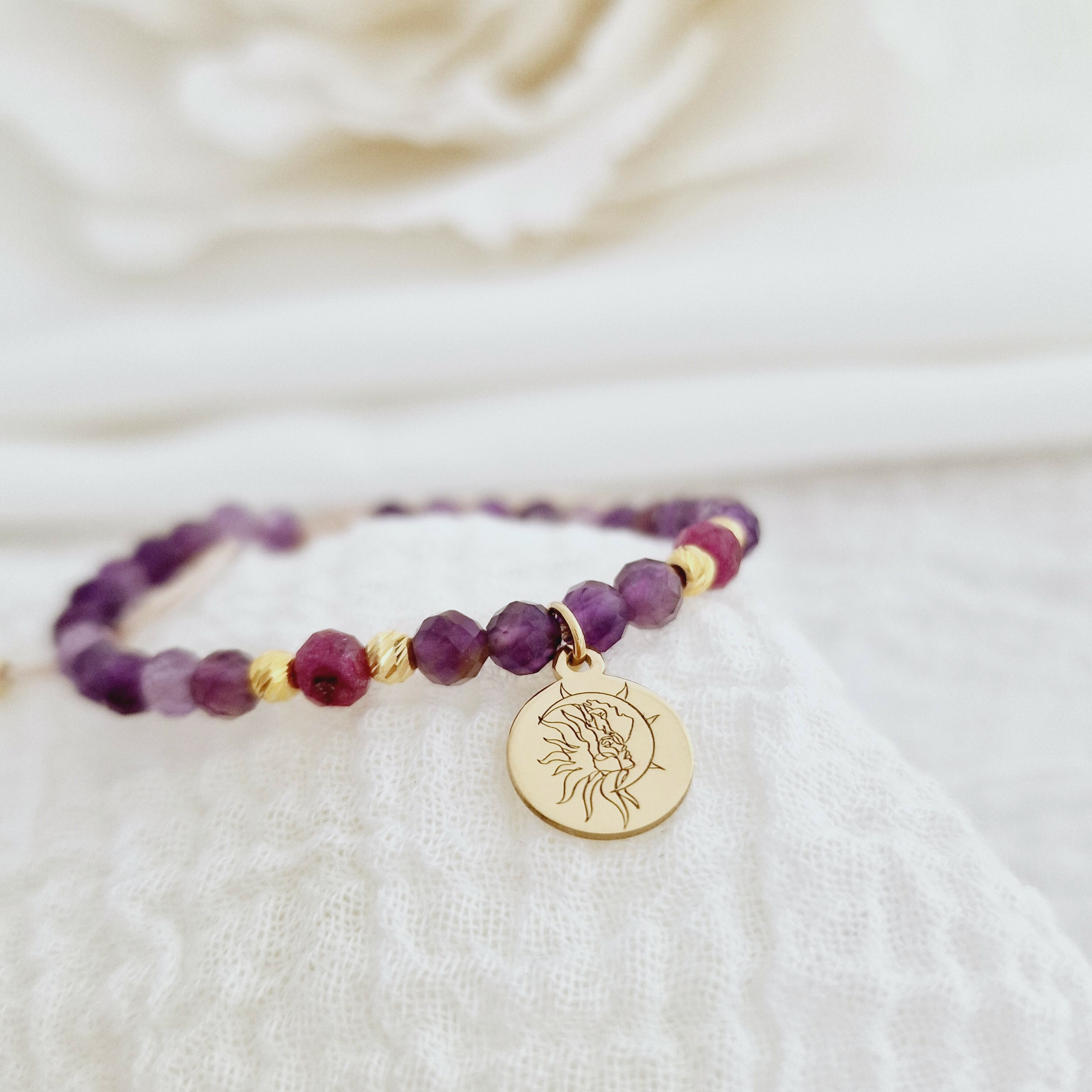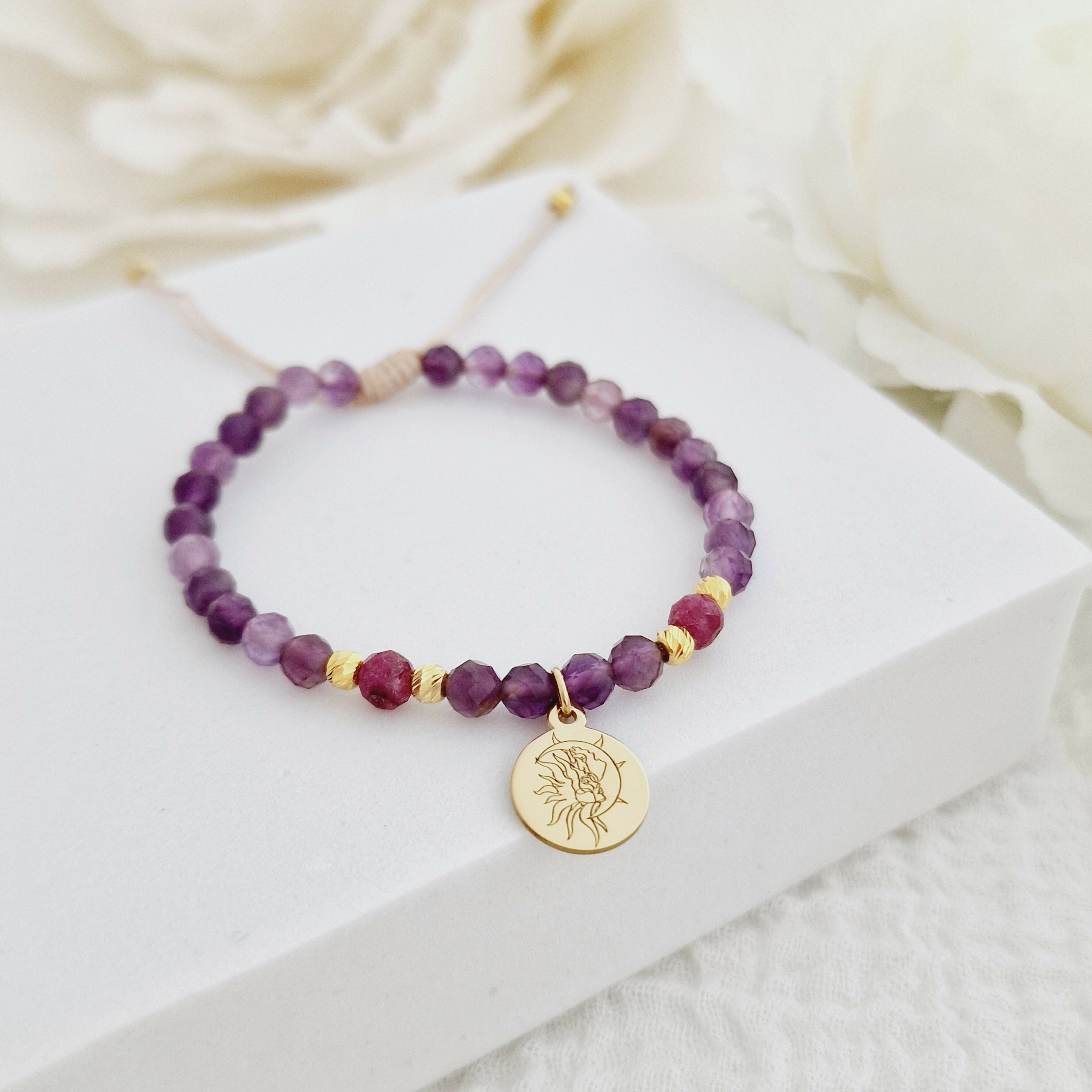 Bratara Vitalitate - Imbratisare Luna&Soare - Charm si bilute 2.5 mm din Argint 925 placat cu Aur Galben 18k - Pietre semiprețioase Rubin & Ametist fatetat - Snur nude