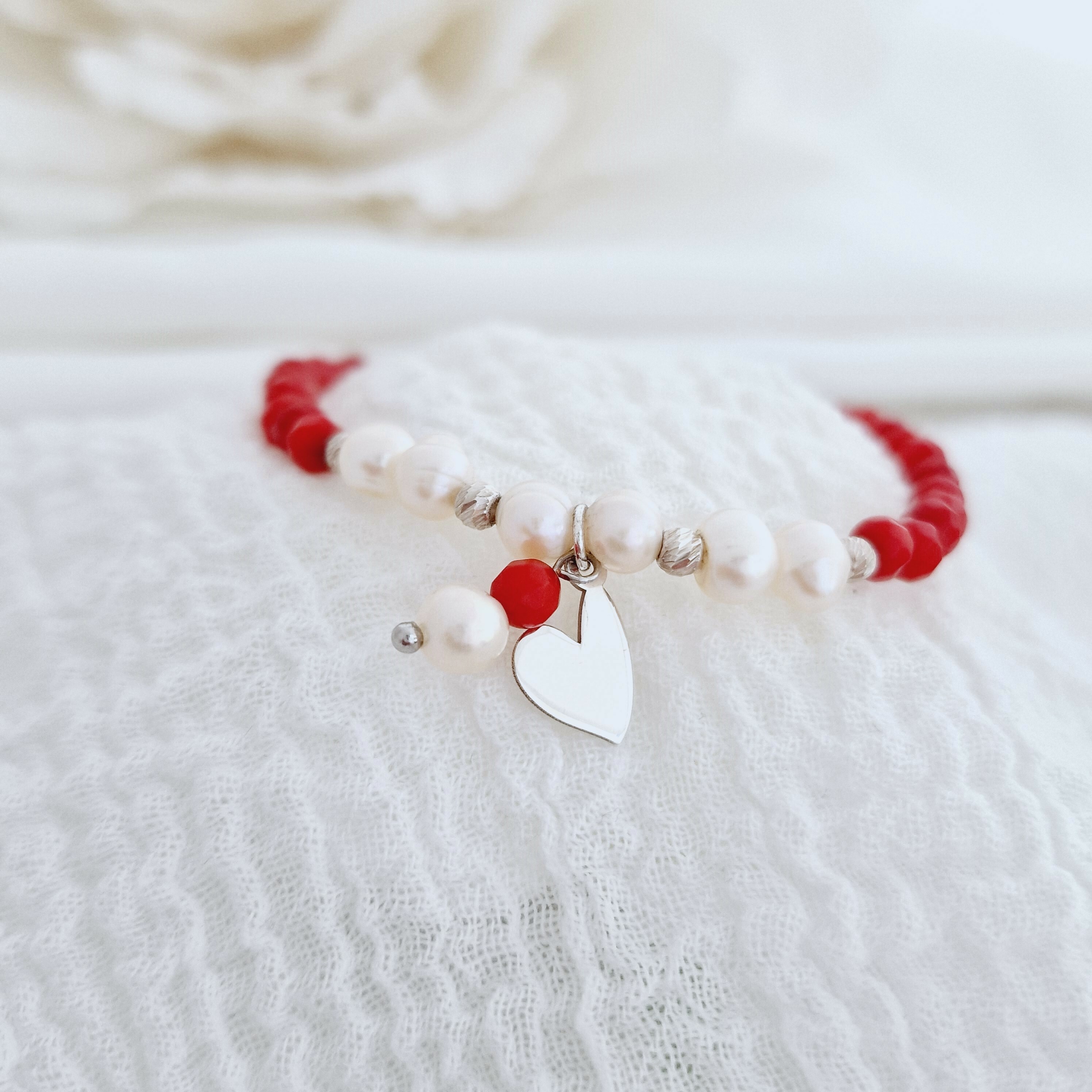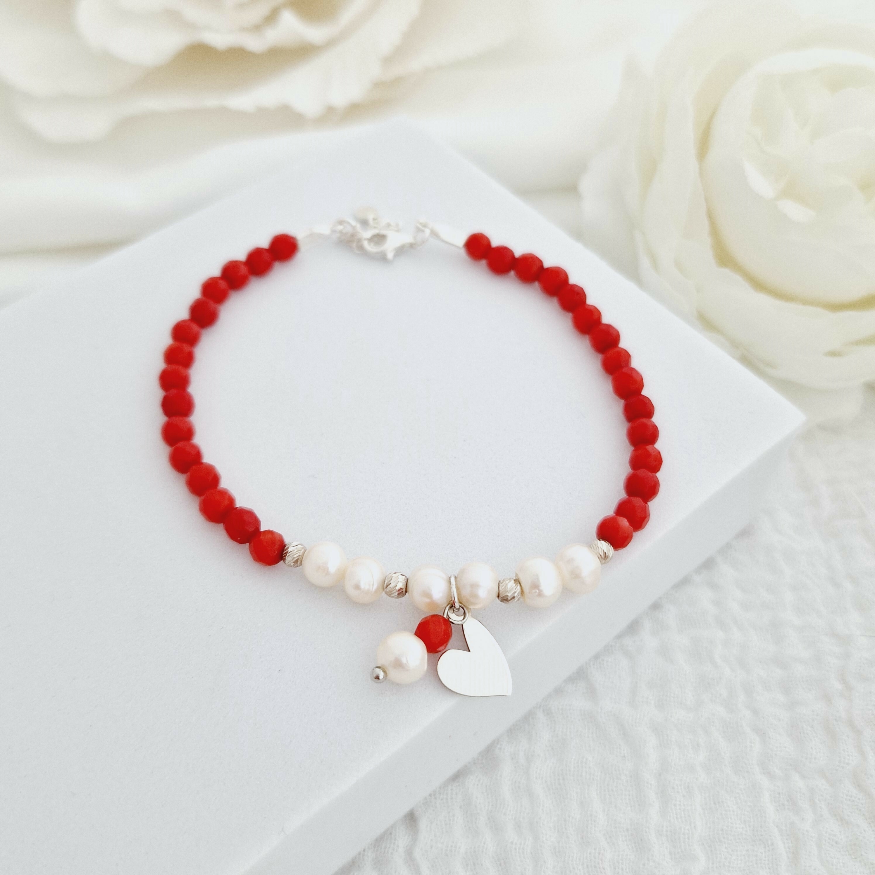 Bratara Vitalitate - Iubire margaritara - Perle, bilute 2.5 mm si charm inima din Argint 925 - Pietre semipretioase Coral - Inchizatoare carabina cu prelungire
