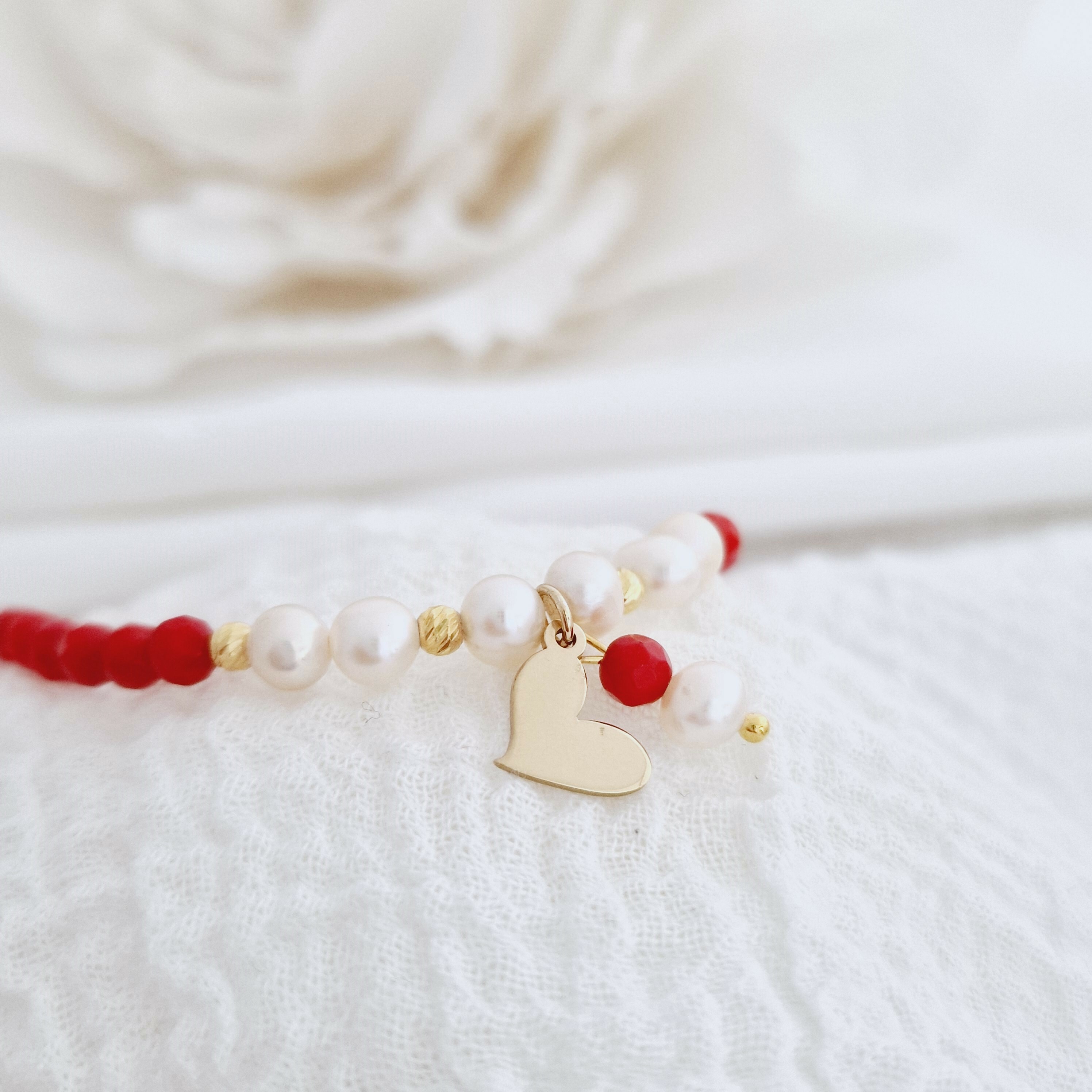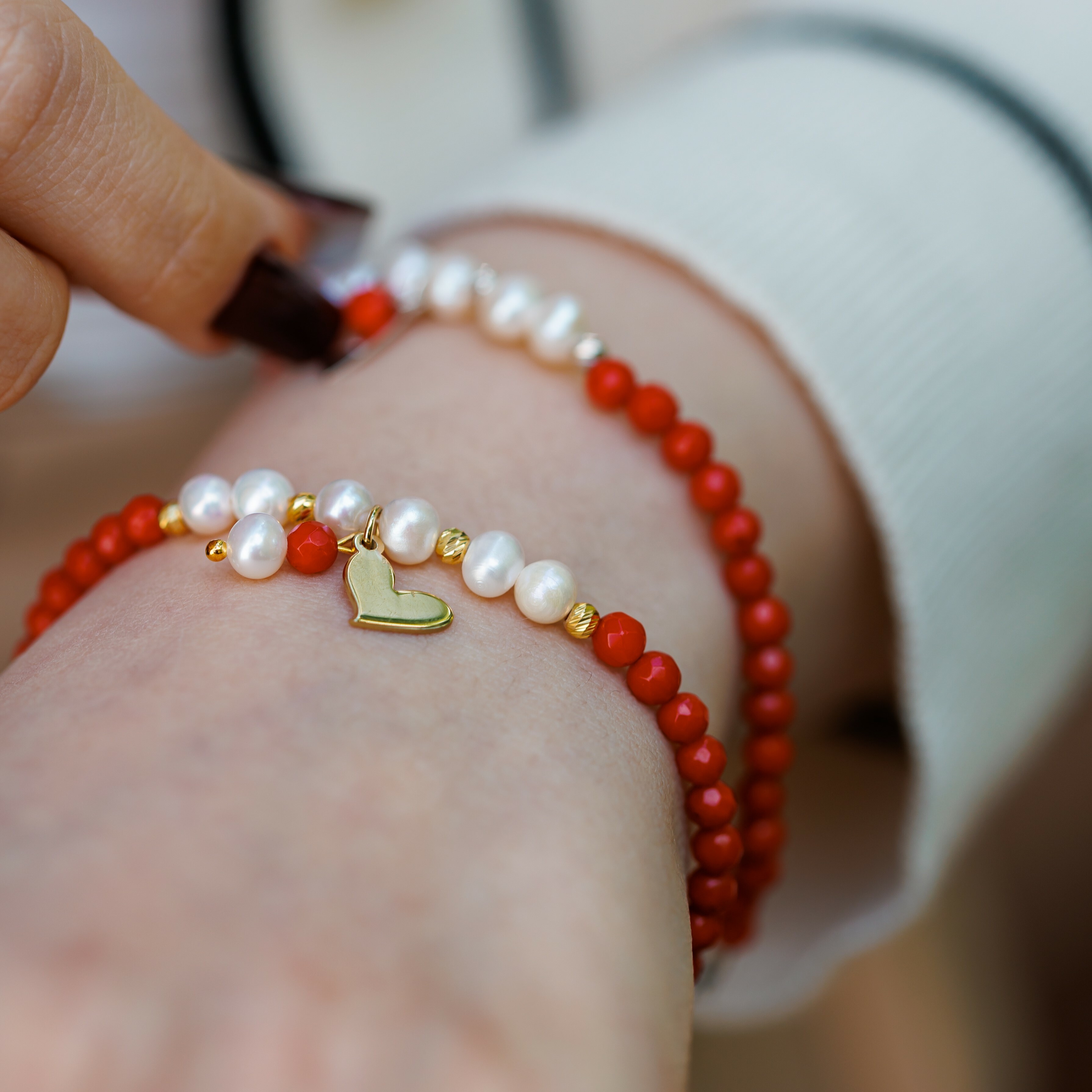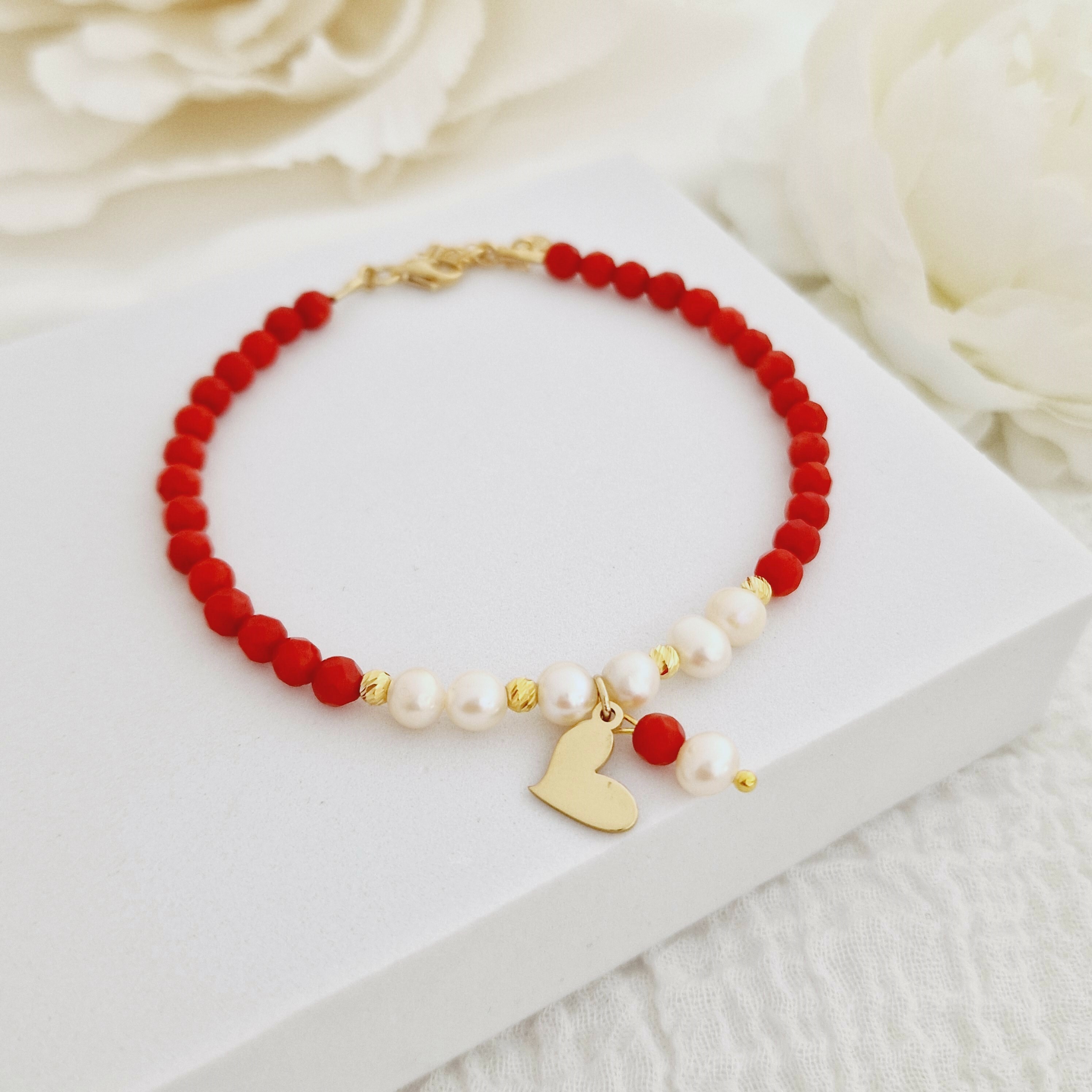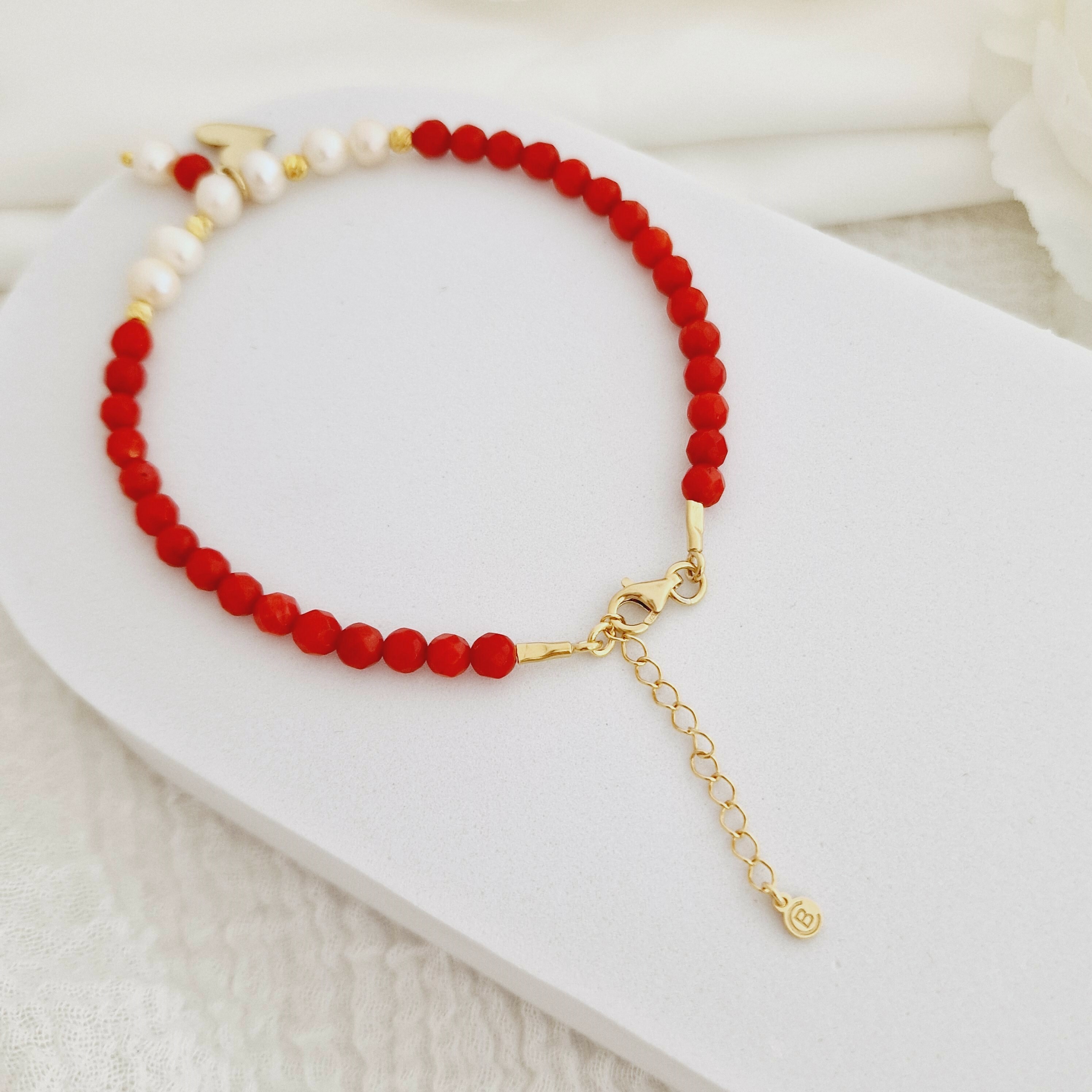 Bratara Vitalitate - Iubire margaritara - Perle, bilute 2.5 mm si charm inima din Argint 925 placat cu Aur Galben 18k - Pietre semipretioase Coral - Inchizatoare carabina cu prelungire