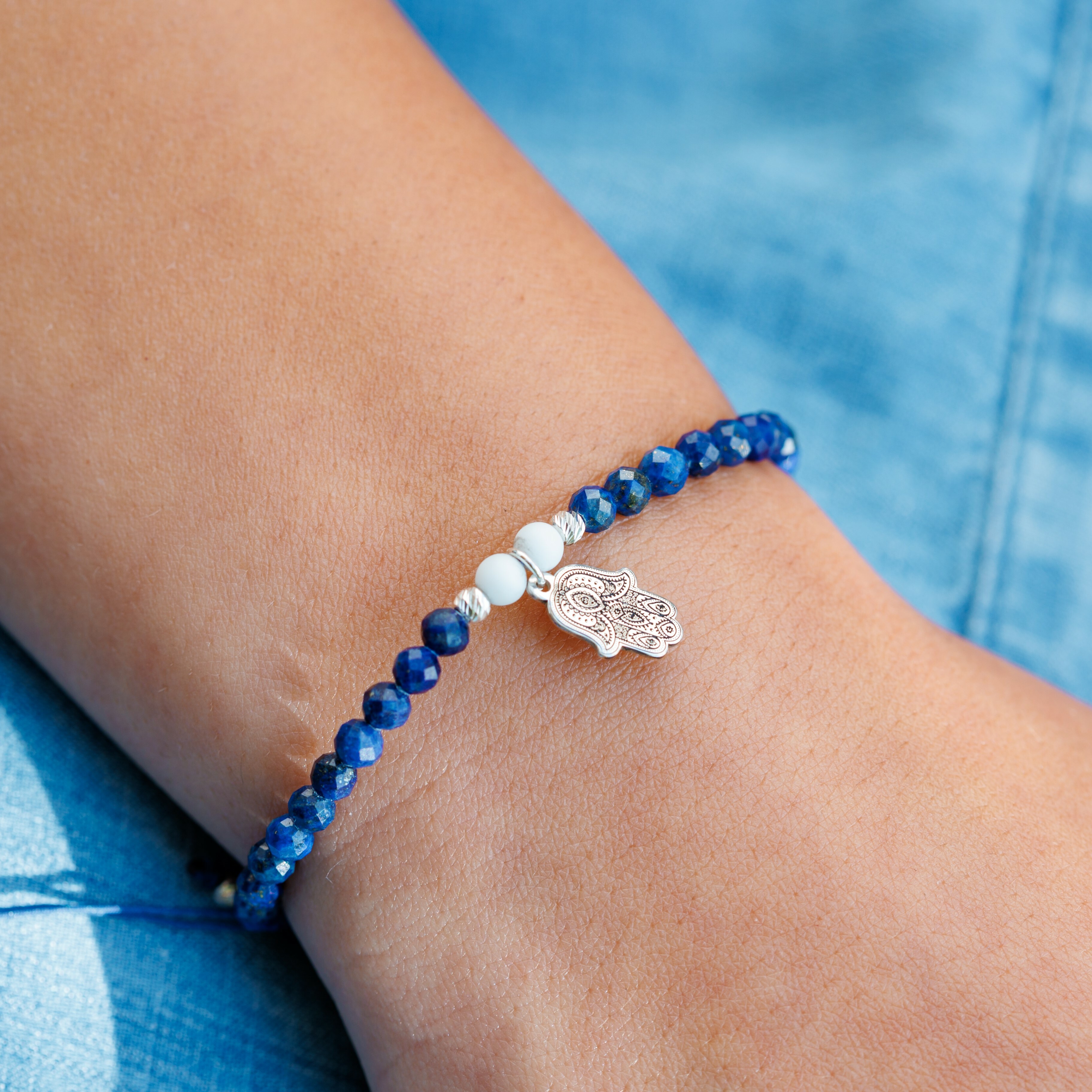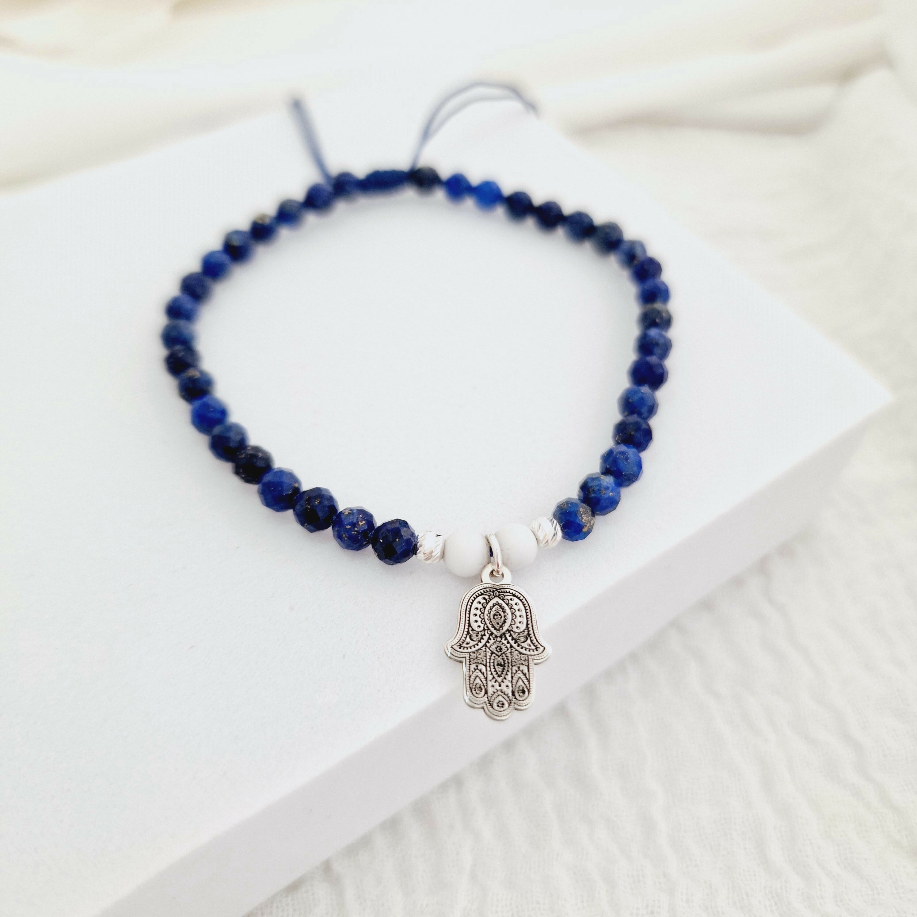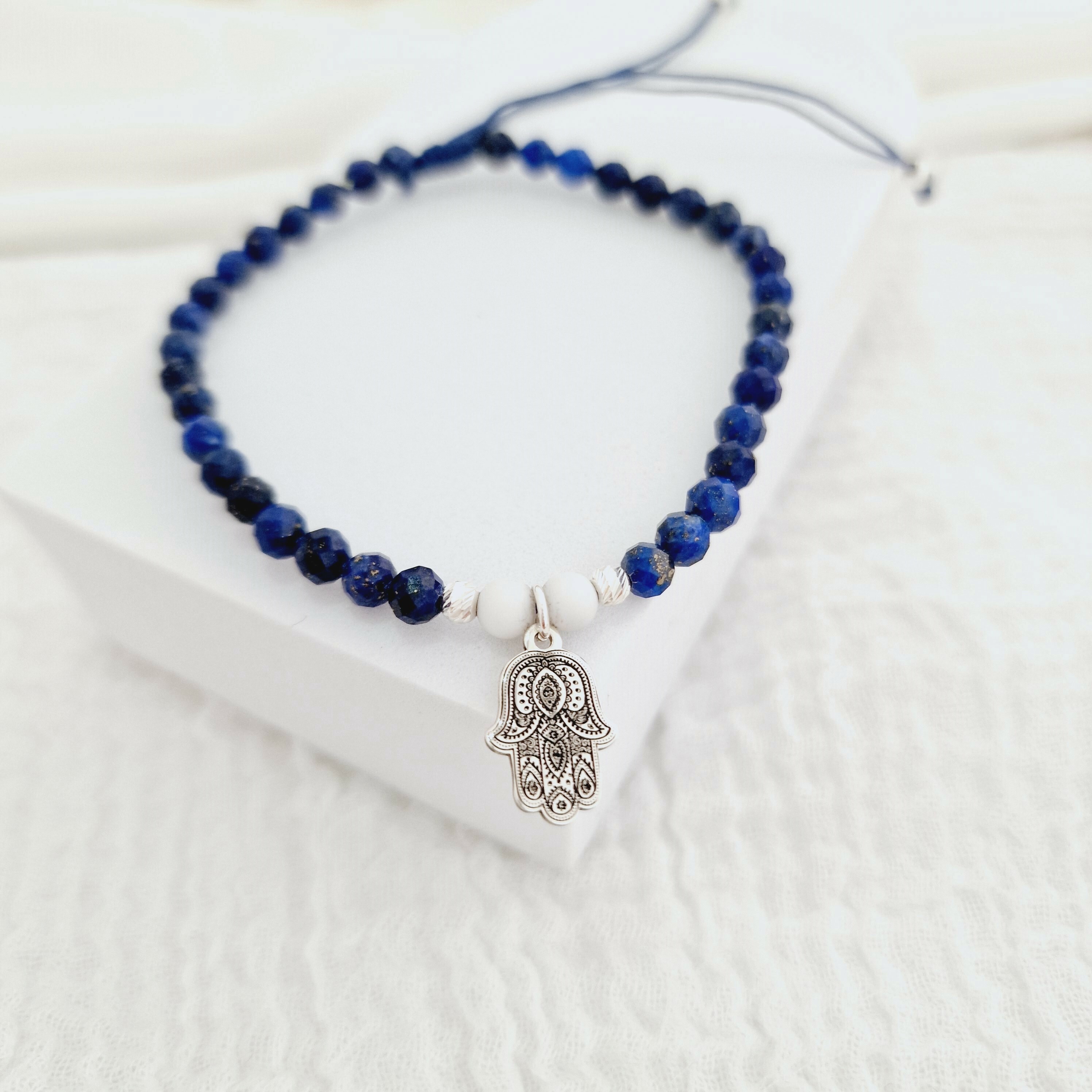 Bratara Vitalitate - Mana lui Fatima - Charm si bilute 2.5 mm din Argint 925 - Pietre semipretioase Lapis Lazuli & Howlit - Snur albastru