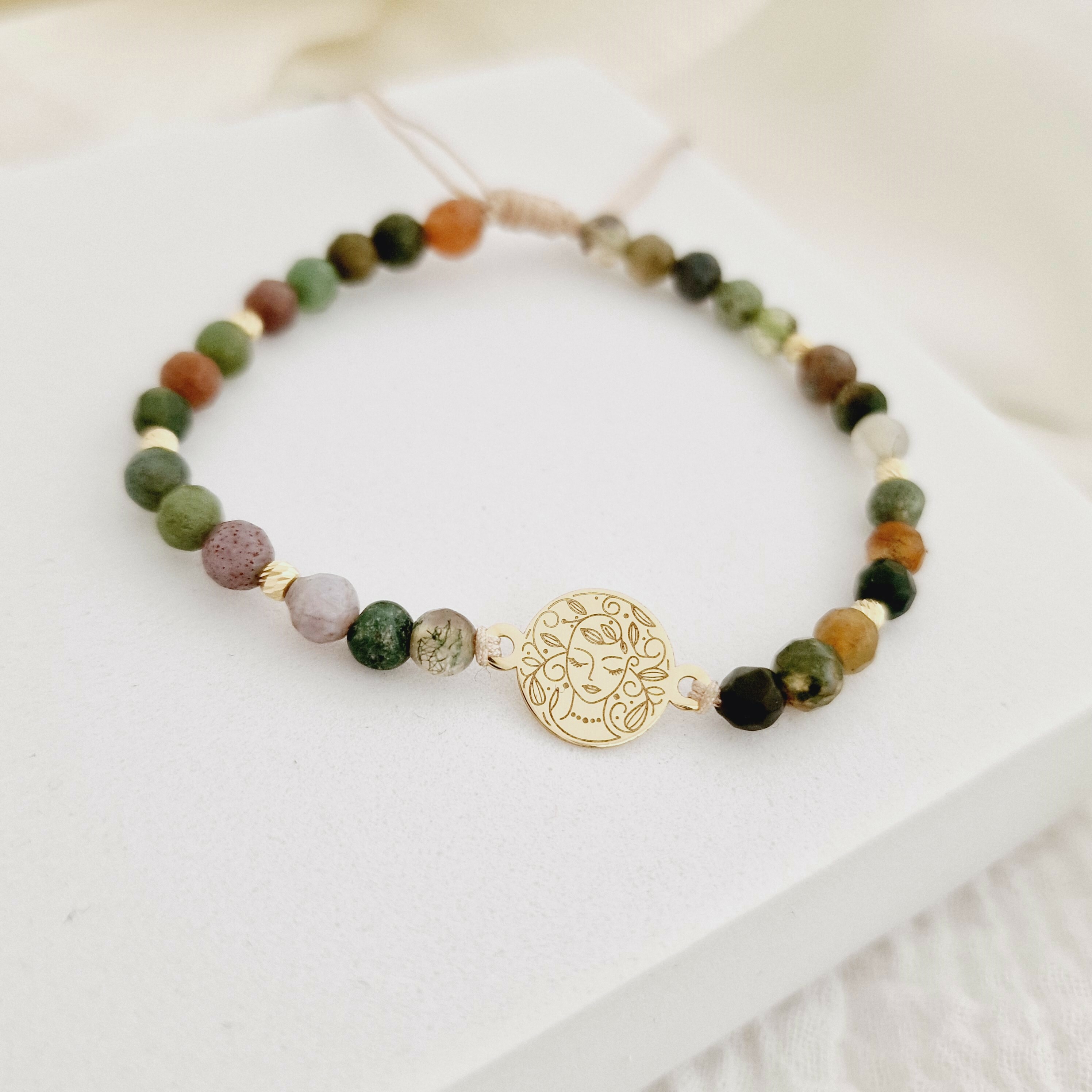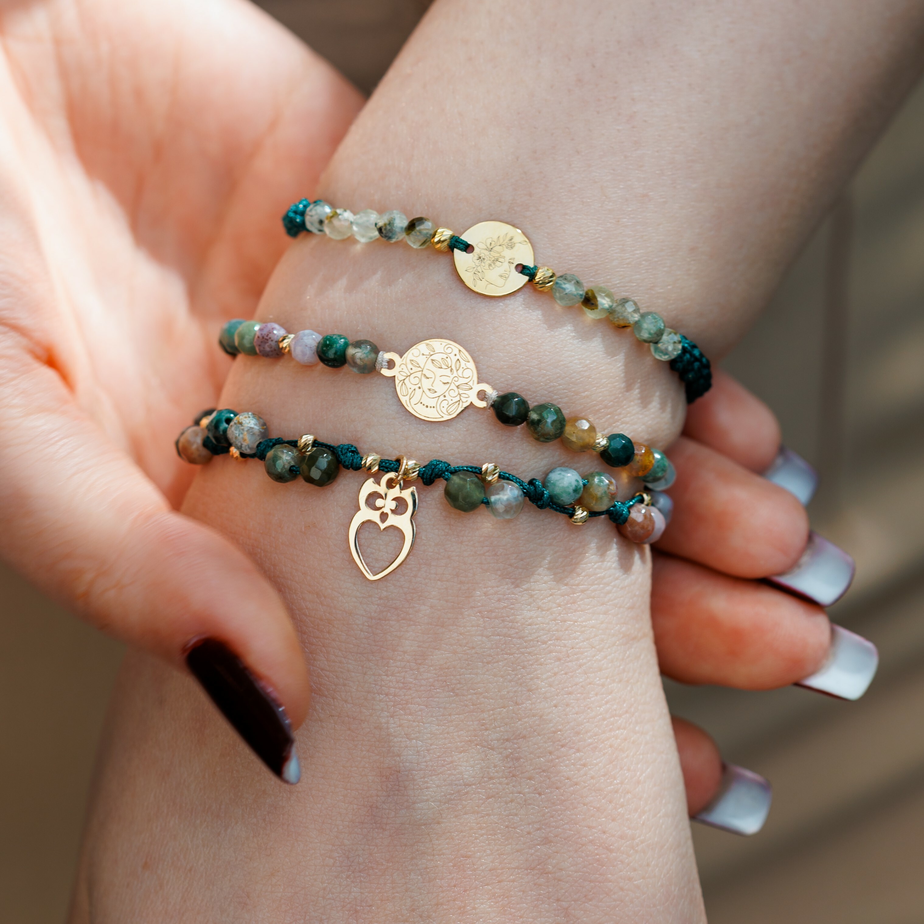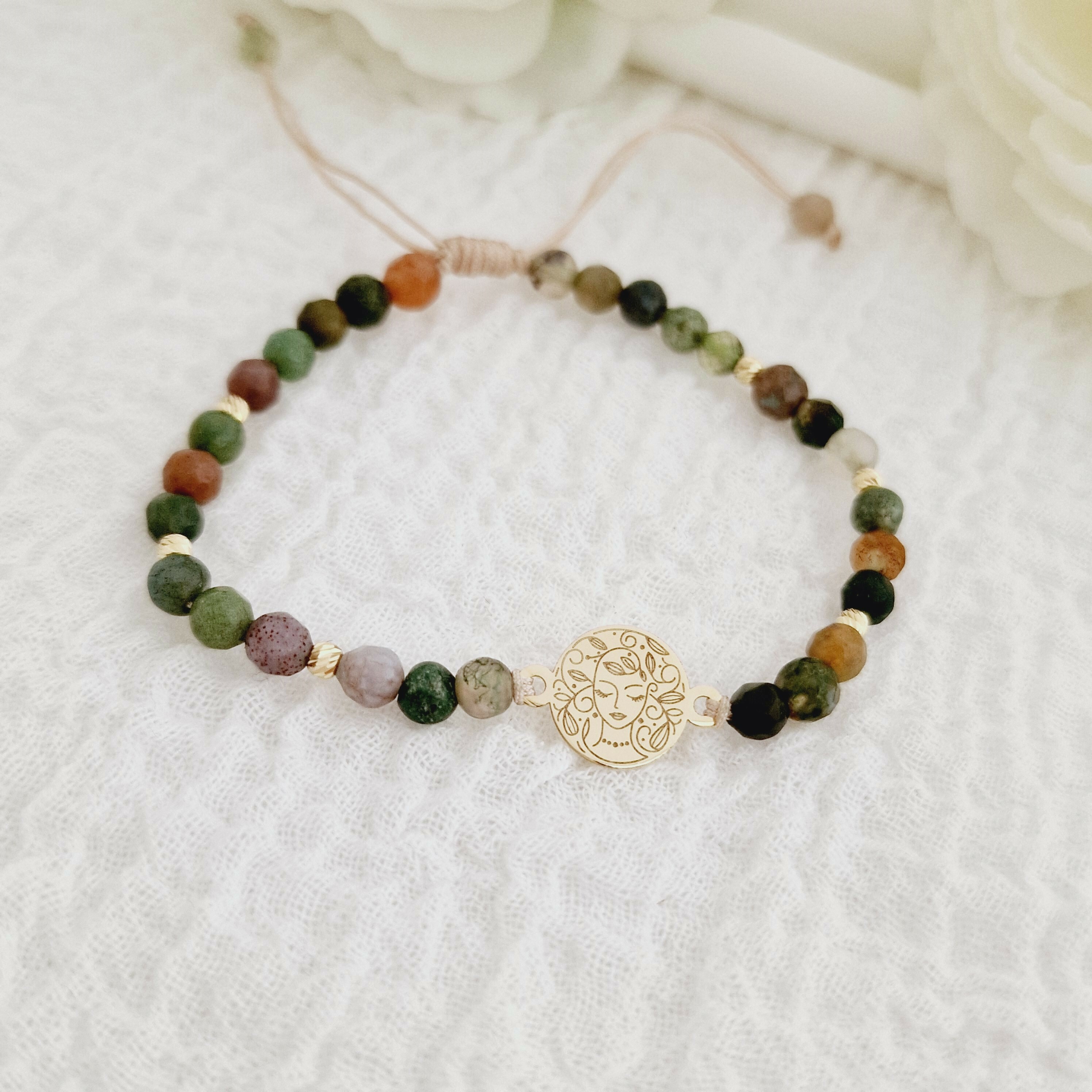 Această brățară cu un bănuț gravat înfățișând o femeie înconjurată de frunze delicate este completată de un șirag de pietre semiprețioase Agat fatetat, oferind o combinație subtilă între natură și feminitate. O piesă distinctivă ce emană mister și farmec, perfectă pentru a completa orice ținută cu un strop de eleganță și rafinament.
