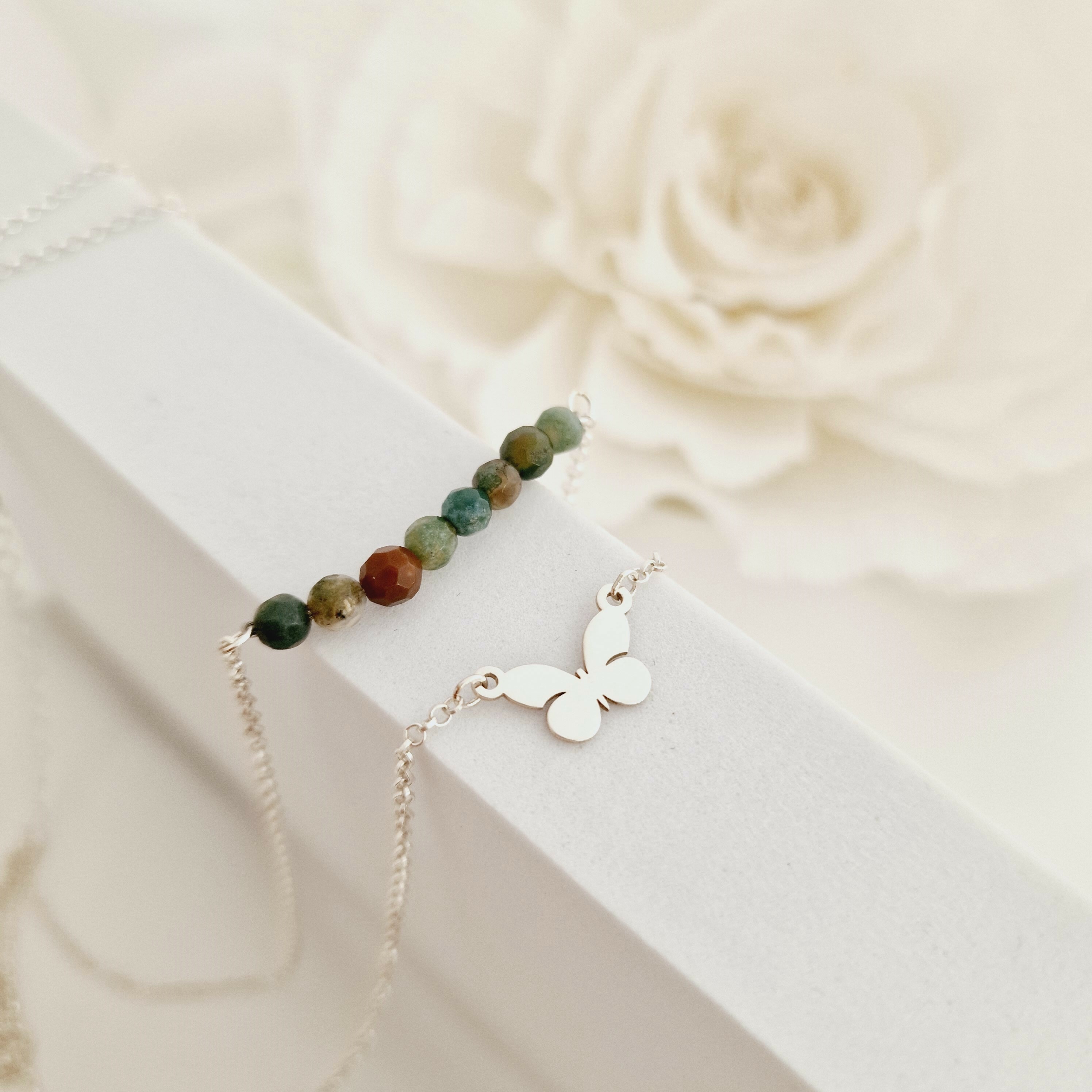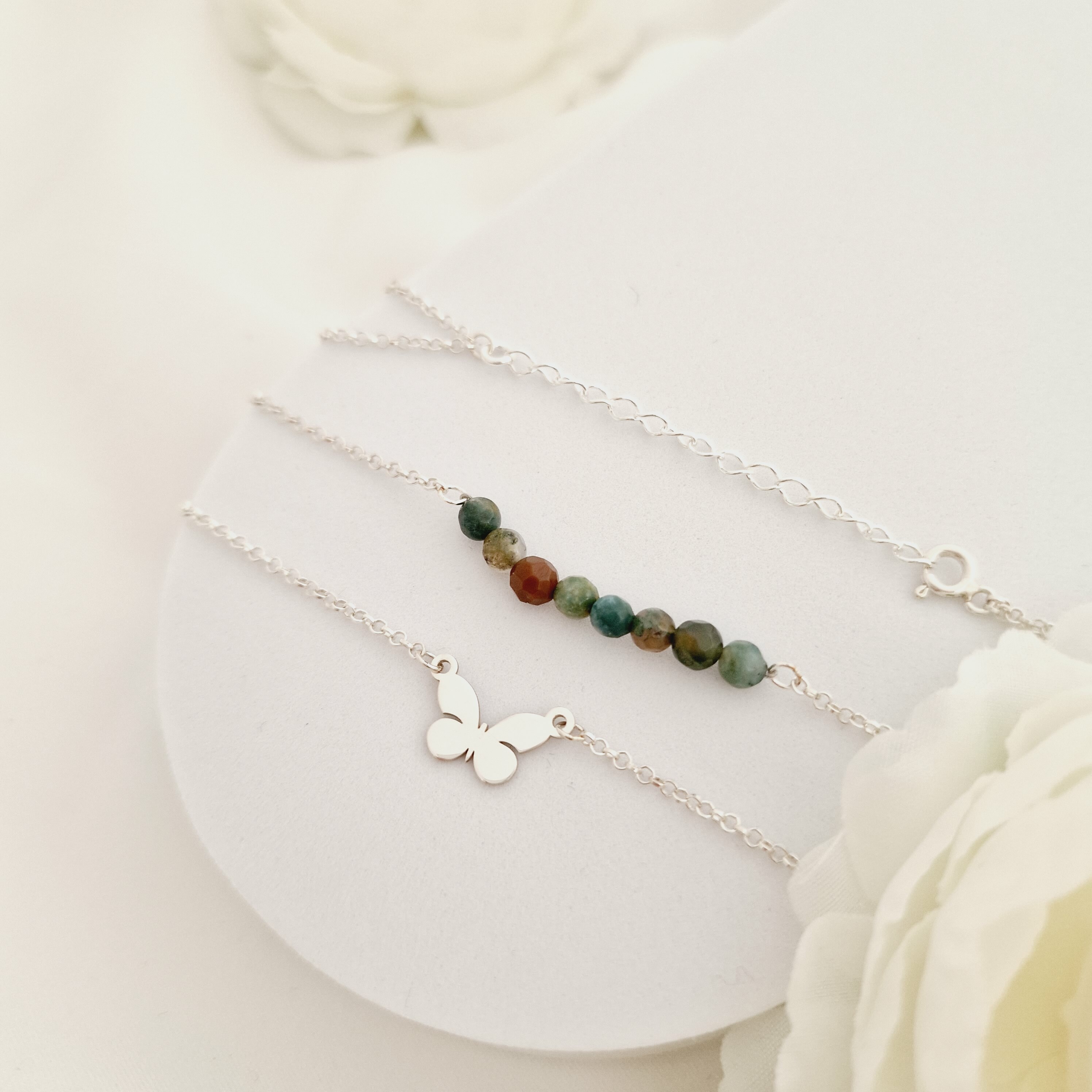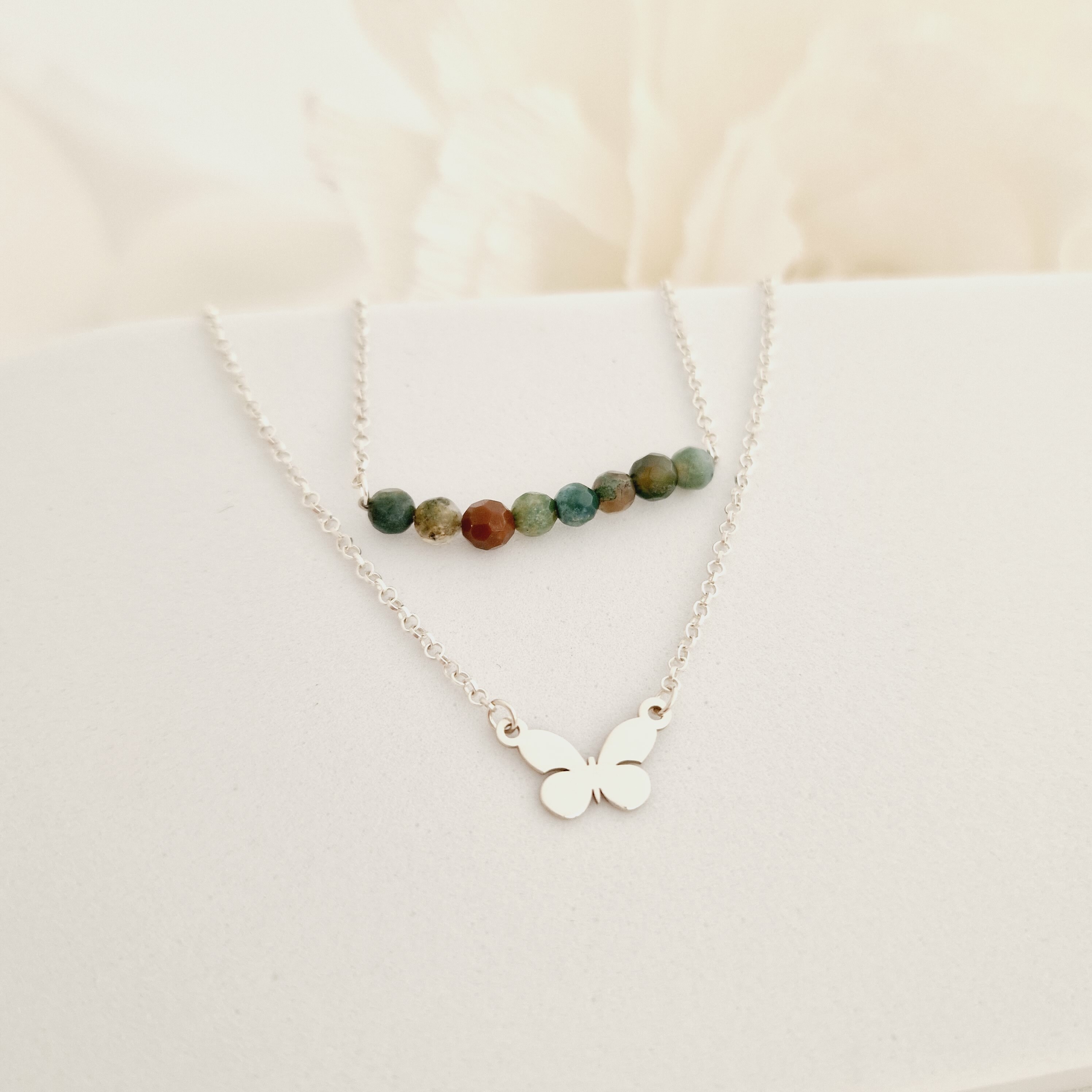 Lantisor Vitalitate - Eterna Transformare - Model 2 straturi cu pandantiv fluture si Pietre semiprețioase Agat - Argint 925