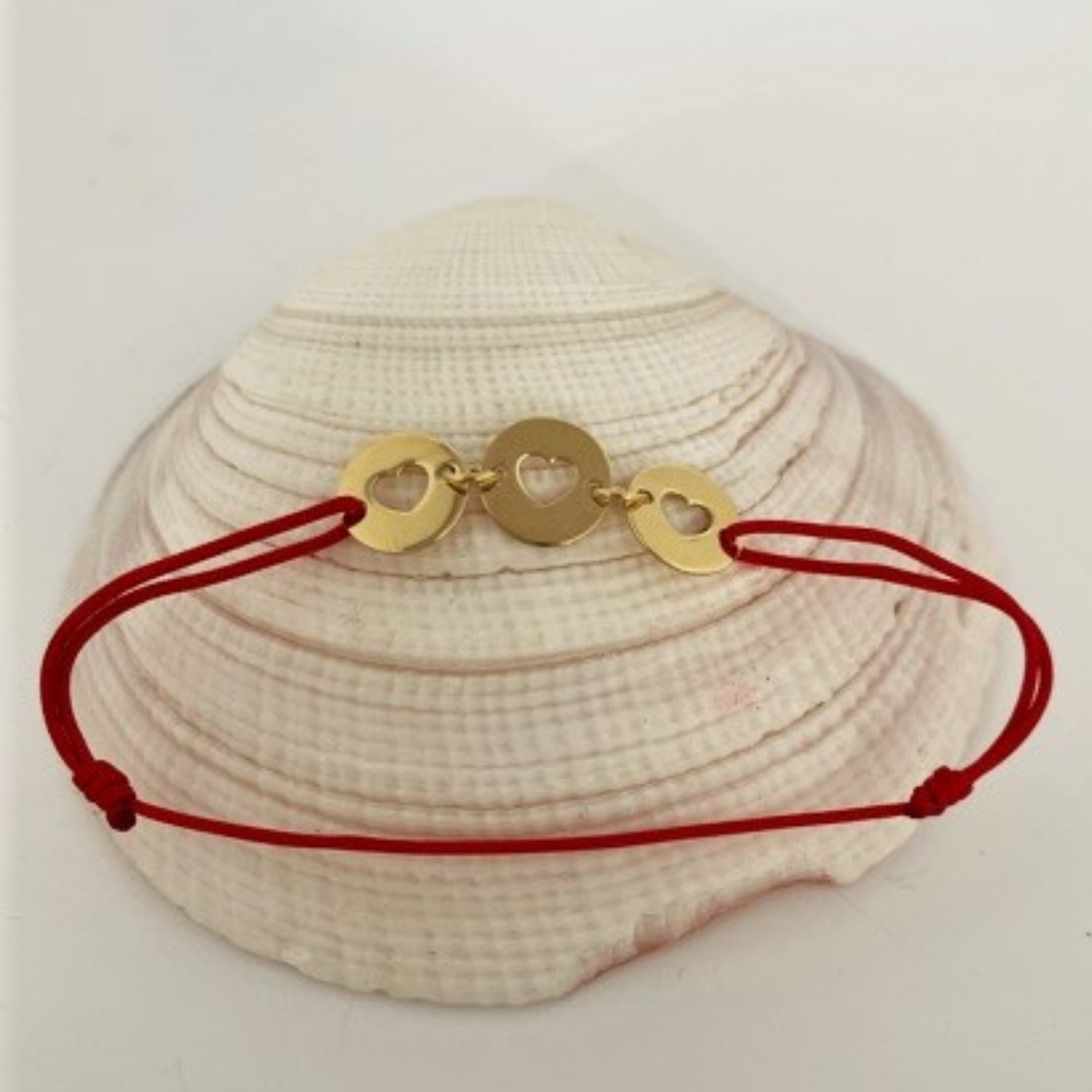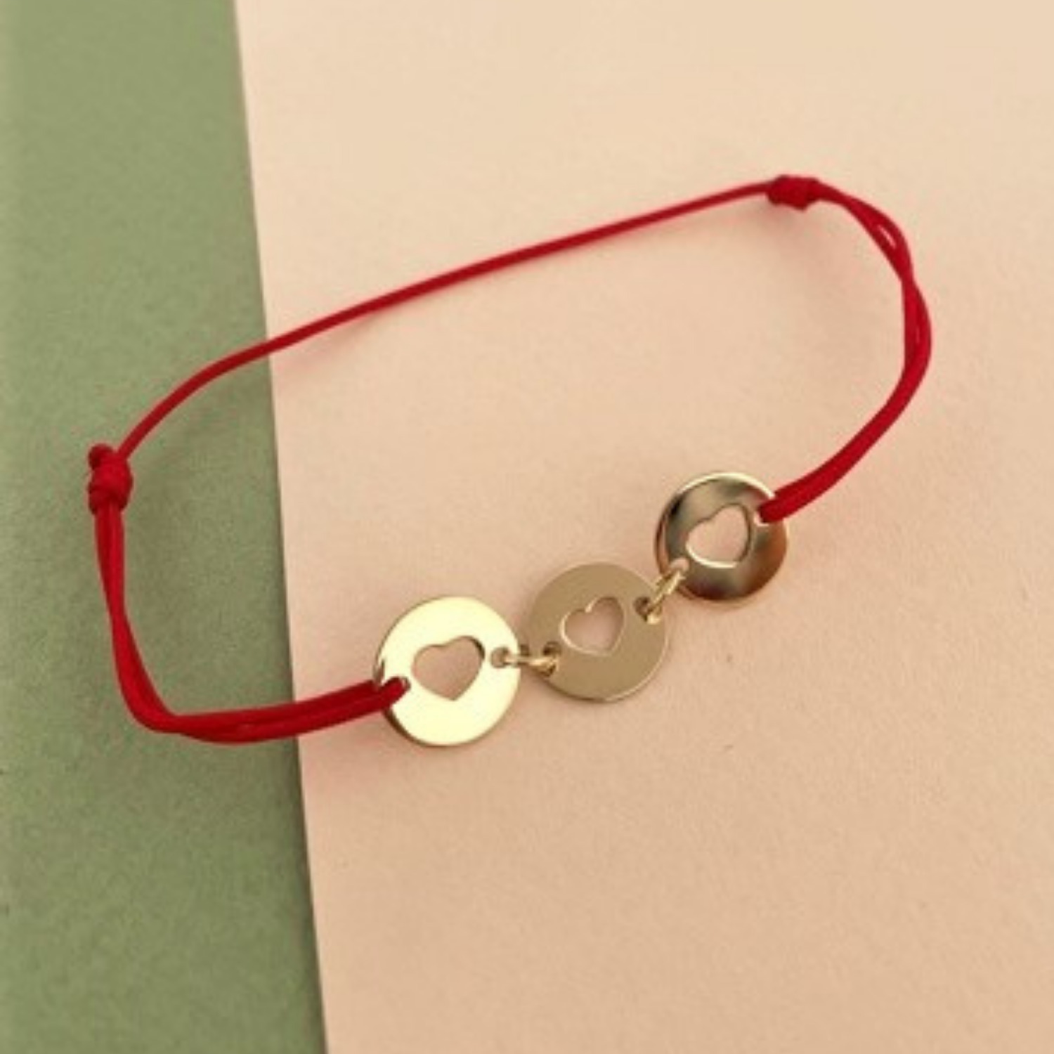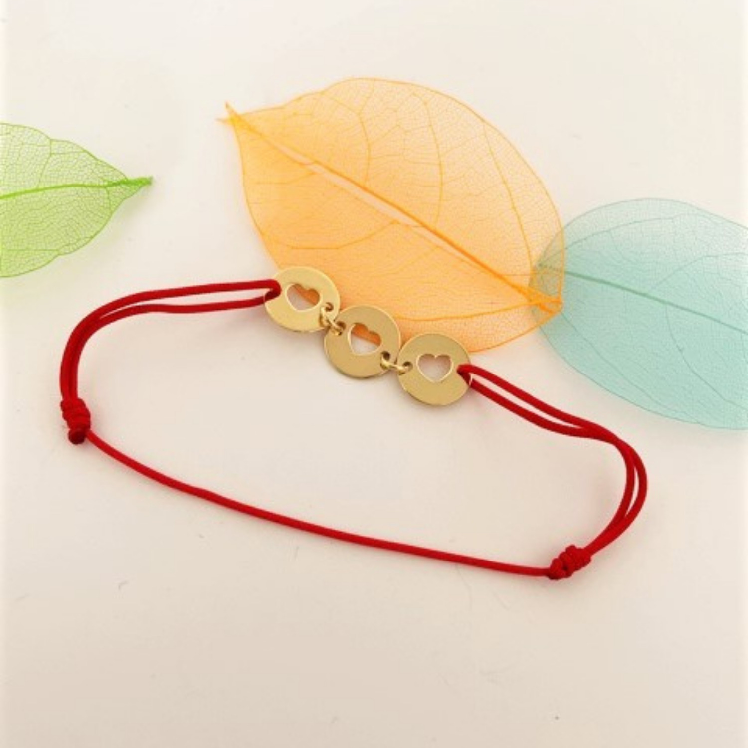 Bratara cu 3 banuti cu inima decupata - Argint 925 placat cu Aur Galben 18 K - Snur reglabil, diverse culori