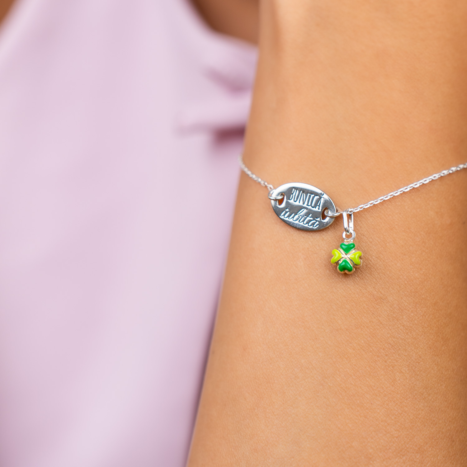 Această brățară elegantă din argint 925 se remarcă prin pandantivul oval, iar snurul reglabil asigură o potrivire perfectă pe orice mână. Cu un charm personalizat la alegere, brățara 'Femeie Iubită' devine un simbol al iubirii și aprecierii. Este un accesoriu subtil, dar plin de sentiment, ideal pentru a surprinde o persoană dragă.