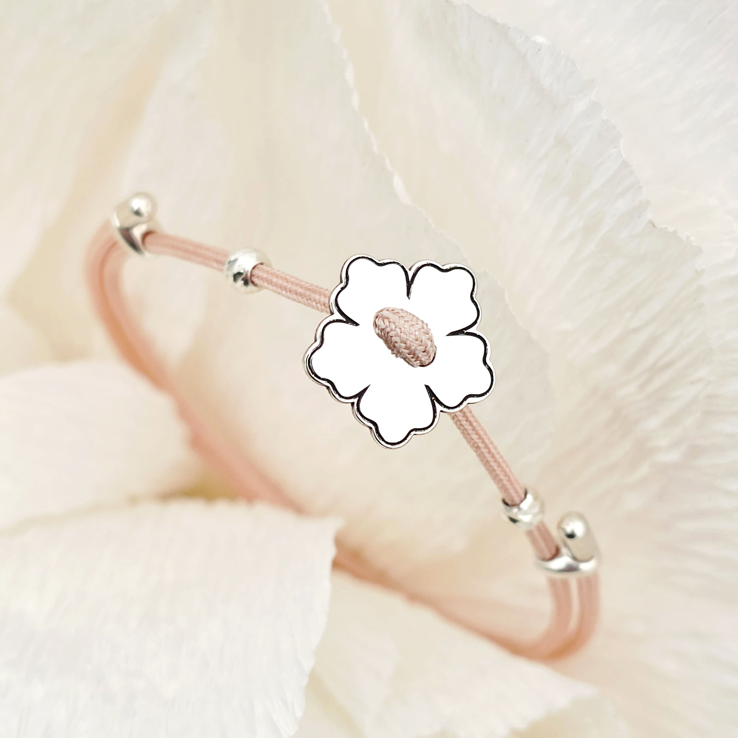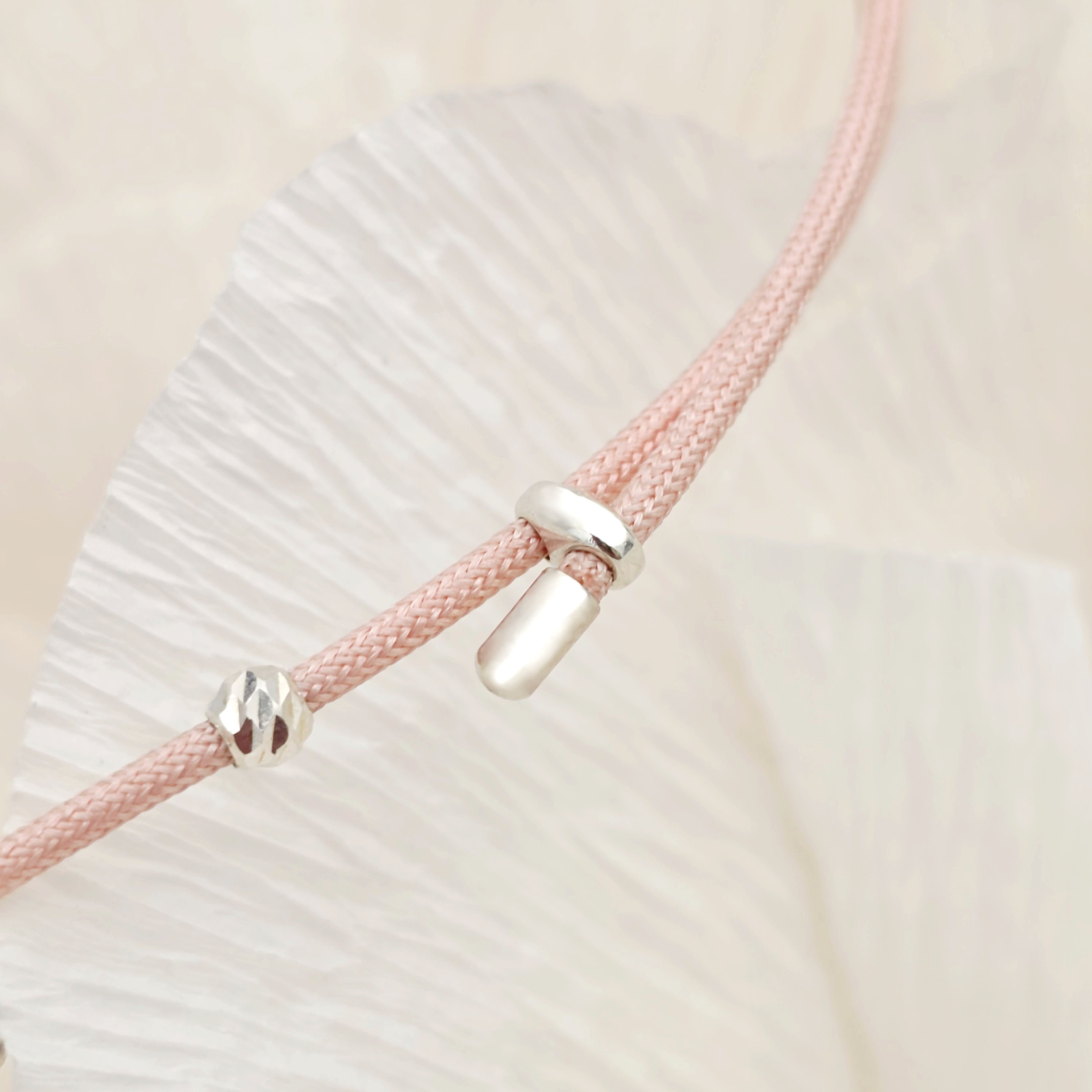 Brățara Floare cu 5 petale - Șnur roz Gros si 2 bilute - Argint 925