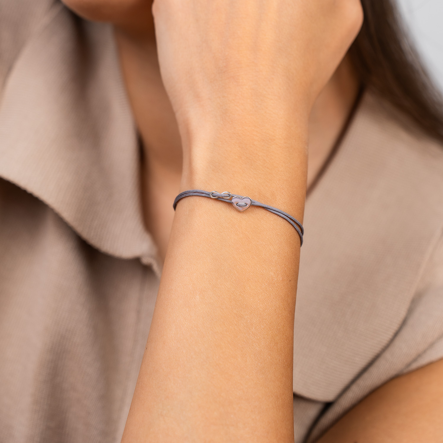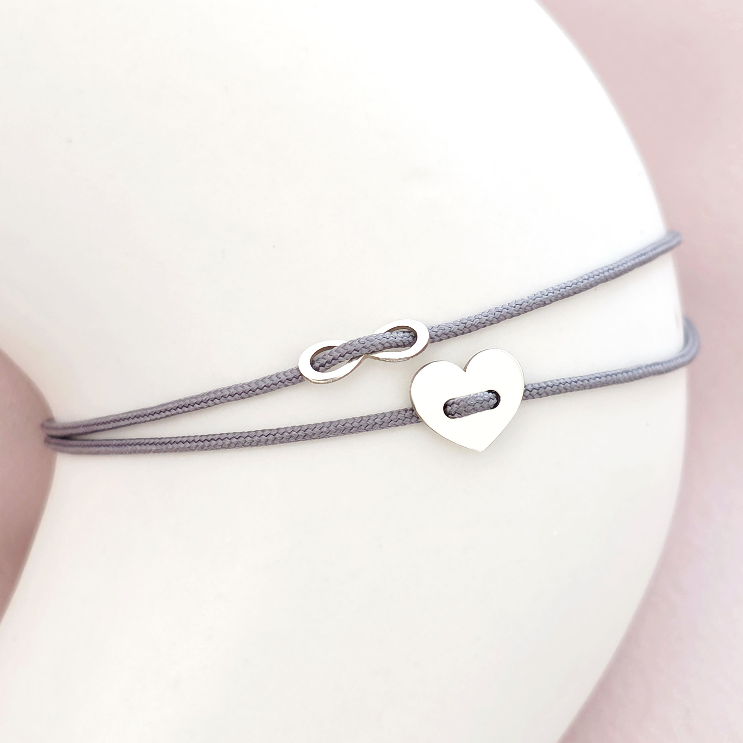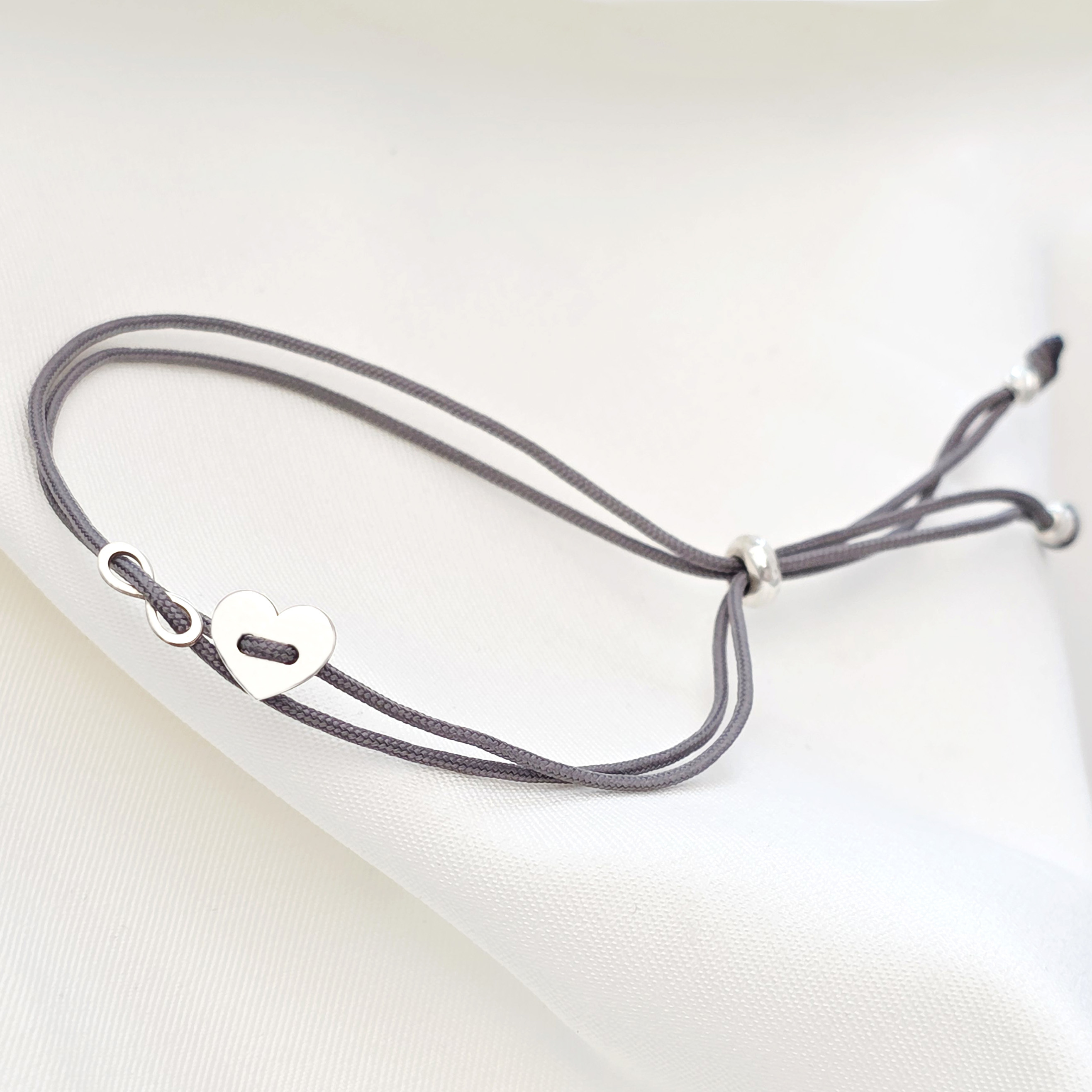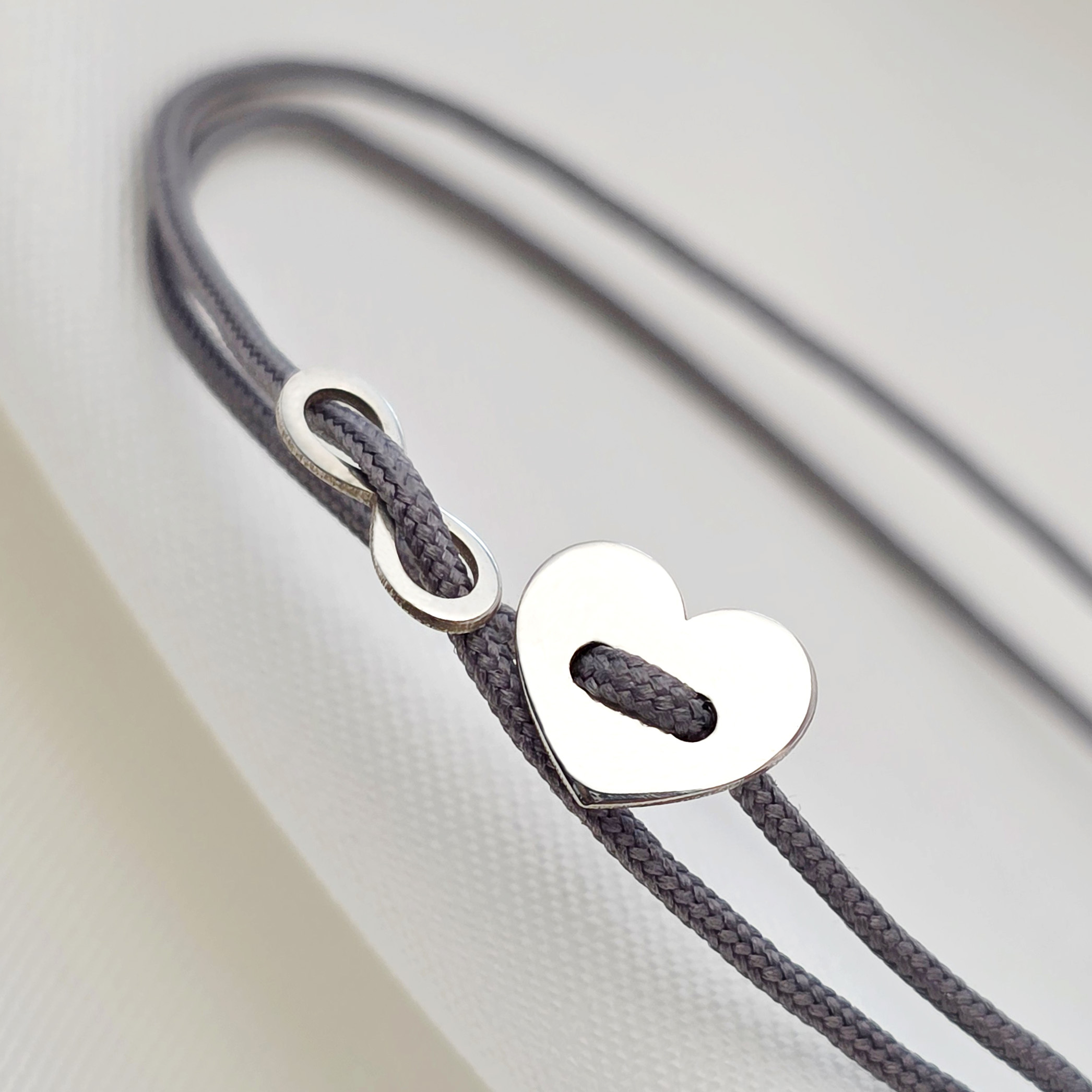Bratara cu snur glisanta - Inima si infinit tip nasture - Argint 925