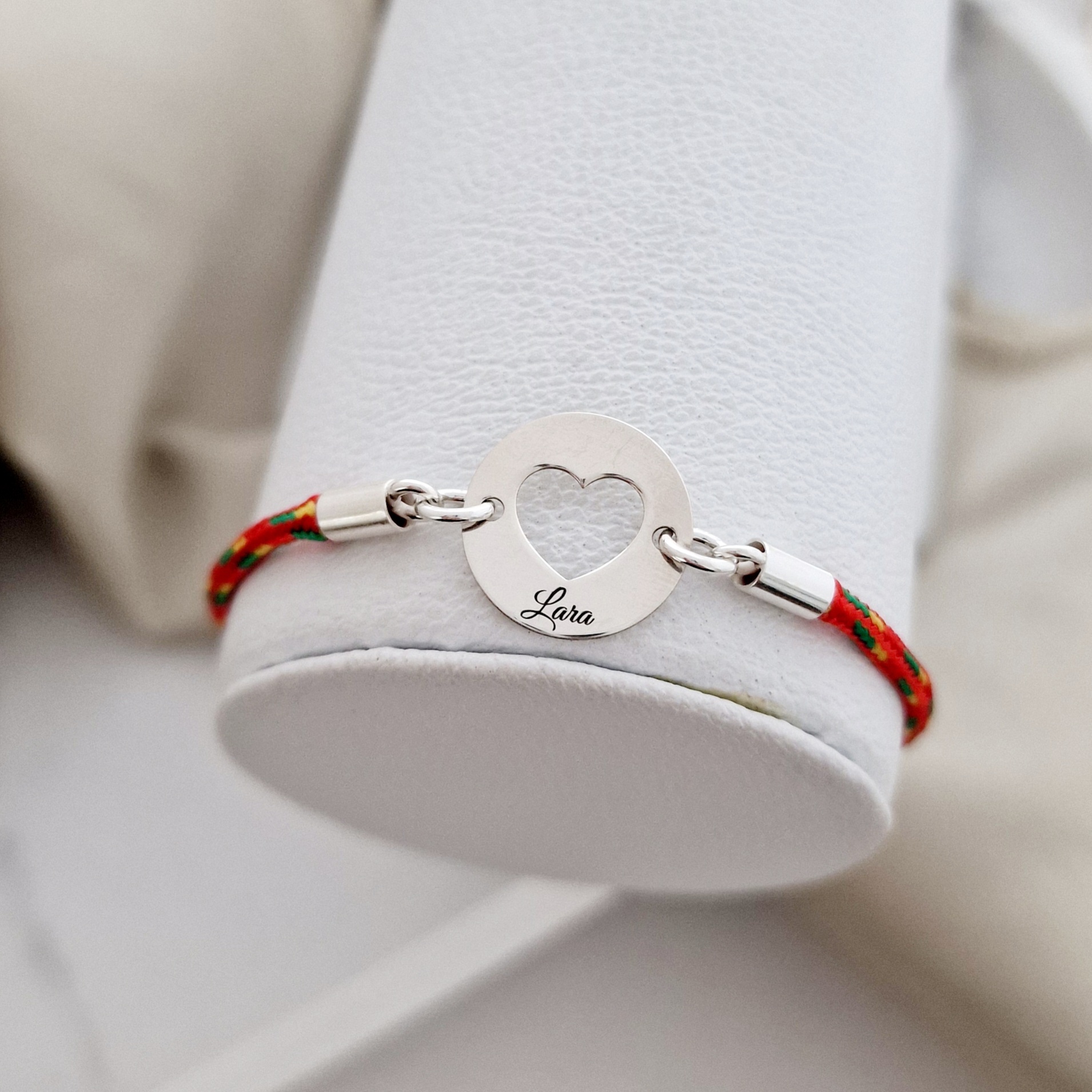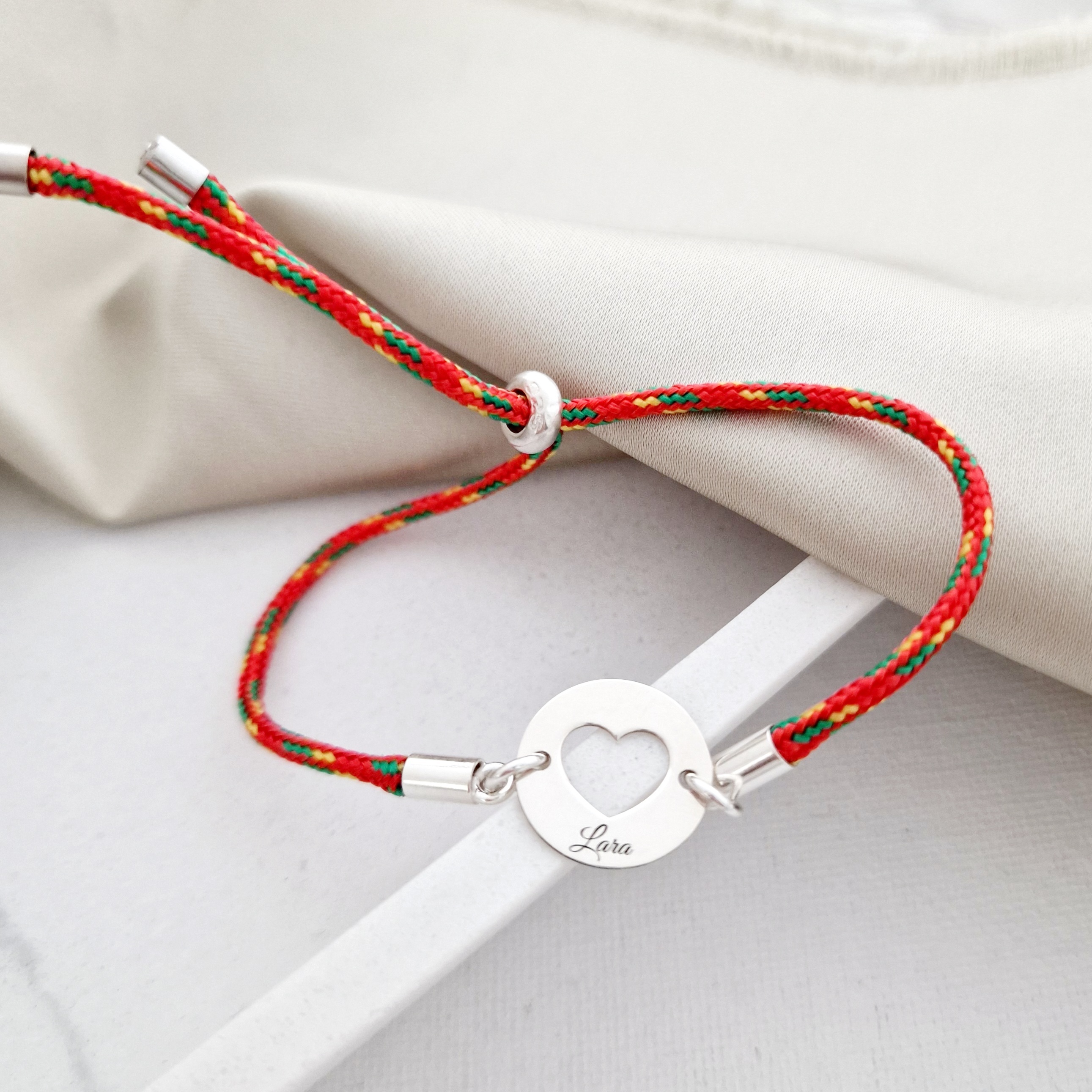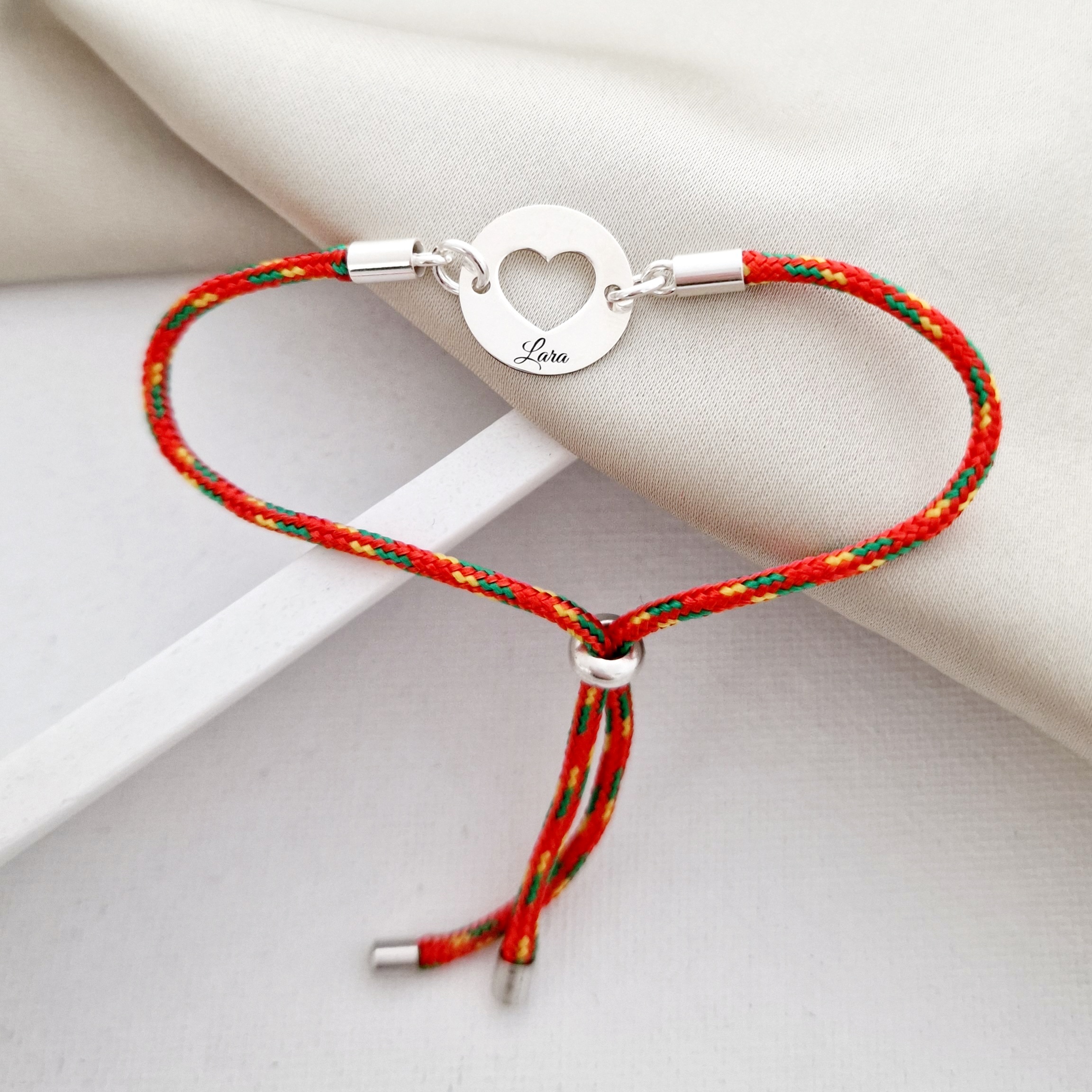 Bratara personalizata - Banut 15 mm cu inima decupata - Argint 925 - Snur 2 mm paracord, colorat si reglabil