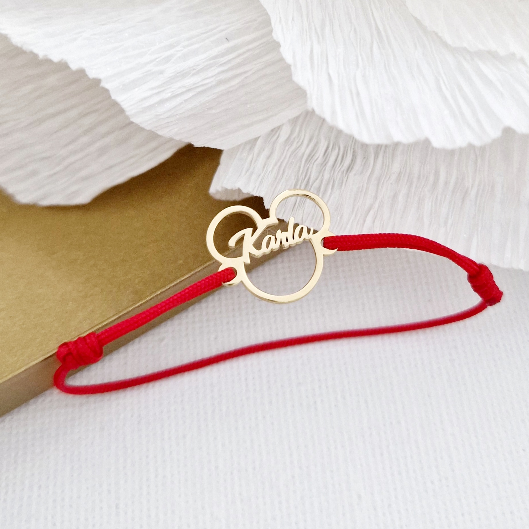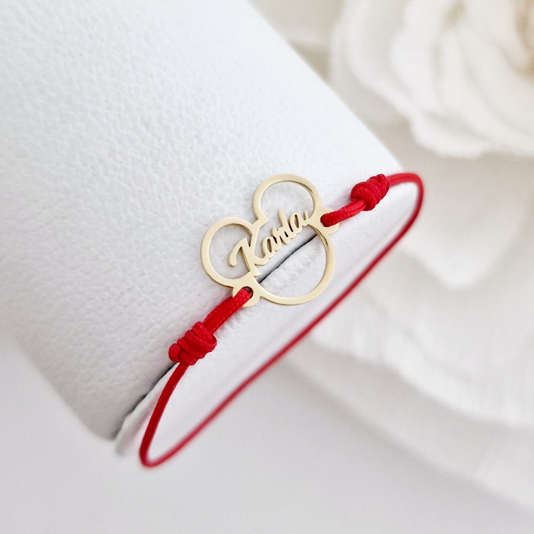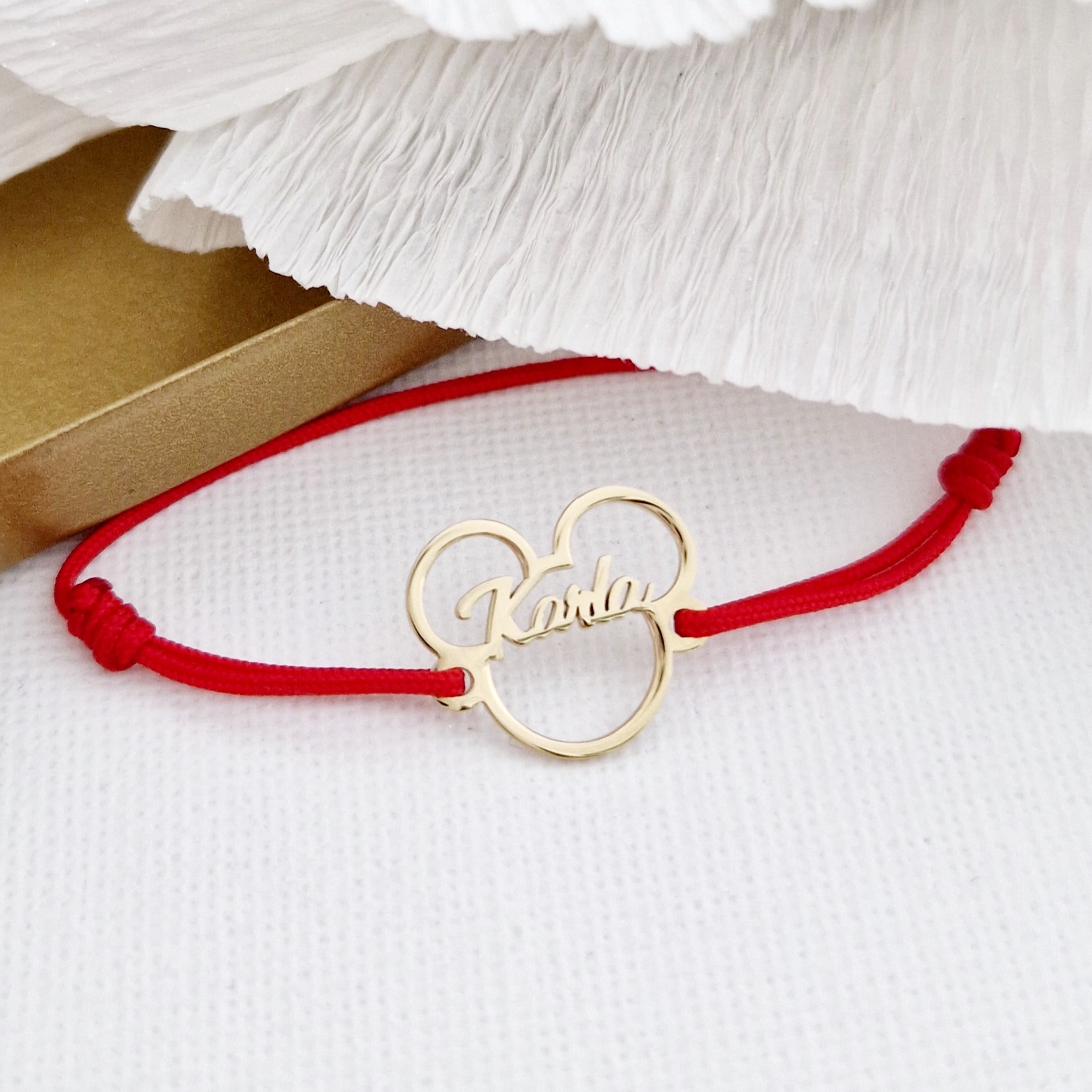 Bratara personalizata cu nume - Forma Soricel - Argint 925 placat cu Aur Galben 18K - Snur reglabil, diverse culori
