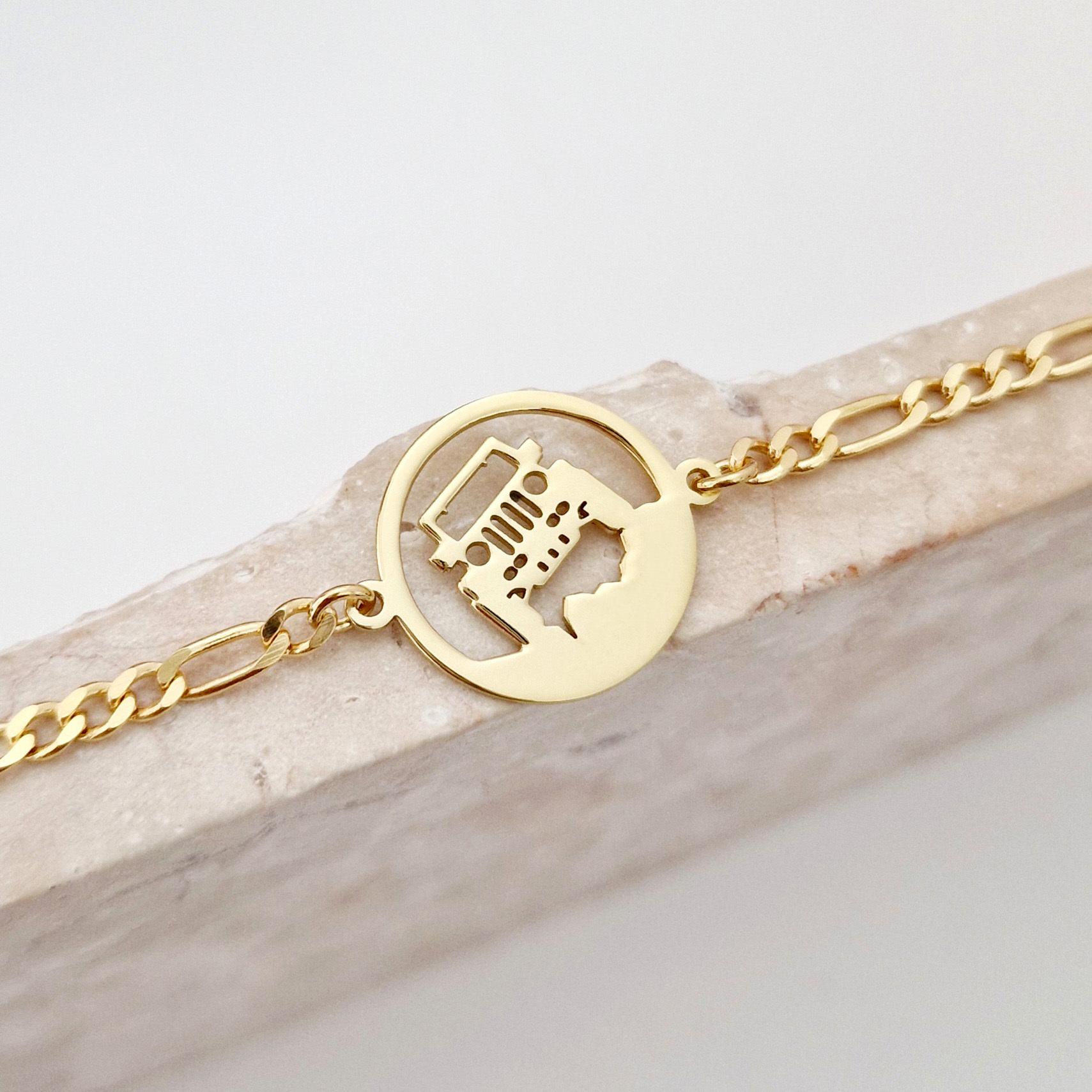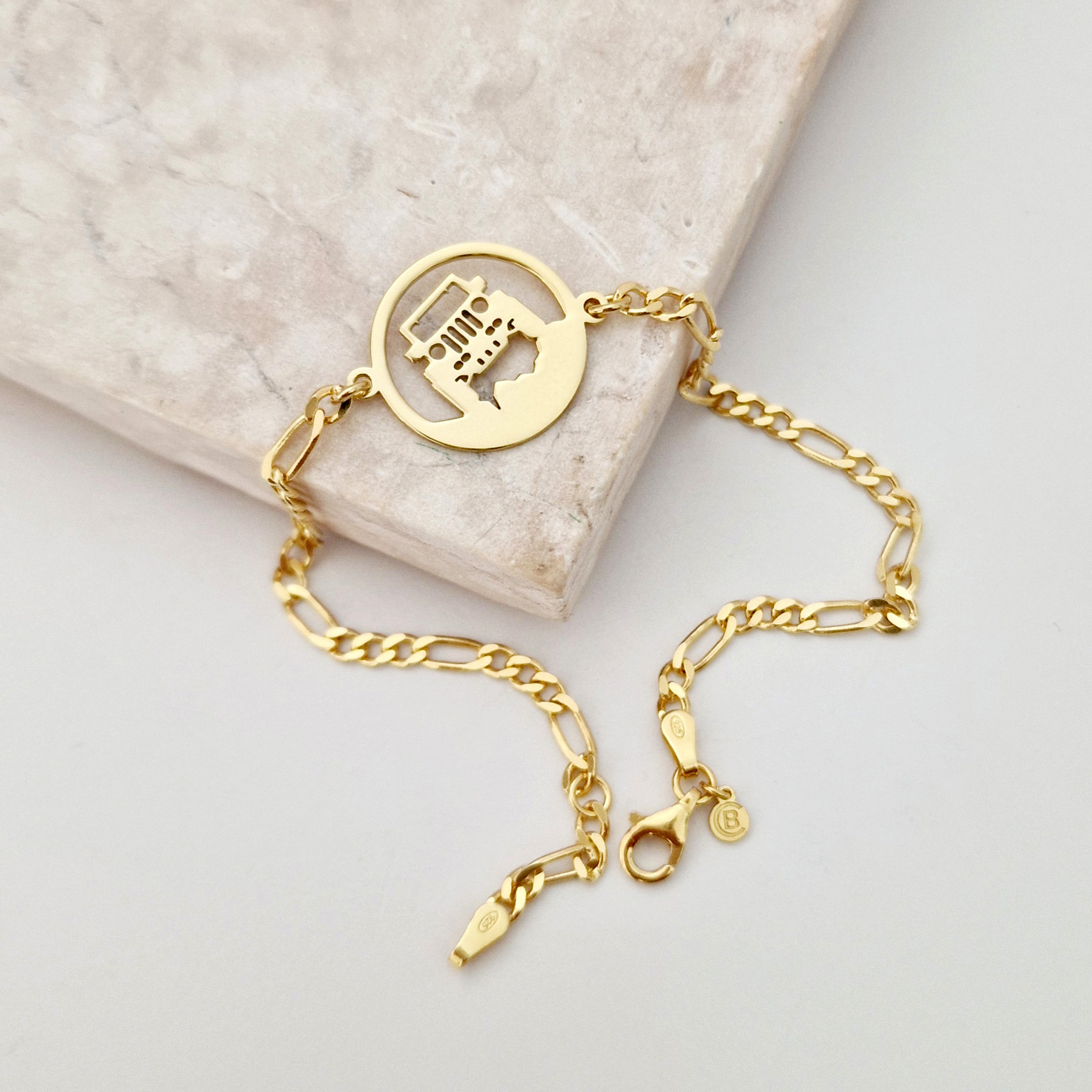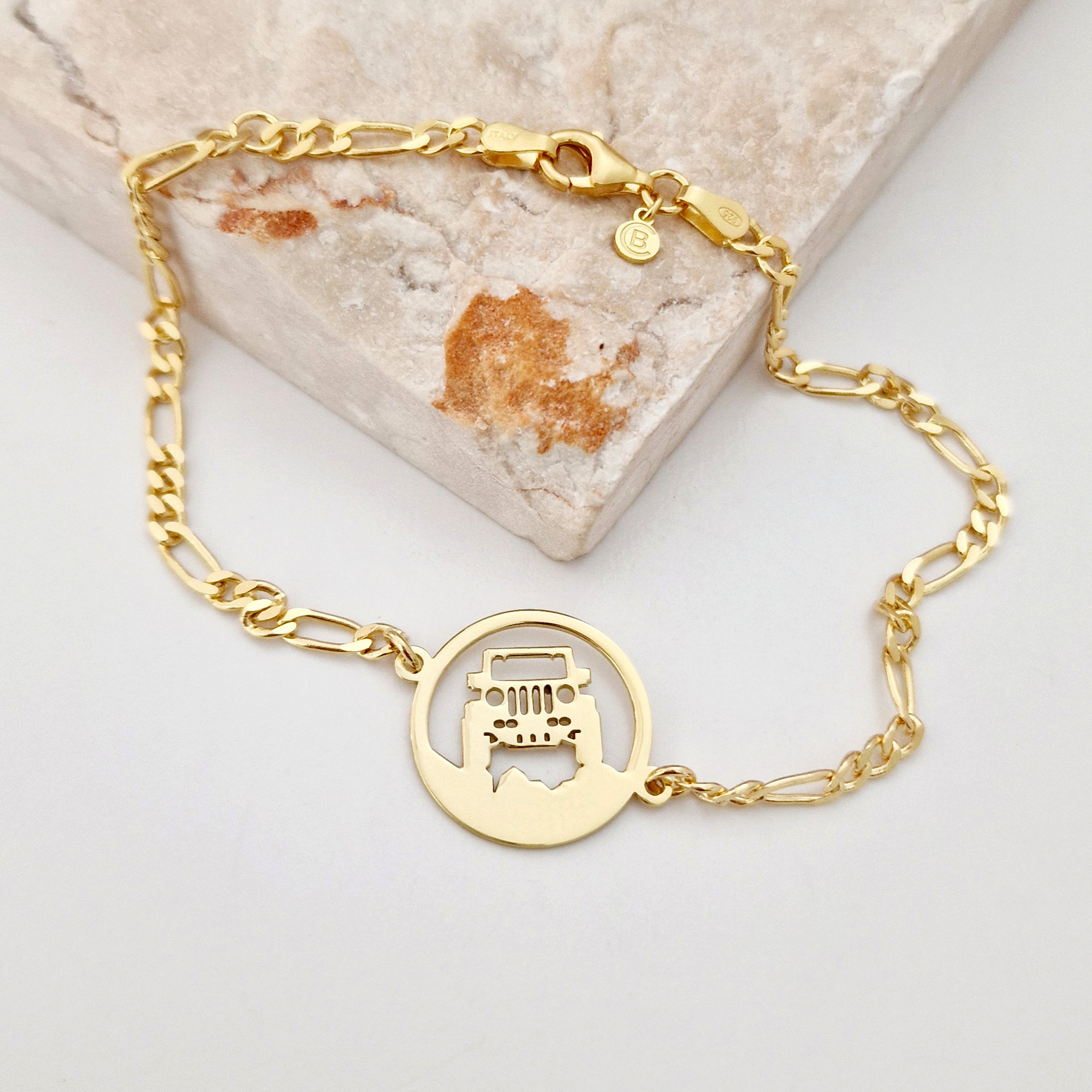 Această brățară pentru bărbați este realizată din Argint 925, placată cu Aur Galben de 18K, oferind un echilibru perfect între rafinament și spirit liber. Discul central este decupat cu simbolul unei mașini off-road, ideal pentru cei care iubesc explorarea și adrenalina. Designul masculin cu lanț adaugă un plus de stil și personalitate fiecărei ținute.
