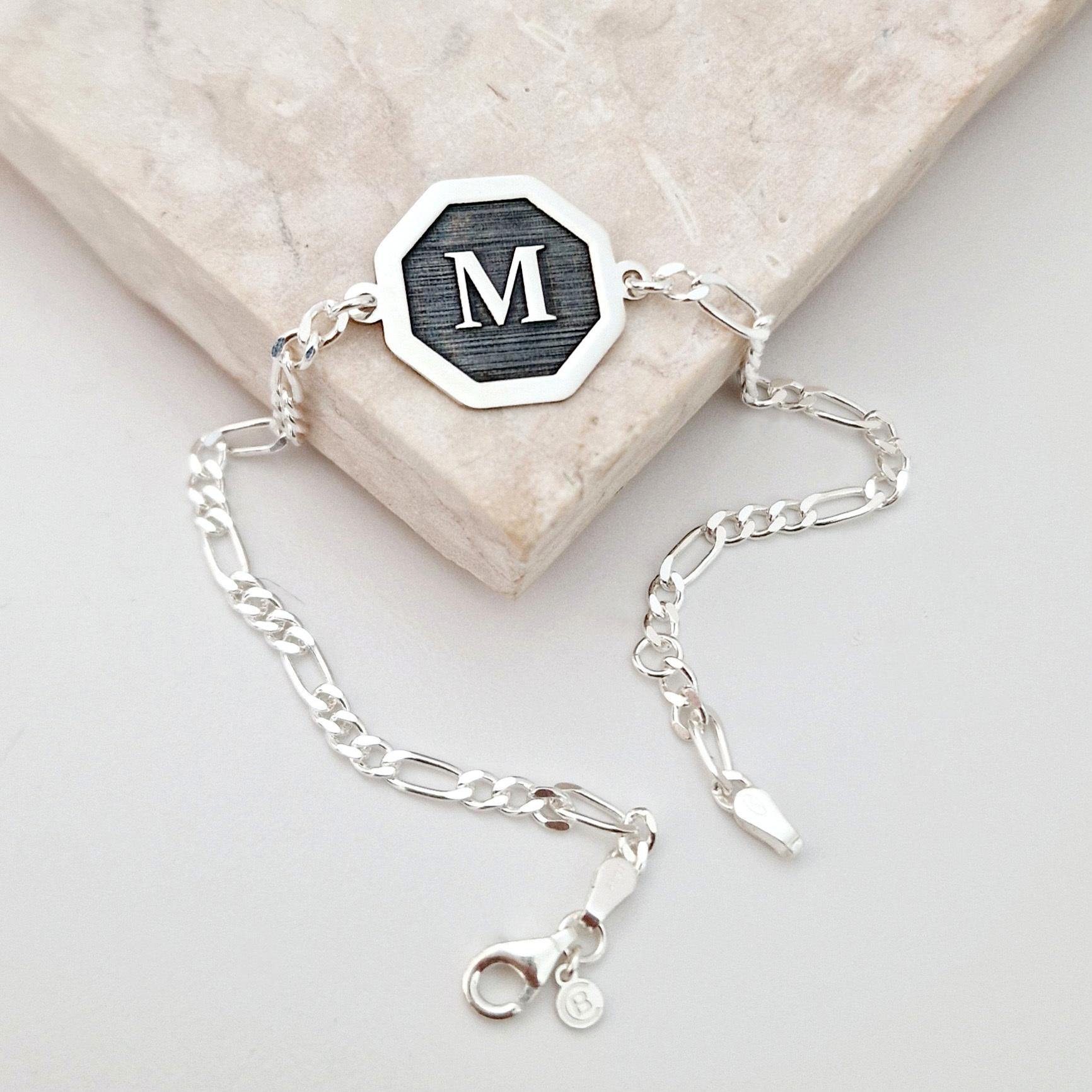 Această brățară pentru bărbați este realizată din Argint 925 de înaltă calitate, având un design octagonal modern. Elementul central este personalizat cu inițiala ta gravată în relief, oferind o notă distinctivă și elegantă. Lanțul rezistent completează perfect look-ul masculin și rafinat.