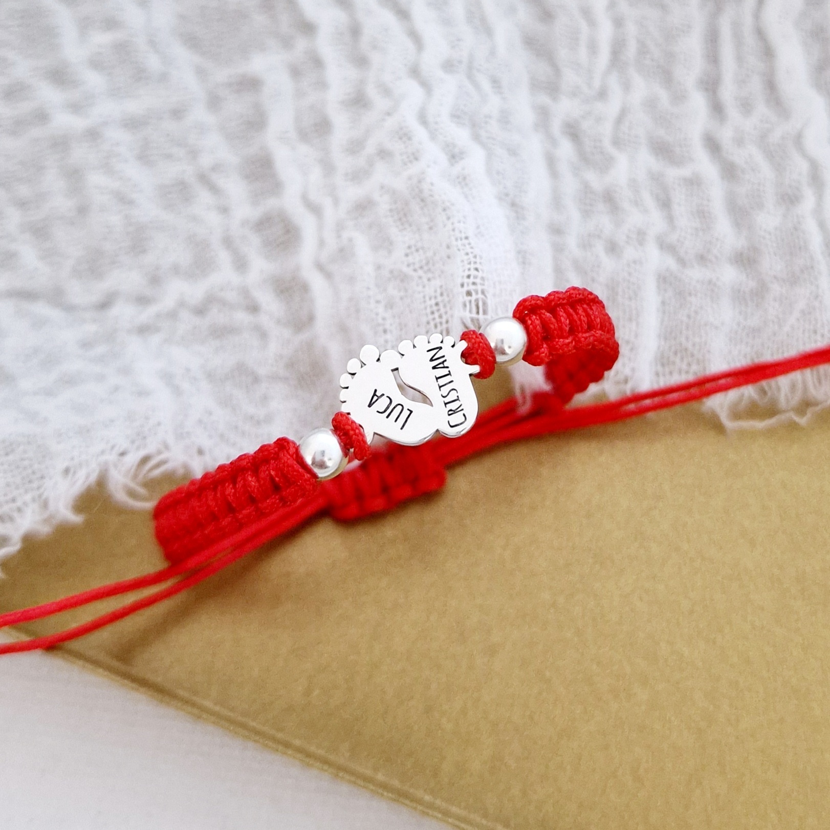 Bratara personalizata - Picioruse cu 2 bilute 4 mm - Argint 925 - Snur impletit reglabil