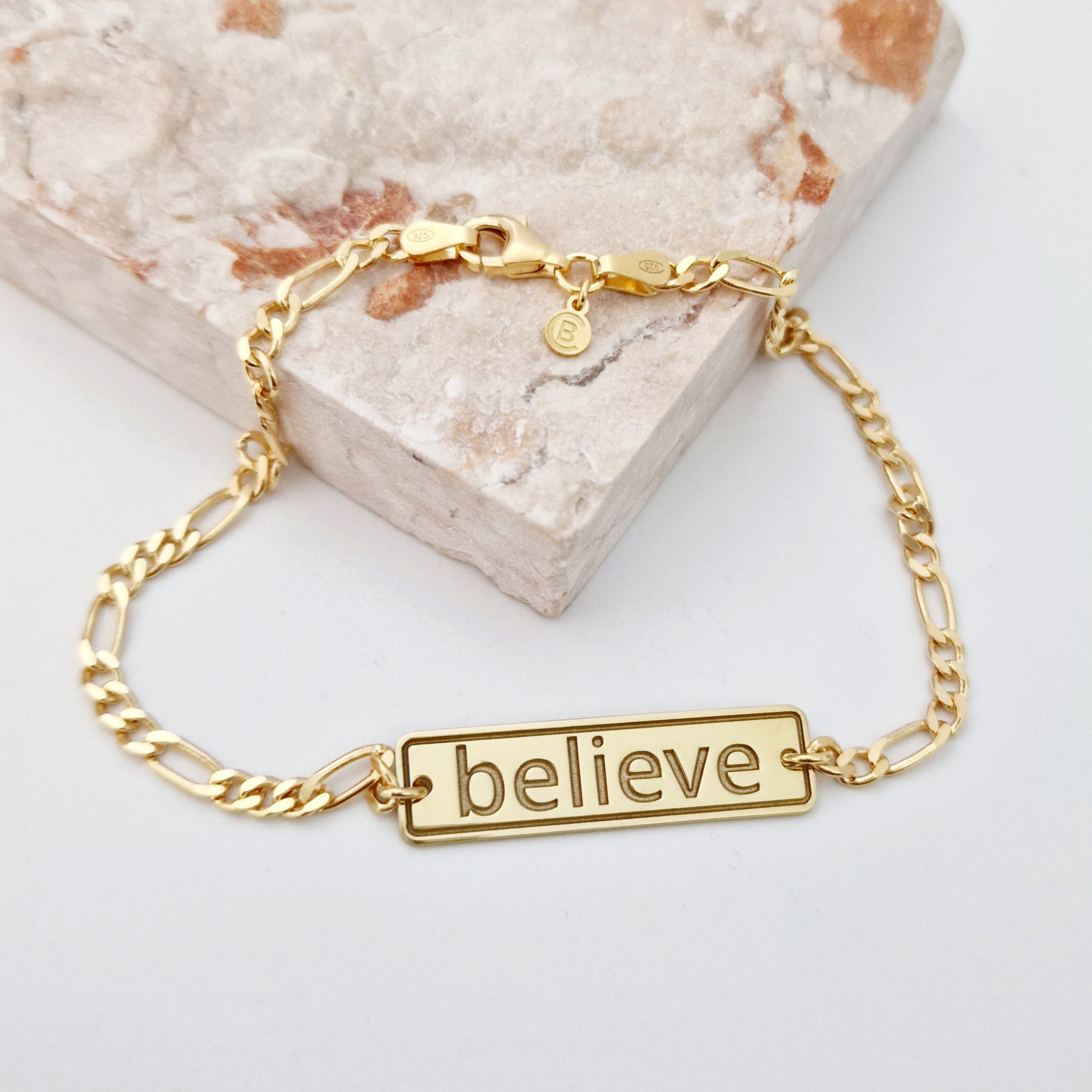 Această brățară din Argint 925 placat cu Aur Galben 18K este mai mult decât un accesoriu – este o declarație personală. Plăcuța gravată cu textul „Believe” transmite forță, încredere și motivație. Cu un lanț masculin, robust și rafinat, această bijuterie este perfectă pentru cei care își urmează visurile.
