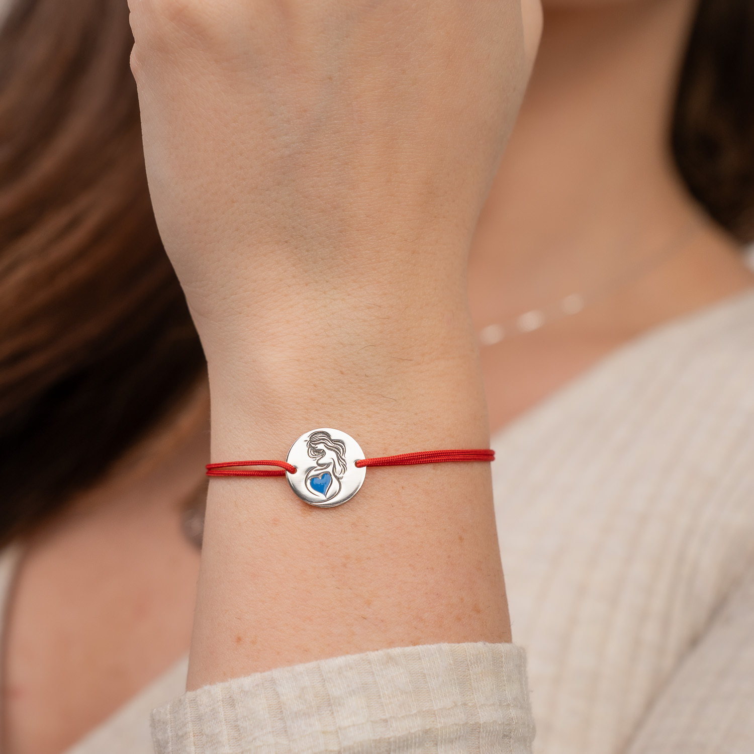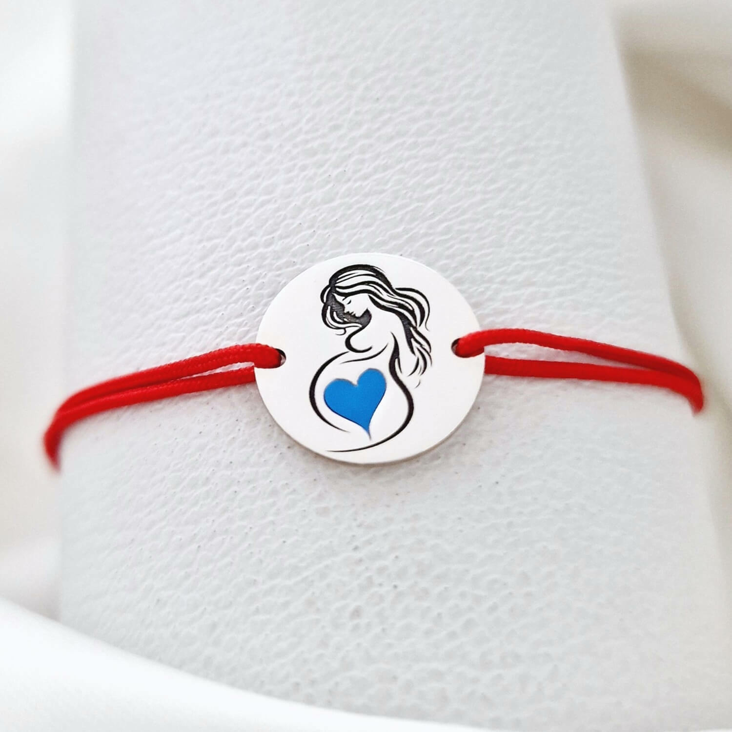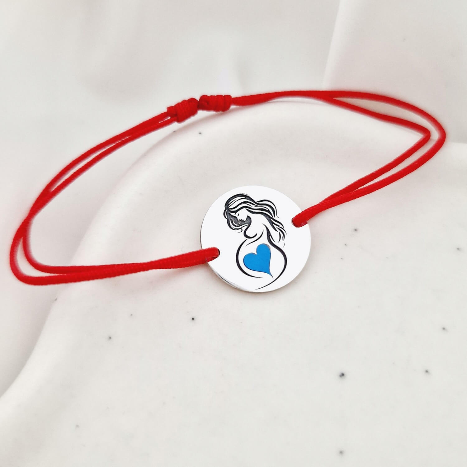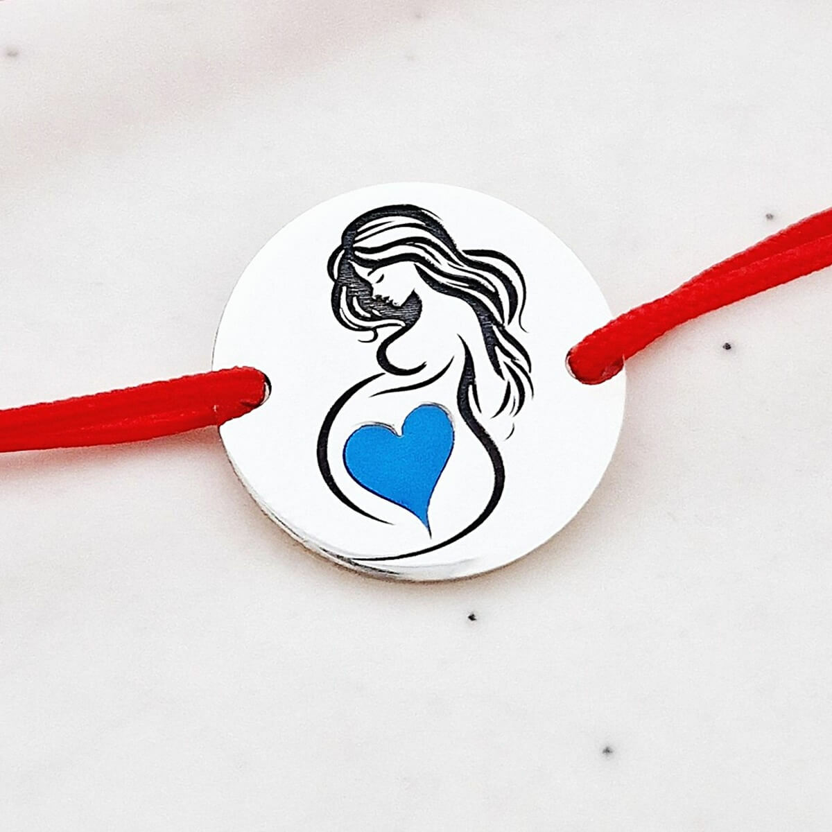 Aceasta bratara delicata este realizata dintr-un banut de Argint 925 cu diametrul de 15 mm, ilustrand silueta unei viitoare mamici cu o inimioara care simbolizeaza bebelusul din burtica, decorata cu email albastru. Snurul din matase naturala este reglabil, oferind confort si eleganta pentru orice dimensiune a incheieturii. Designul plin de sensibilitate face din aceasta bratara un cadou perfect pentru viitoarele mamici.