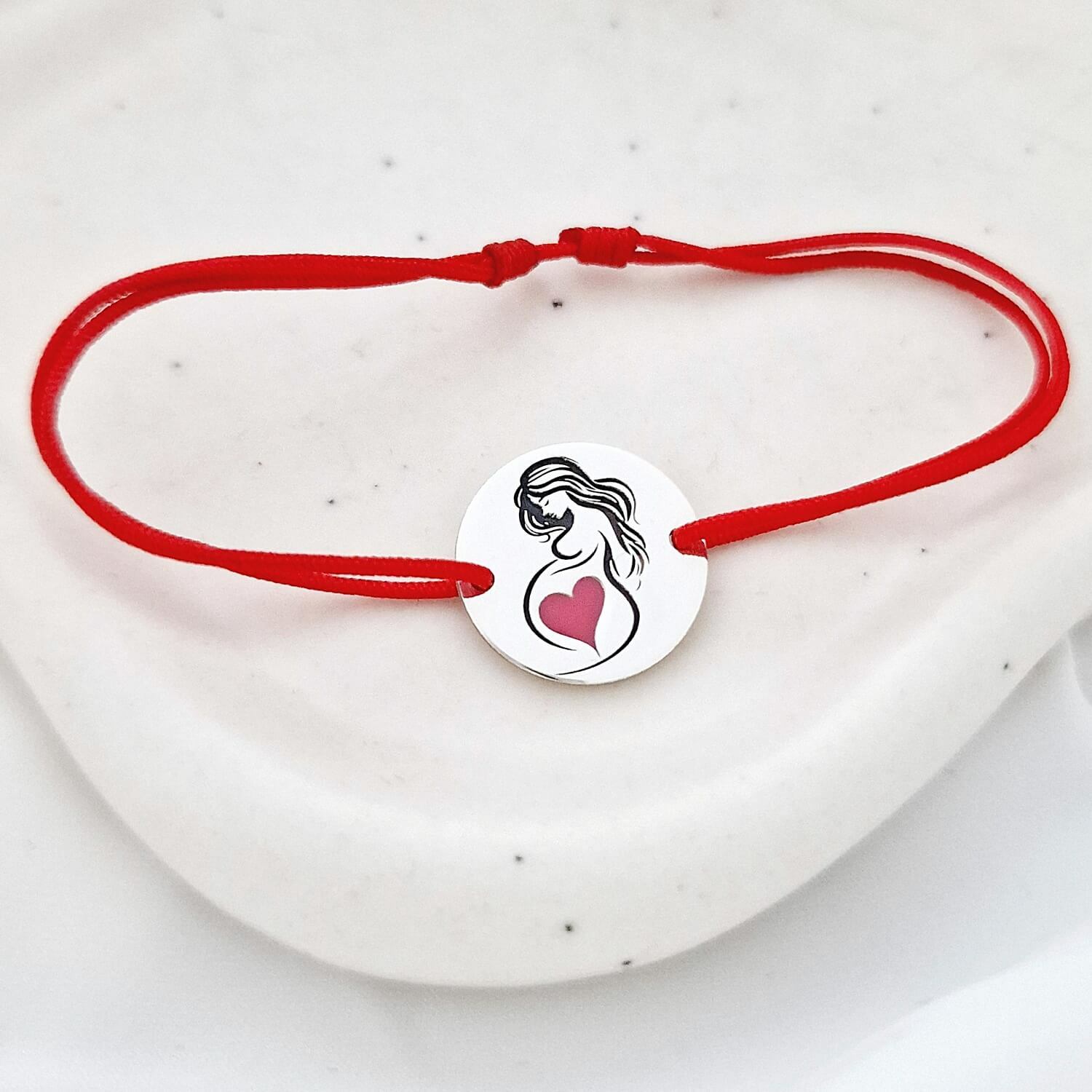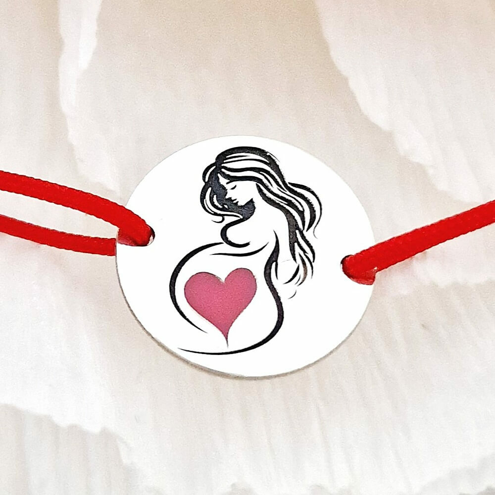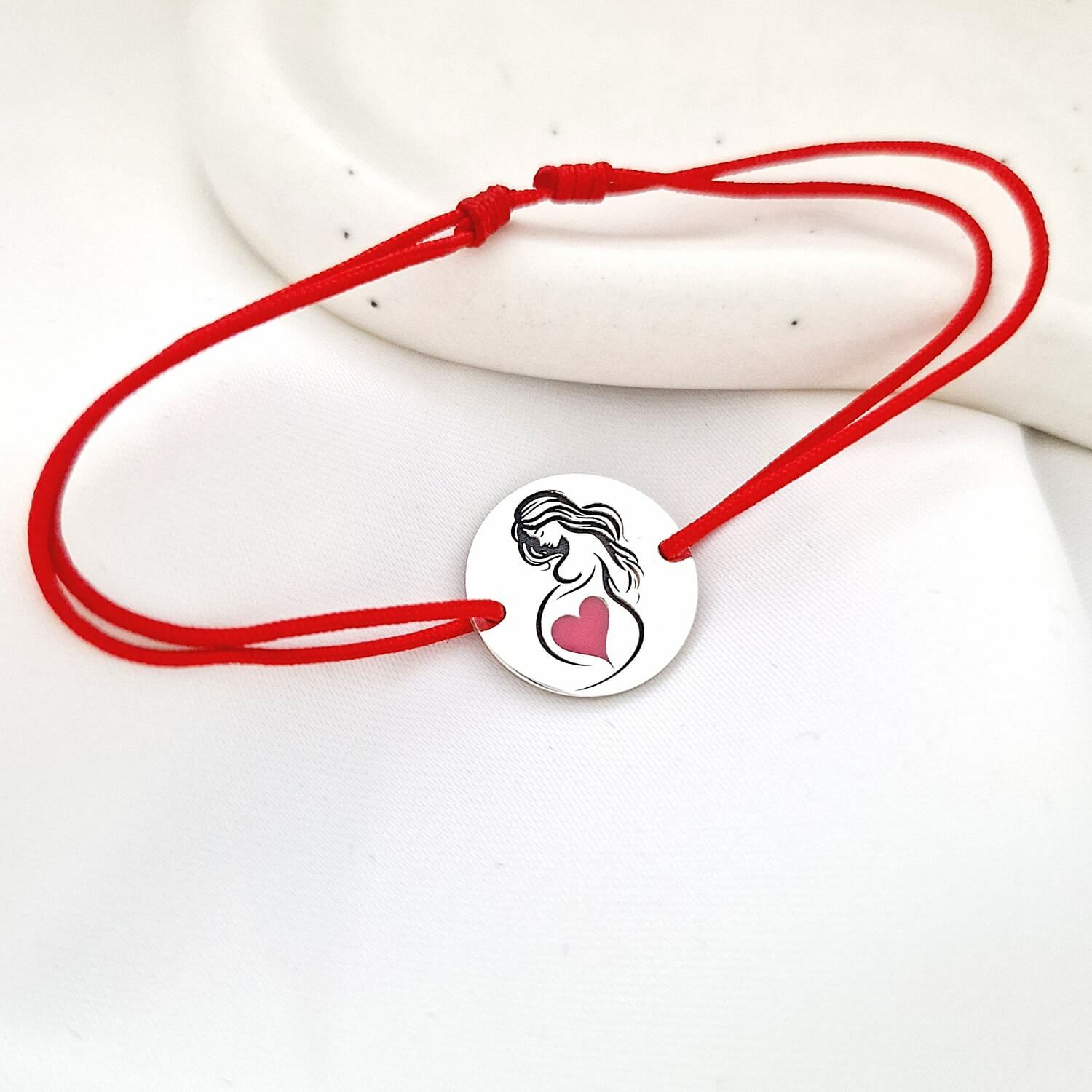Aceasta bratara delicata este realizata dintr-un banut de Argint 925 cu diametrul de 15 mm, ilustrand silueta unei viitoare mamici cu o inimioara care simbolizeaza bebelusul din burtica, decorata cu email roz. Snurul din matase naturala este reglabil, oferind confort si eleganta pentru orice dimensiune a incheieturii. Designul plin de sensibilitate face din aceasta bratara un cadou perfect pentru viitoarele mamici.